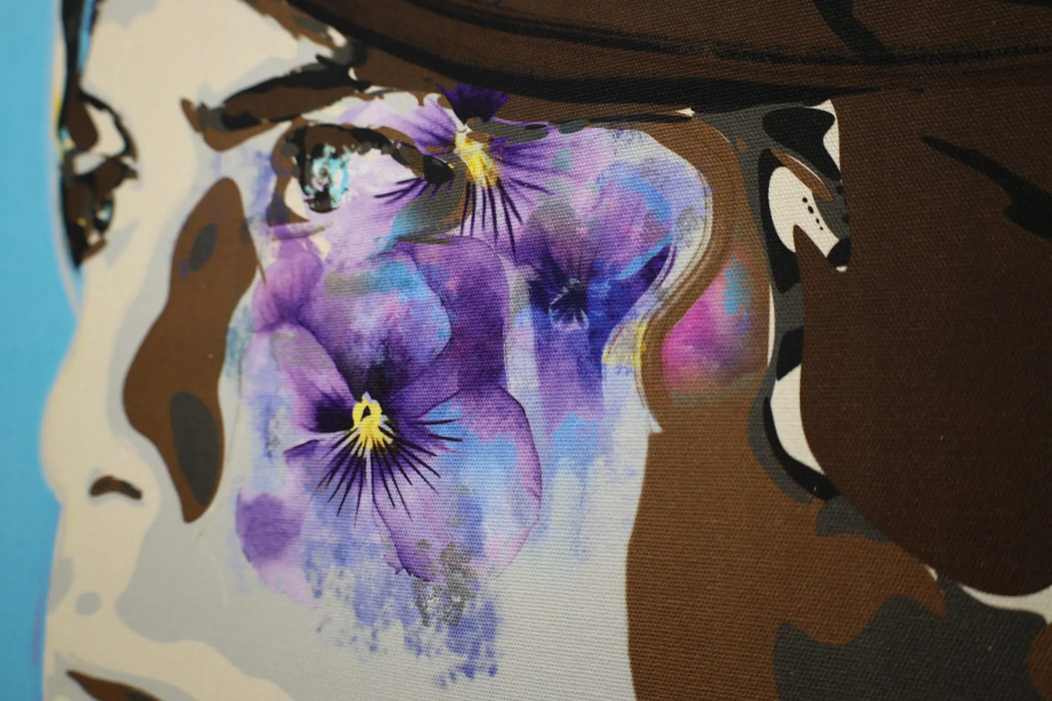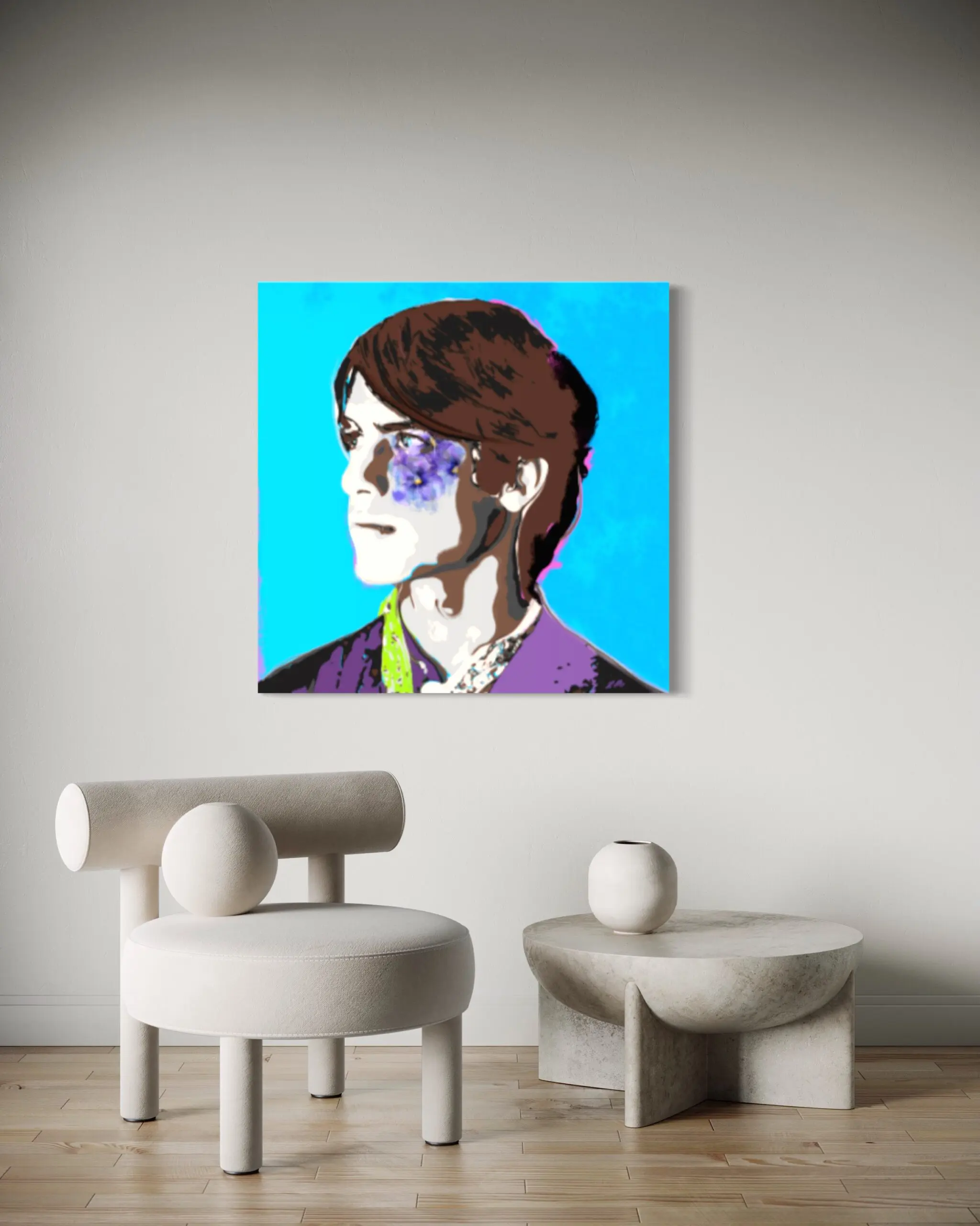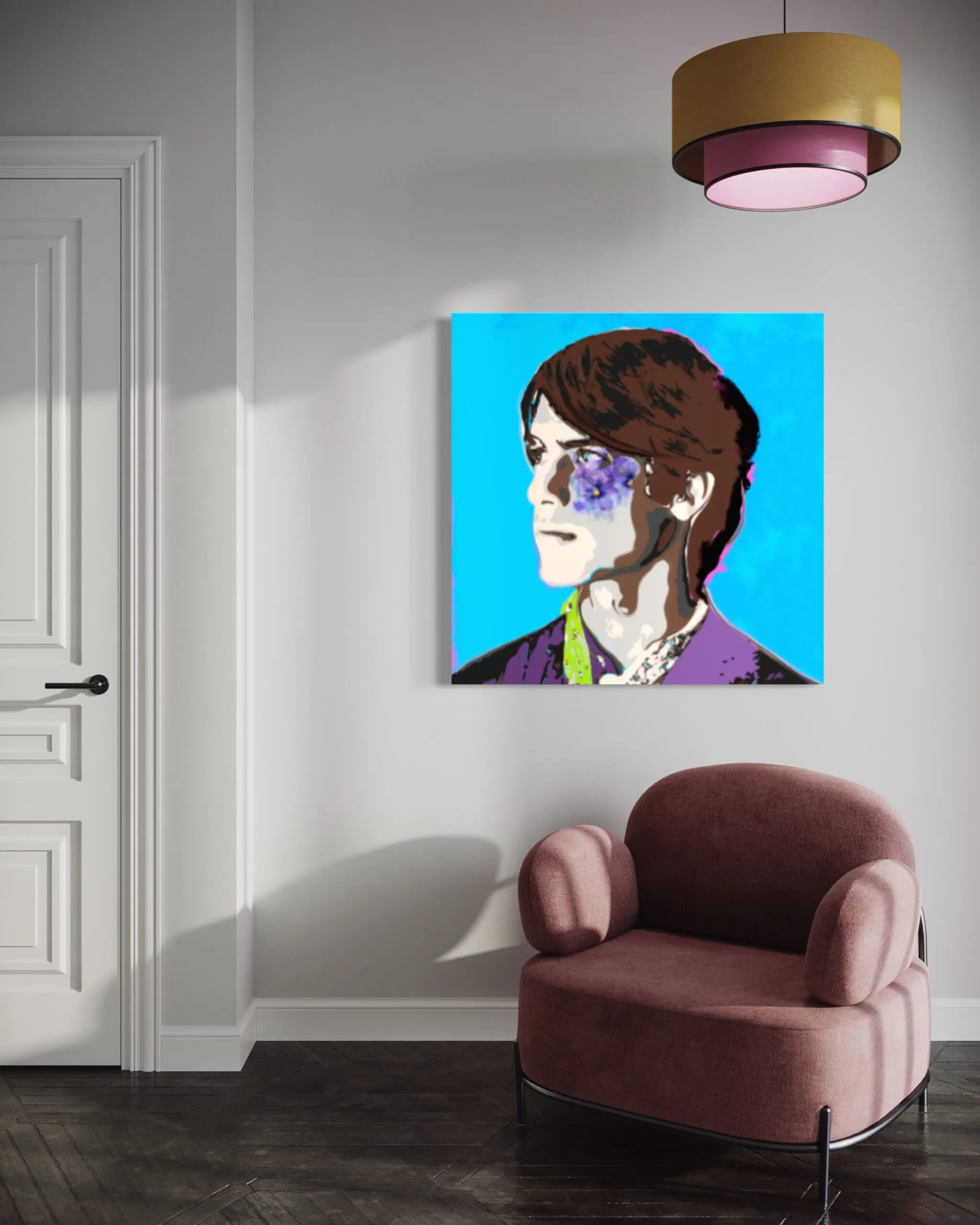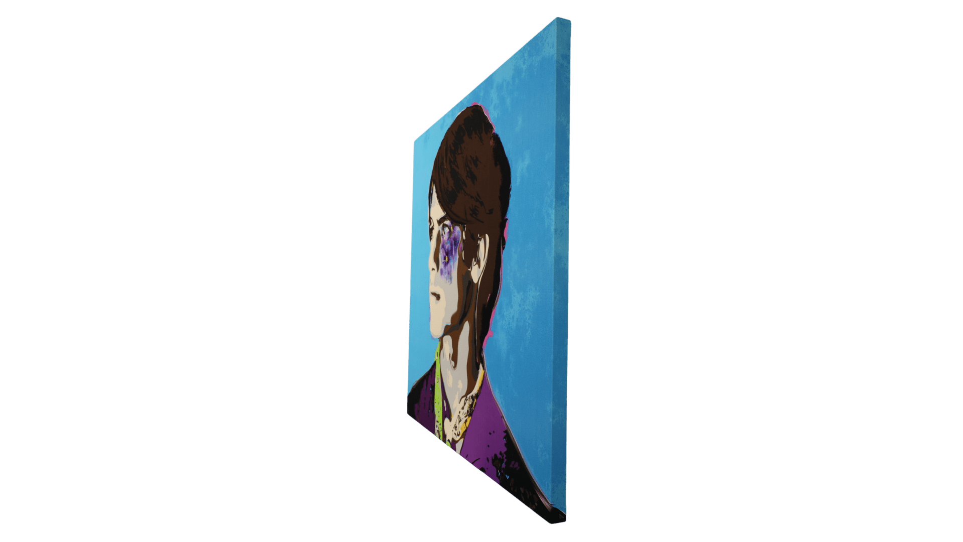 “Smalltown Boy” portrays a thoughtful young man gazing distantly. His brown hair and fair complexion contrast with a vivid blue, calm background. His purple and green attire complements floral motifs, creating overall harmony. The artist skilfully blends realism with a contemporary, illustrative style through color and texture.
