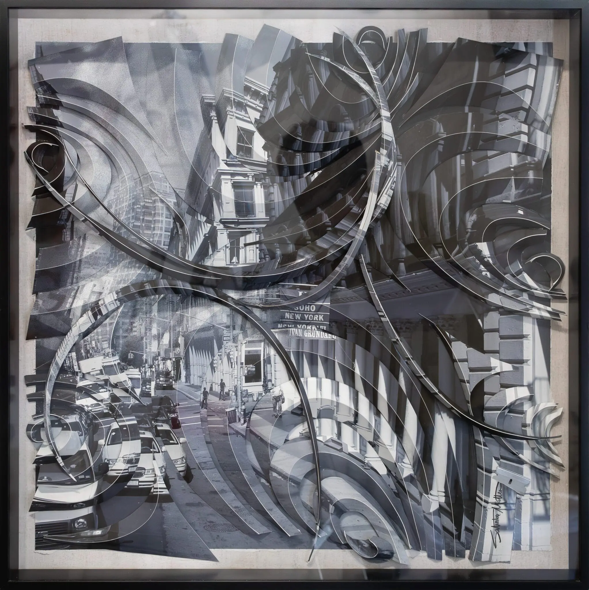 The work aligns with contemporary mixed-media abstraction and post-photographic relief, drawing from the legacy of Cubism and Futurism. Like the Cubists, Matteo disrupts linear perspective to present multiple viewpoints simultaneously. Futurist influences emerge through the emphasis on velocity and flow, capturing the city as a dynamic system rather than a static environment. The sculptural cutting of the paper situates the work within a lineage of artists who treat photography as material, extending it into physical space.