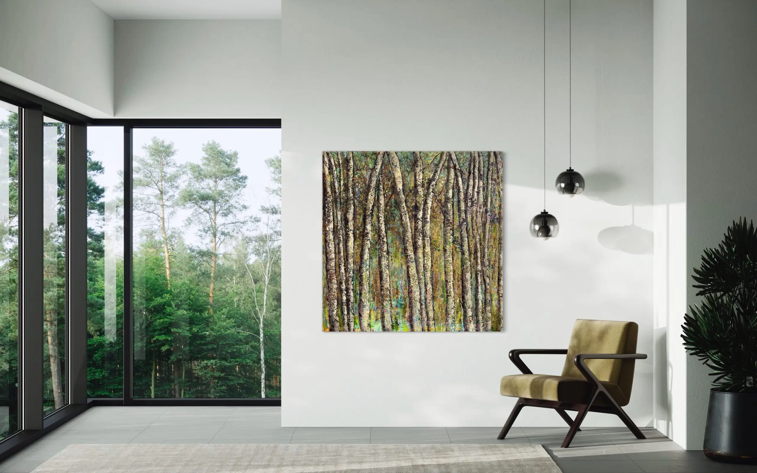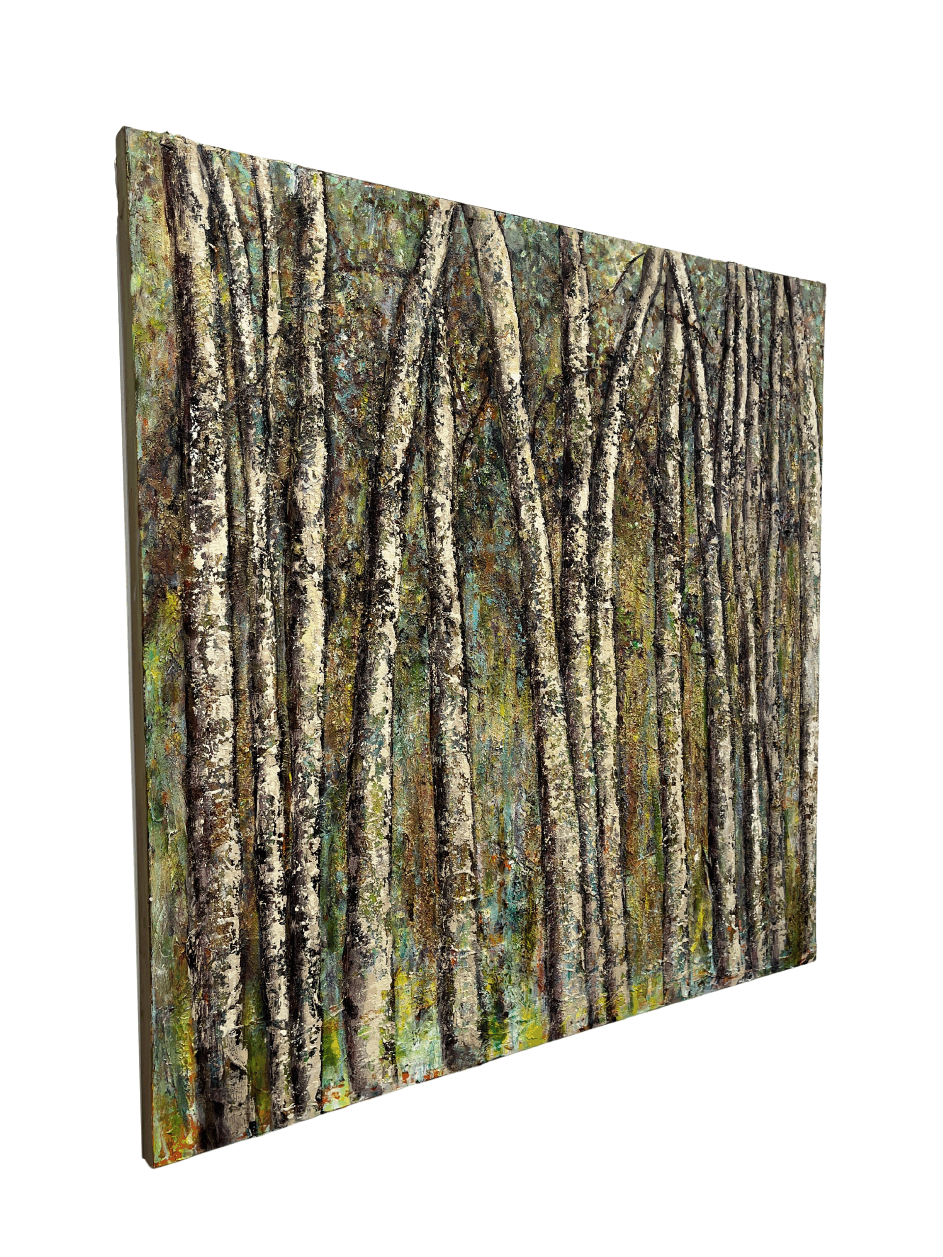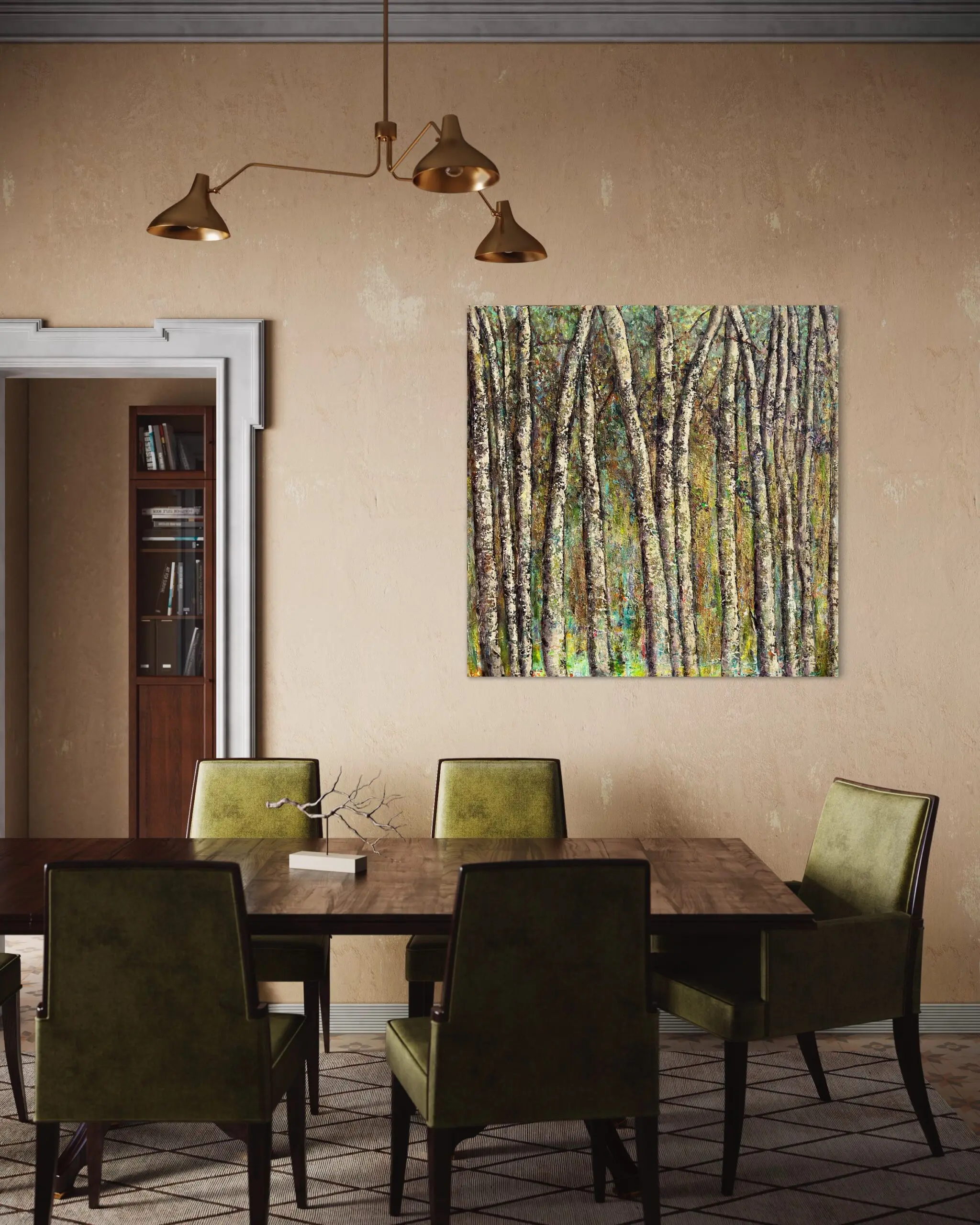 Haleh Mashian’s “Gilded Dreams” brings the forest to life through a rich interplay of color, texture, and metallic elements. The vertical lines of the birch trees create a strong yet fluid rhythm, their white and black bark contrasting against a luminous golden background. Hints of turquoise and deep teal weave through the trunks, adding a sense of vibrancy and movement to the earthy composition.