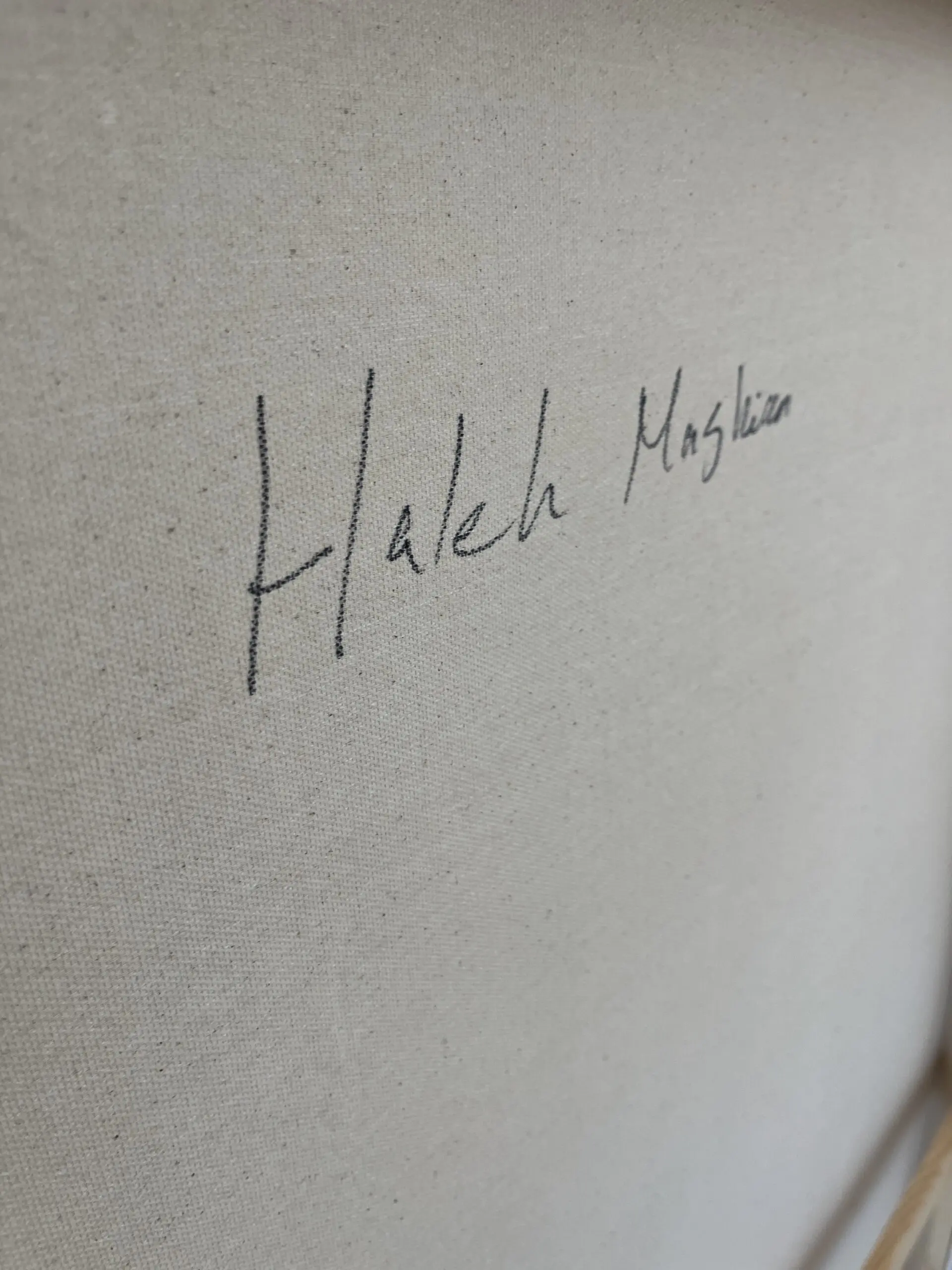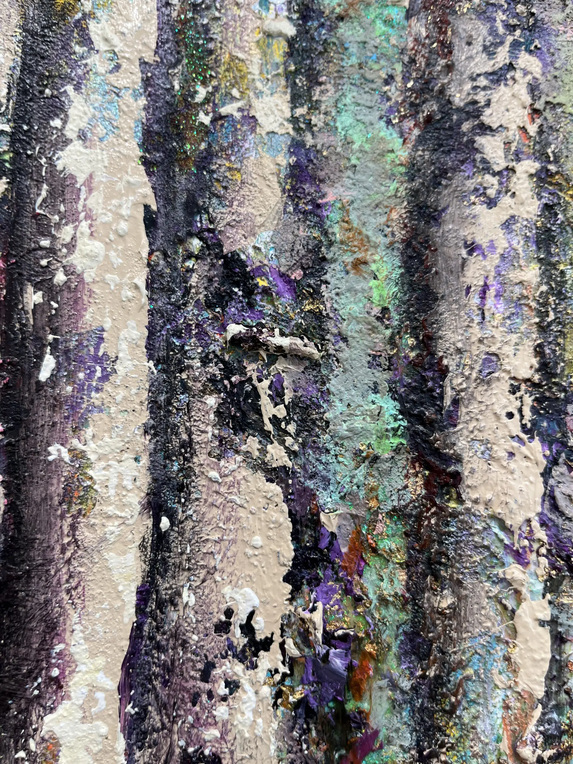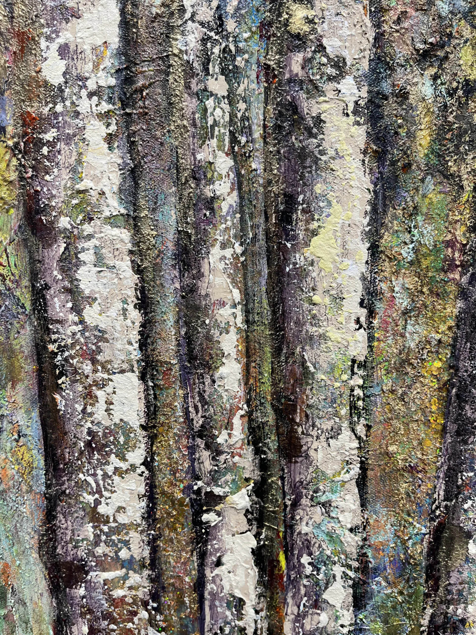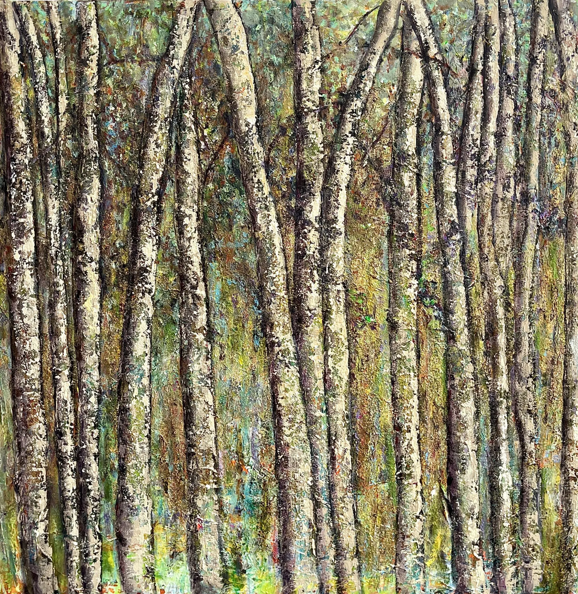 Haleh Mashian’s “Gilded Dreams” brings the forest to life through a rich interplay of color, texture, and metallic elements. The vertical lines of the birch trees create a strong yet fluid rhythm, their white and black bark contrasting against a luminous golden background. Hints of turquoise and deep teal weave through the trunks, adding a sense of vibrancy and movement to the earthy composition.