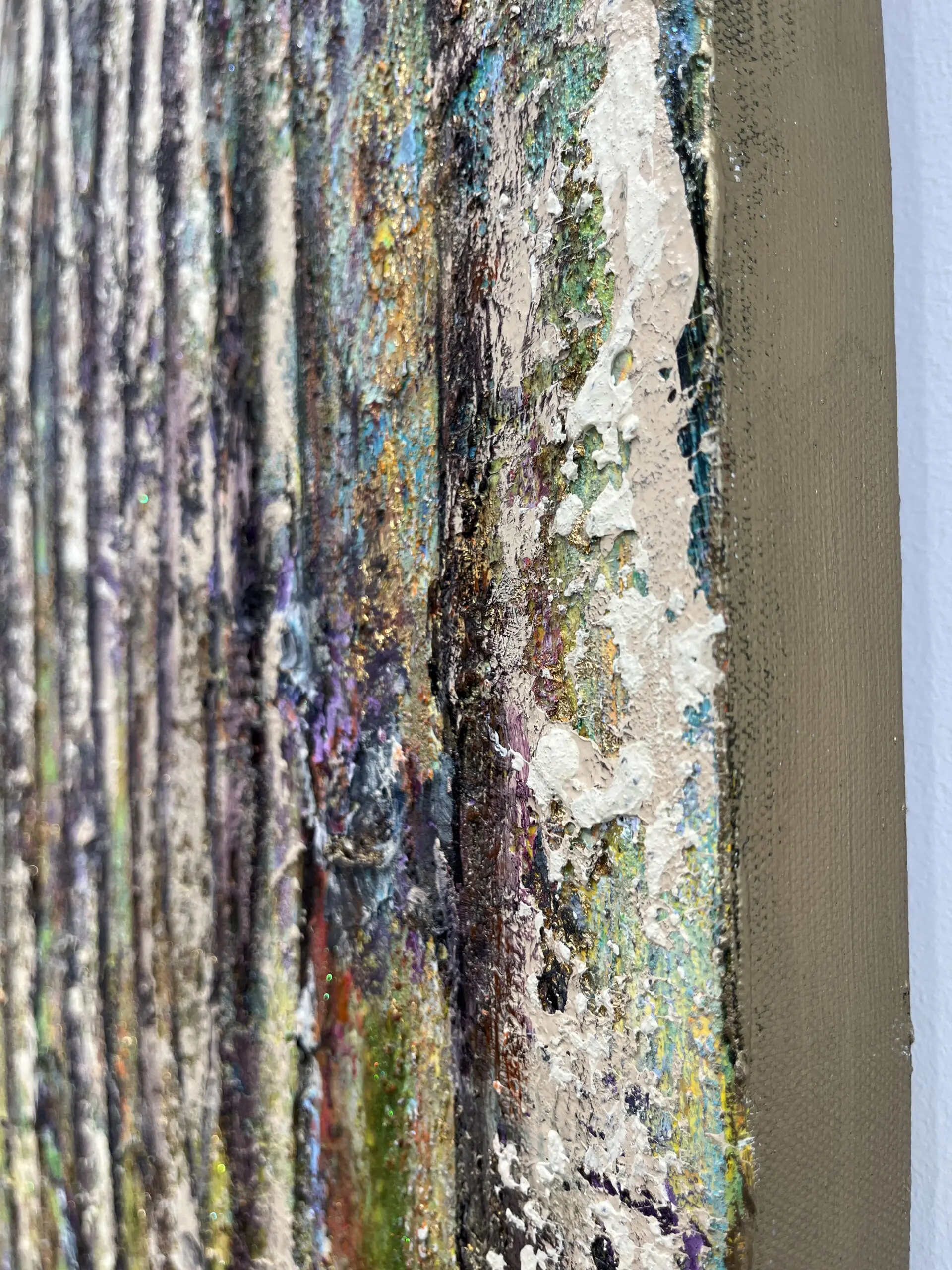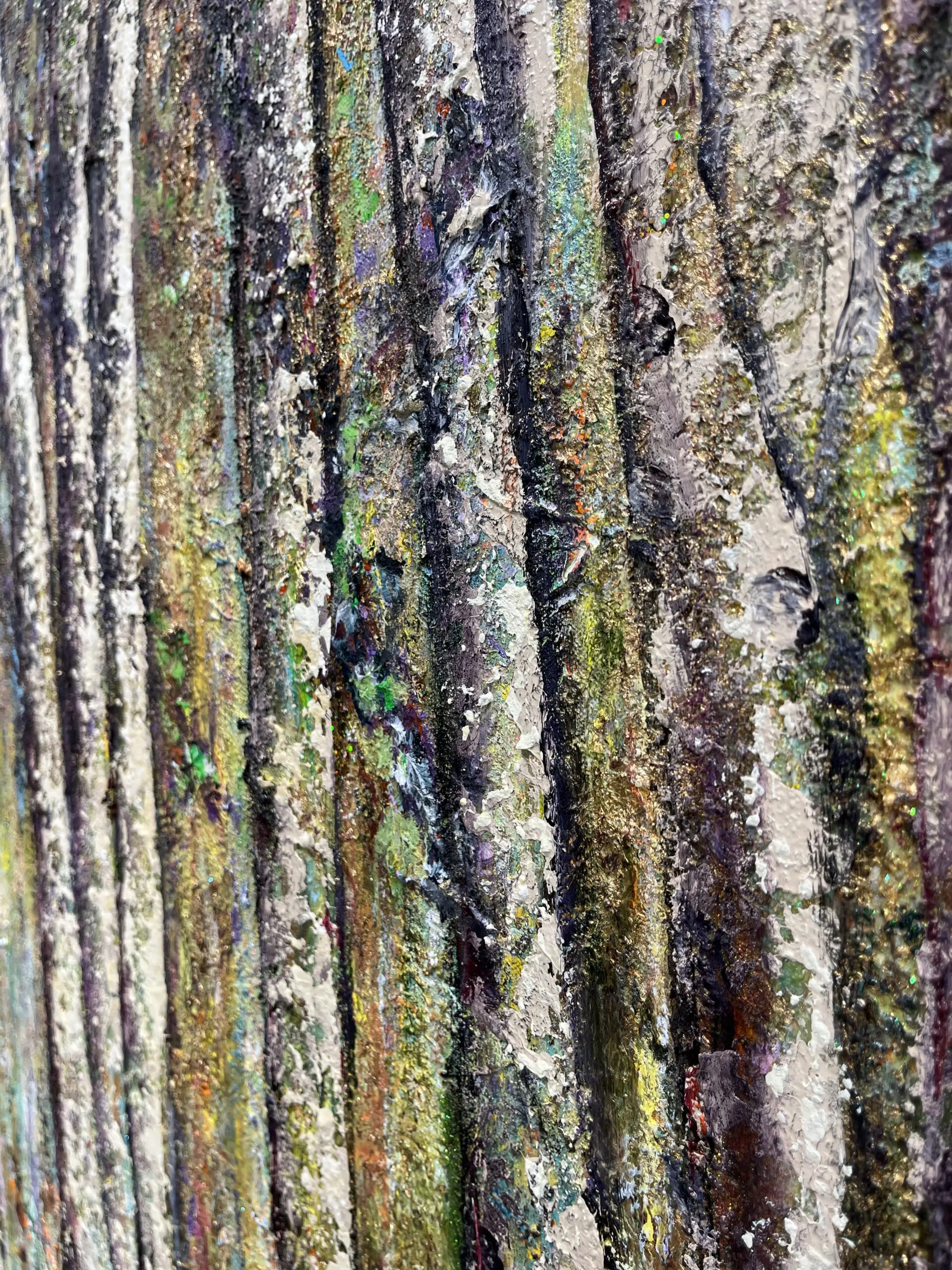 Mashian’s use of layering and mixed media techniques gives “Gilded Dreams” a tactile presence, making the composition feel both organic and opulent. The trees stand tall, their forms slightly curved, as if swaying in a gentle breeze. The combination of bold textures, reflective surfaces, and earthy hues evokes a sense of serenity while maintaining an air of grandeur.