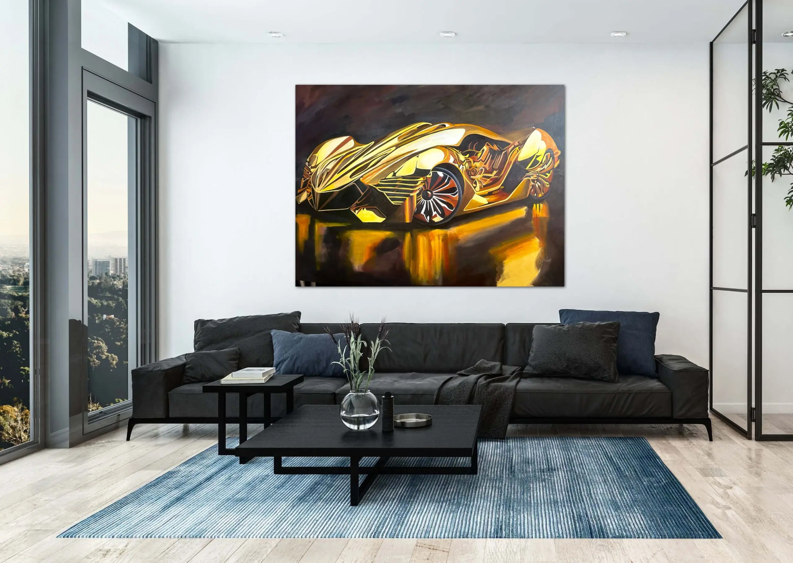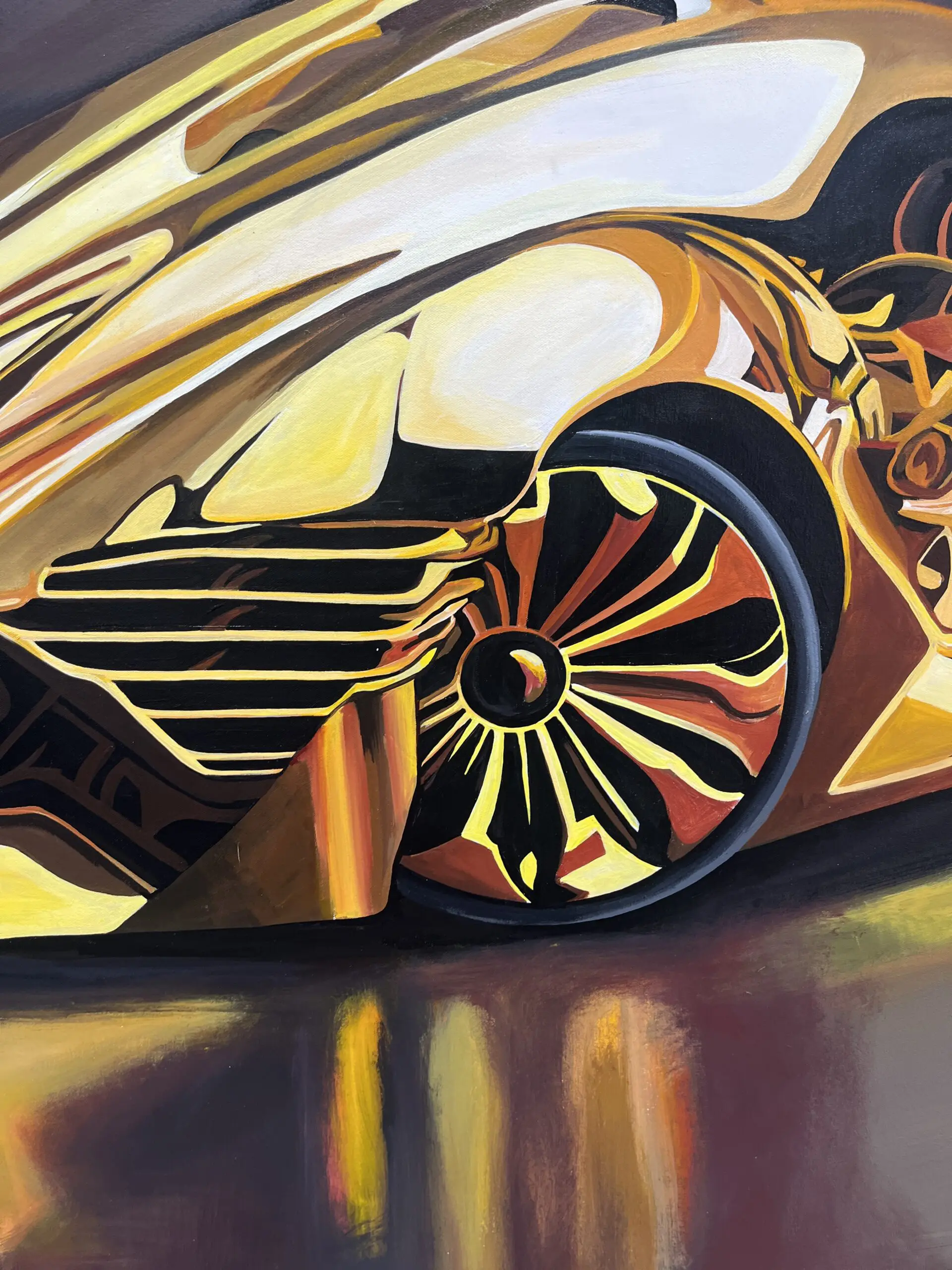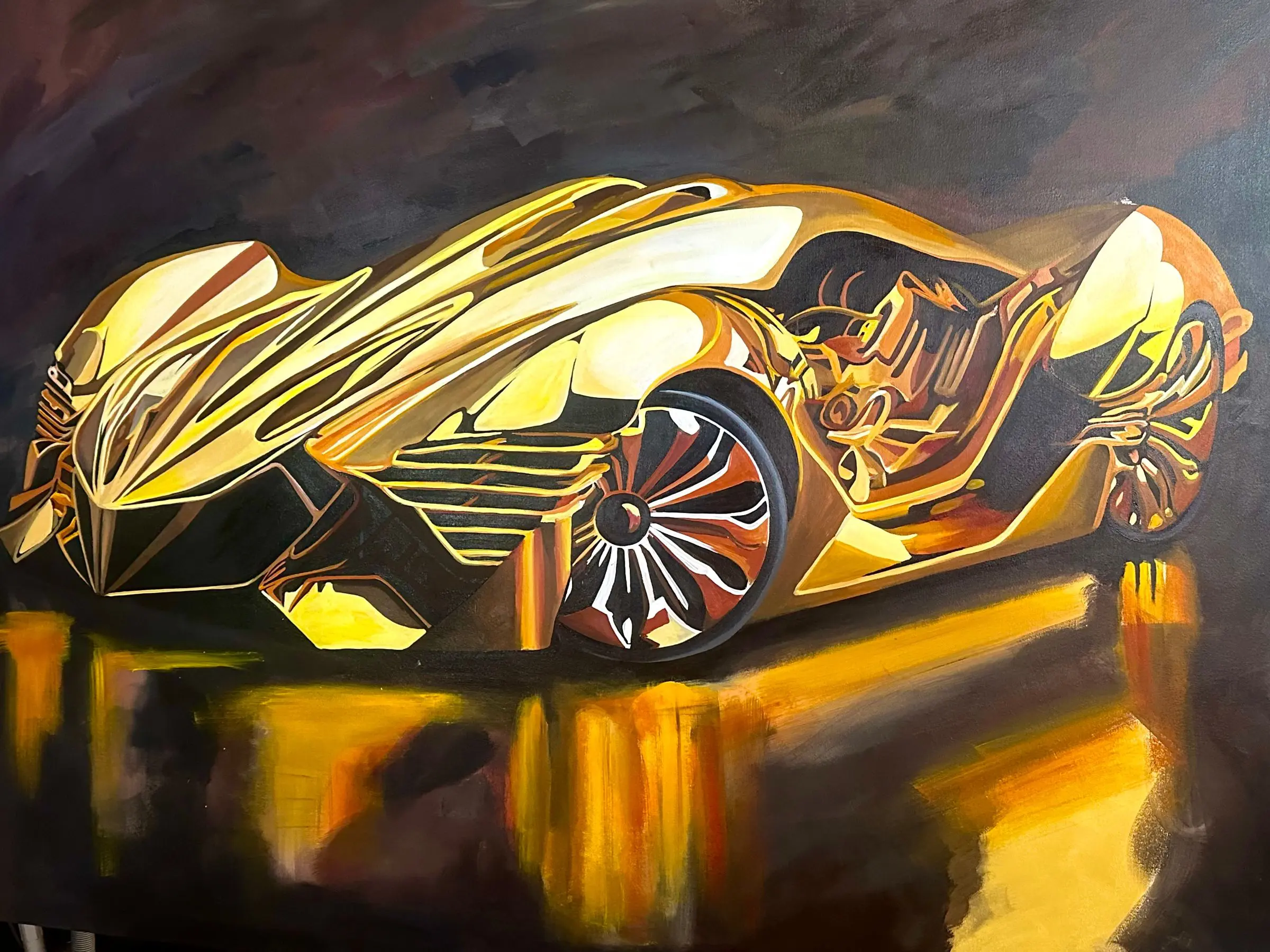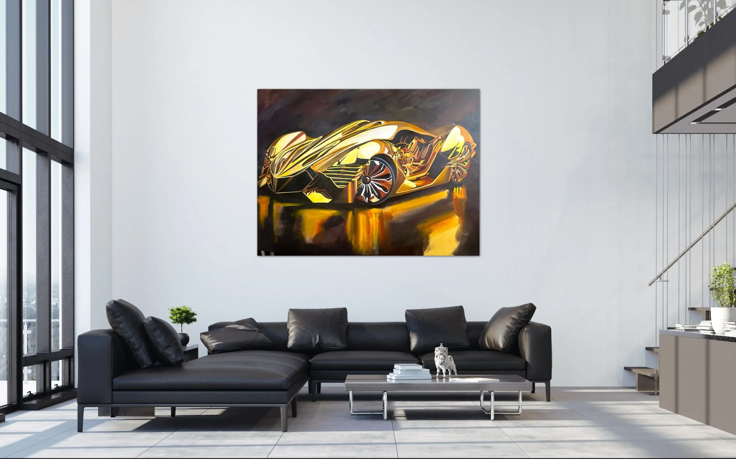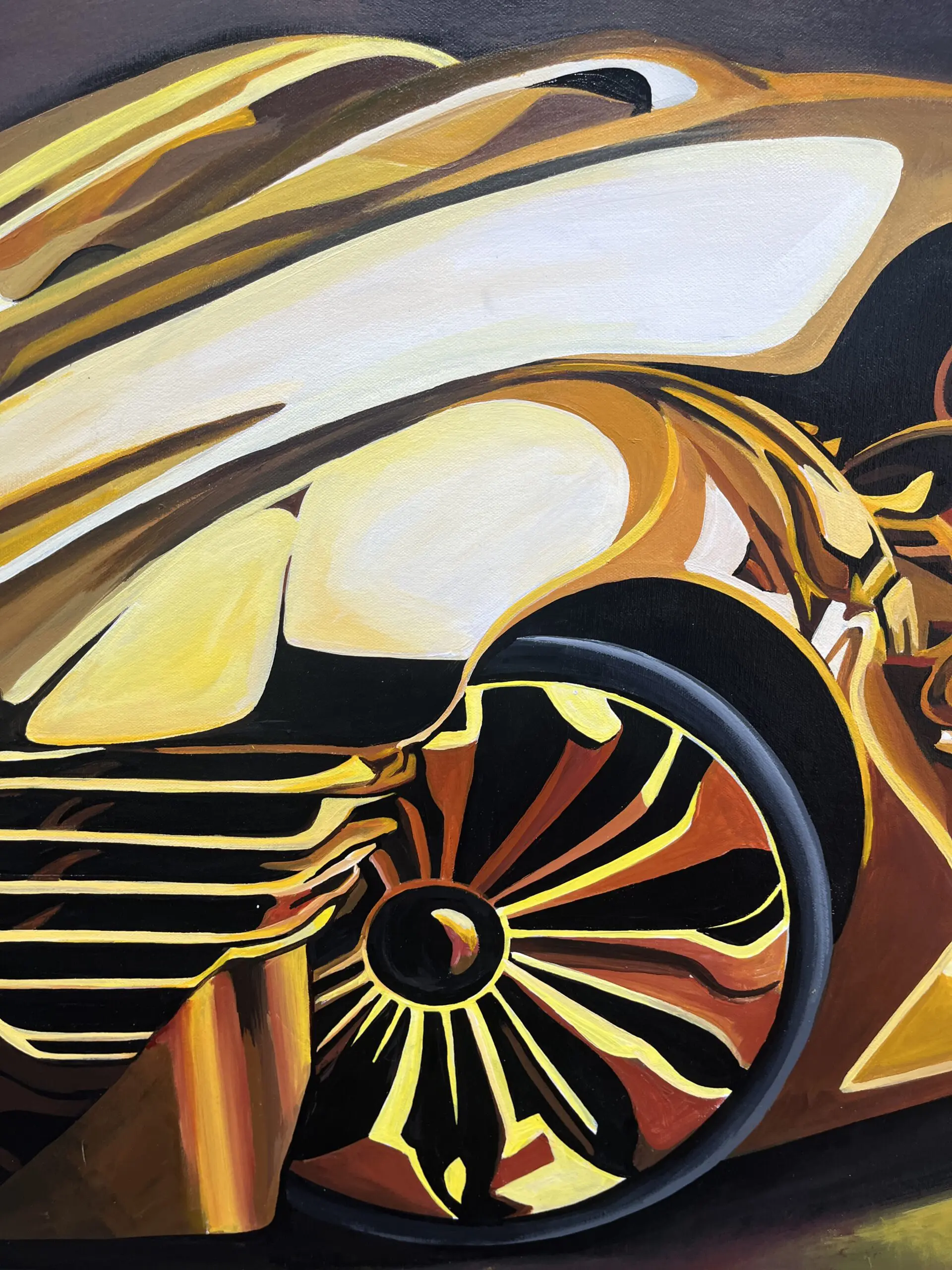 In this stunning painting, the artist captures the essence of opulence and exclusivity through an imaginary car that embodies the epitome of luxury. The painting is predominantly done in shades of gold and black, evoking a sense of sophistication and allure.
