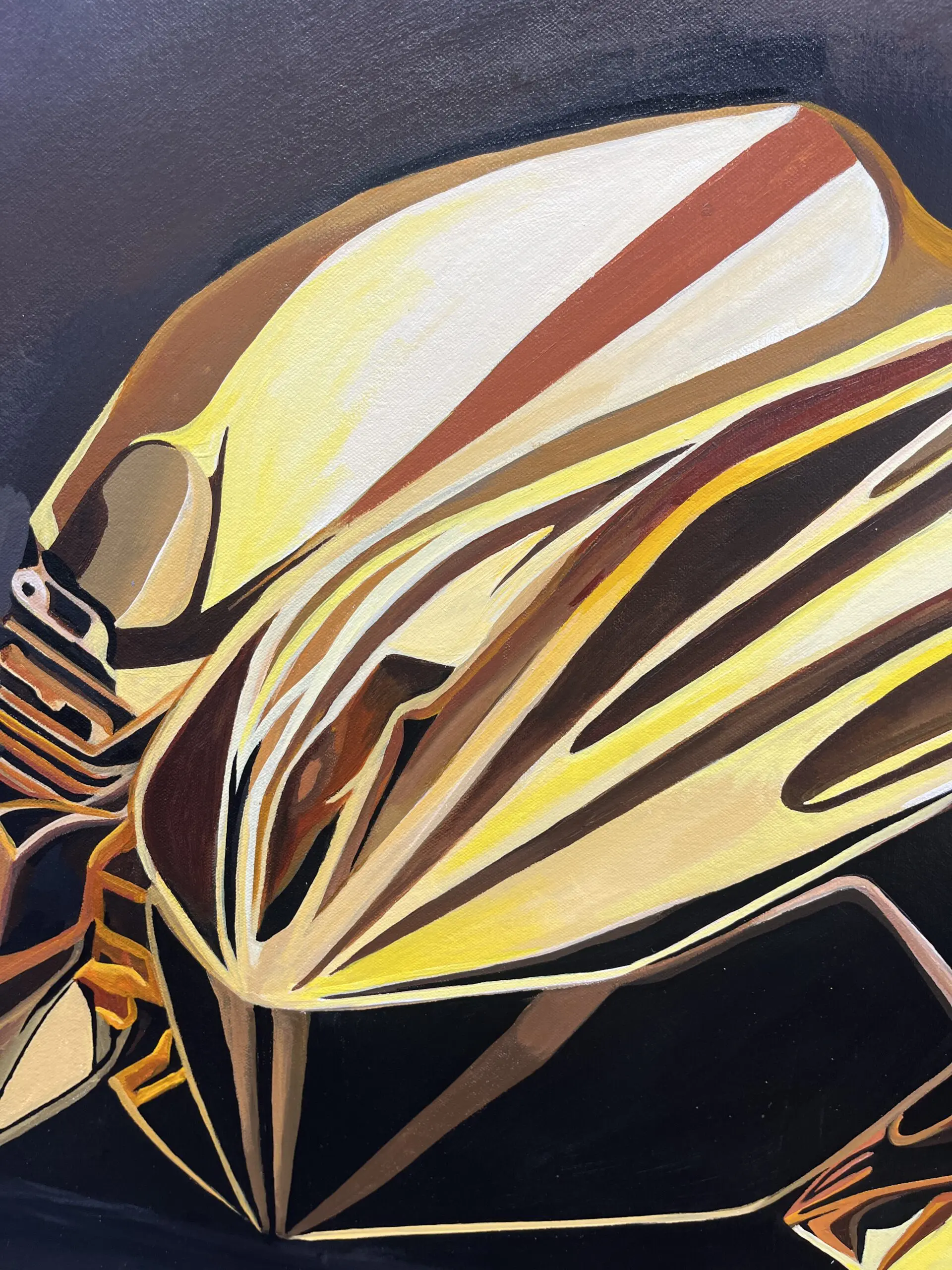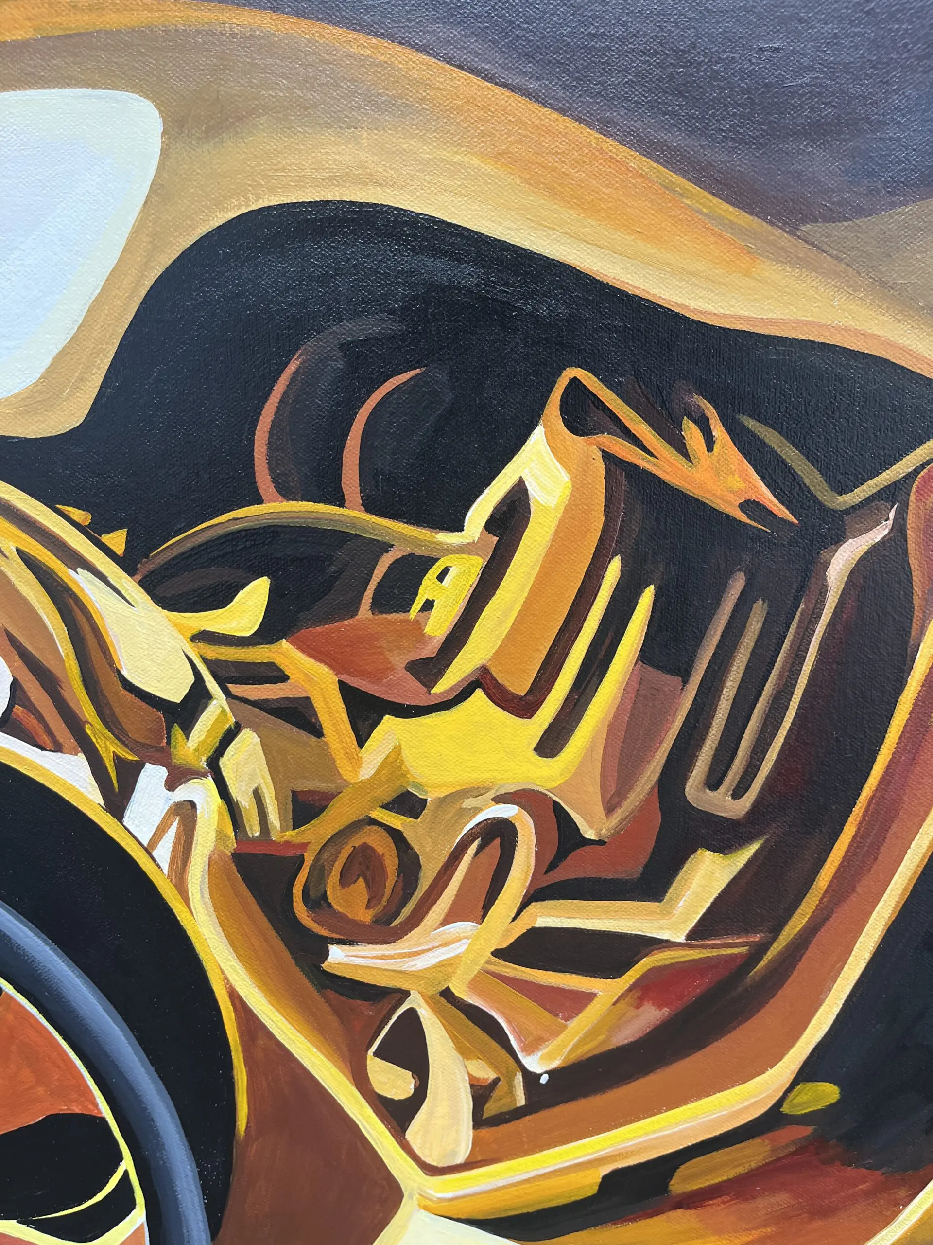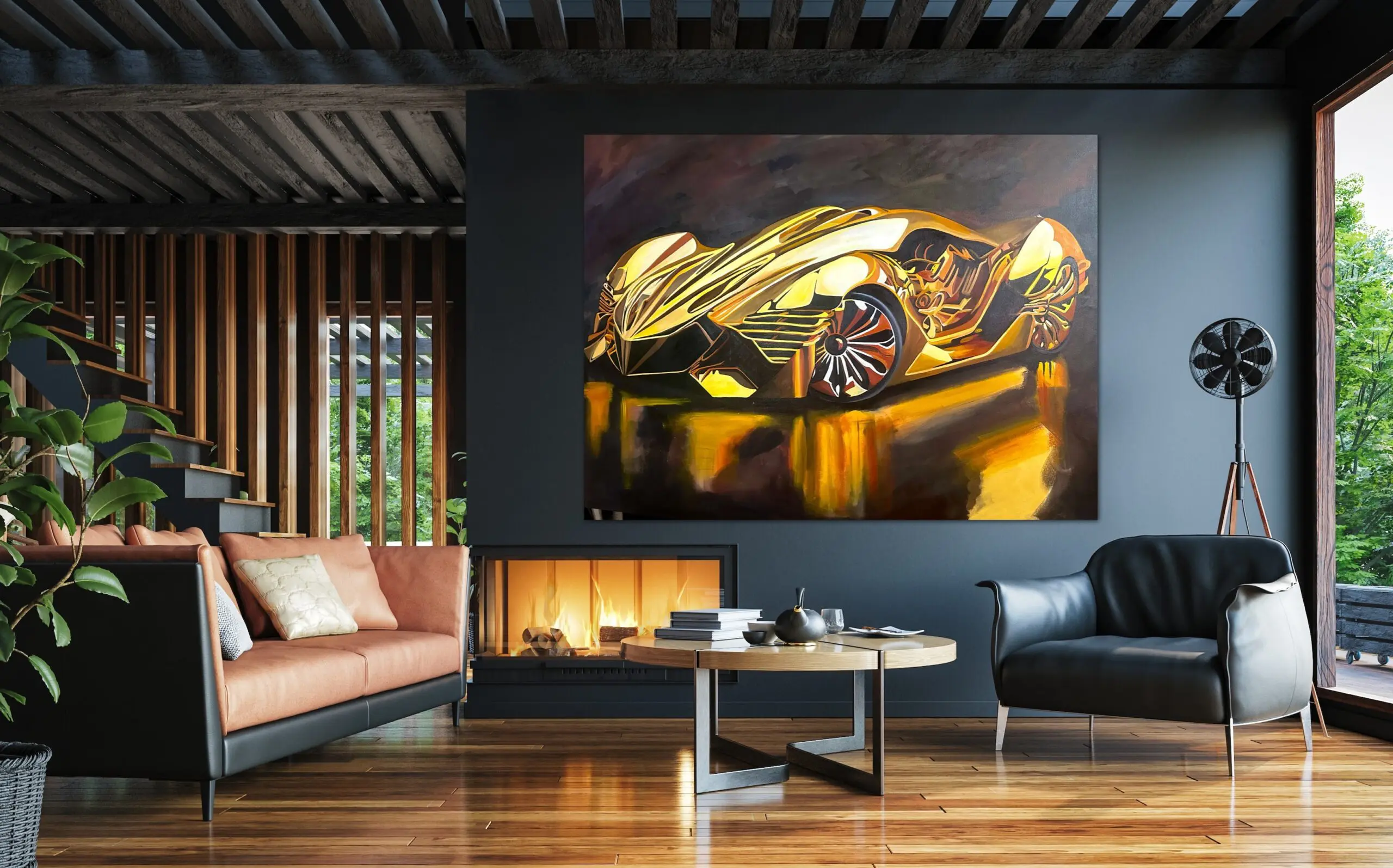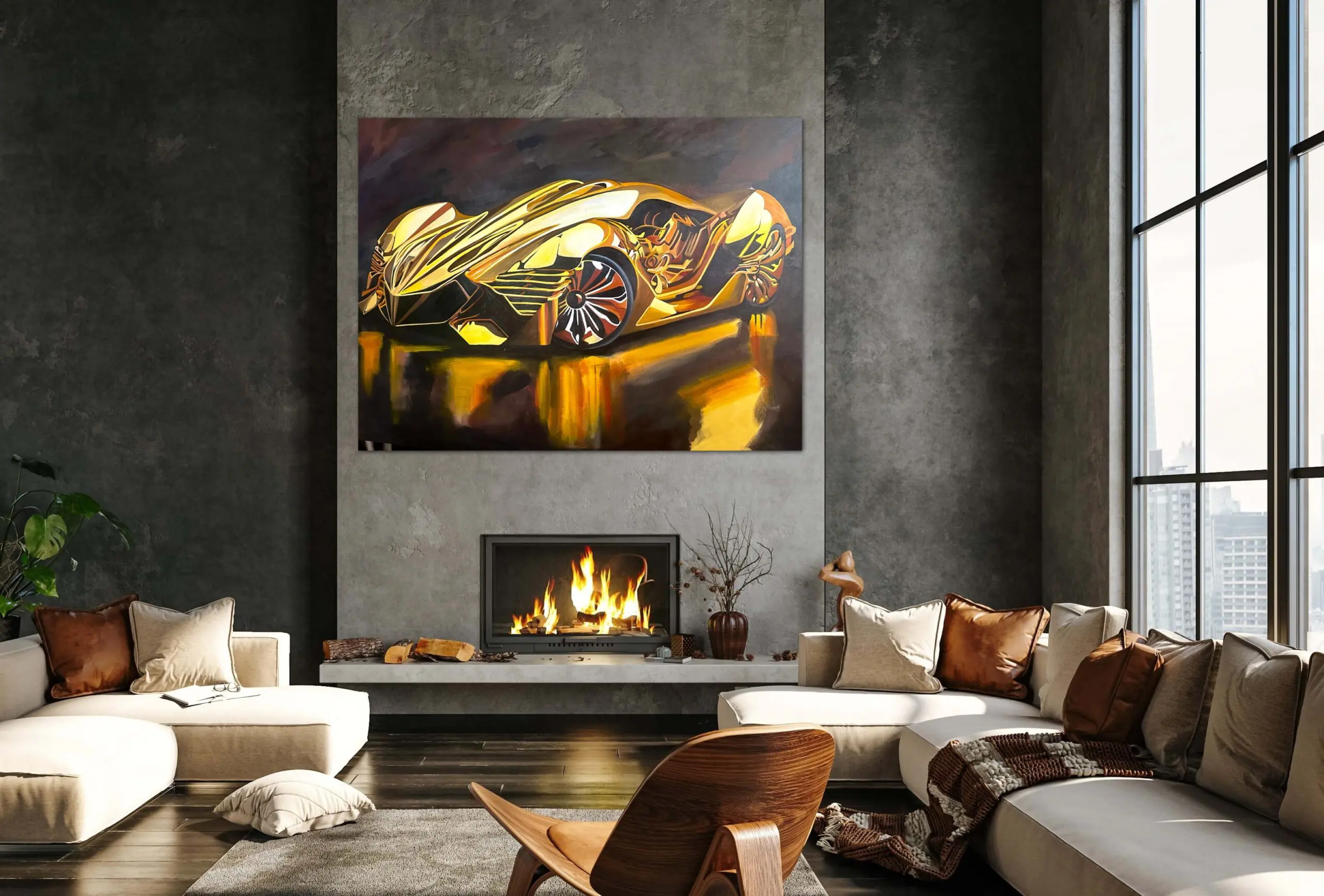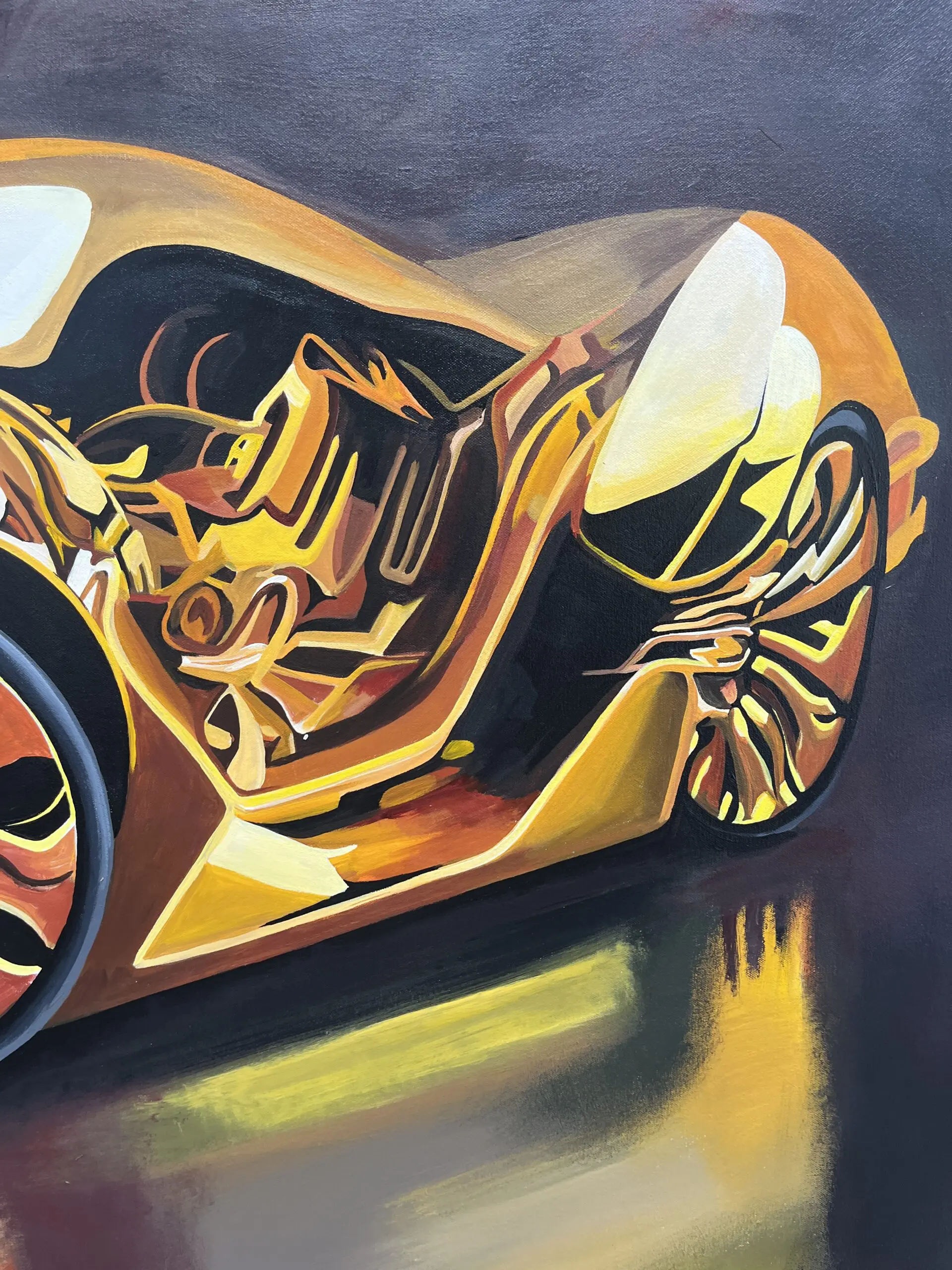 In this stunning painting, the artist captures the essence of opulence and exclusivity through an imaginary car that embodies the epitome of luxury. The painting is predominantly done in shades of gold and black, evoking a sense of sophistication and allure.