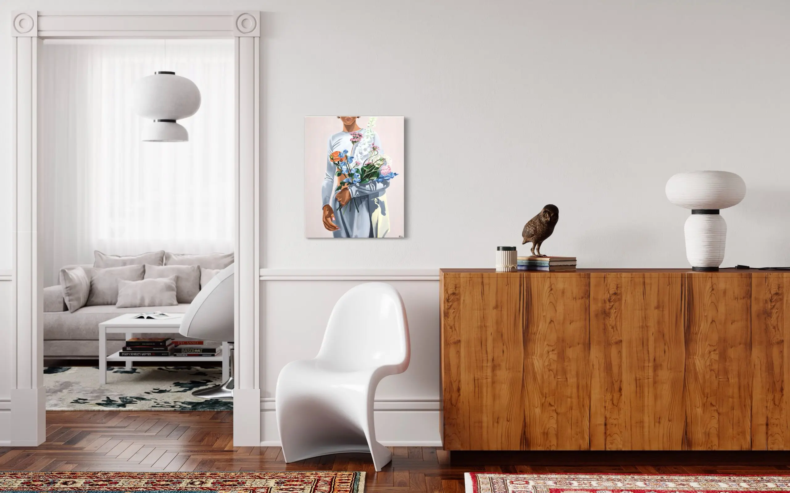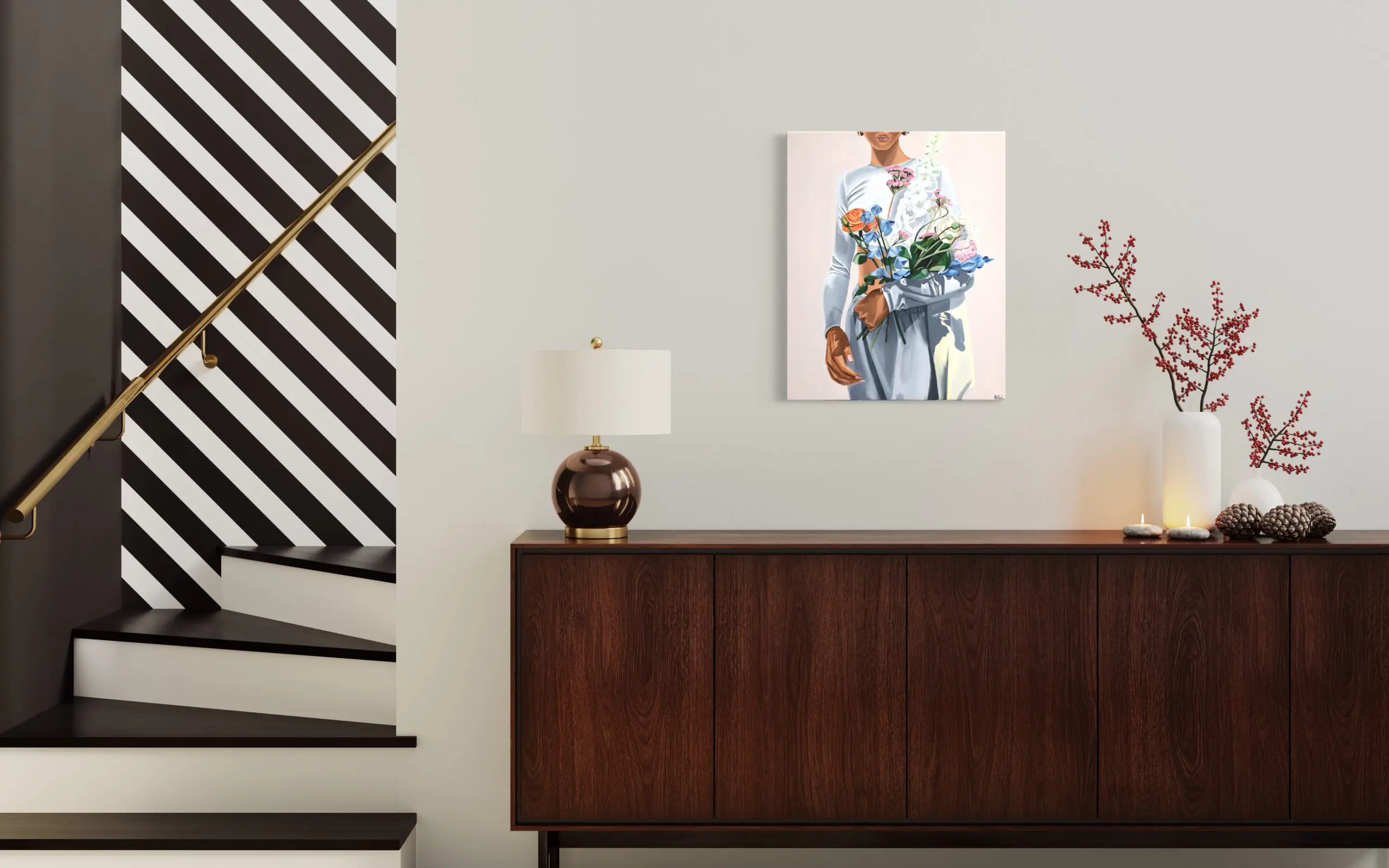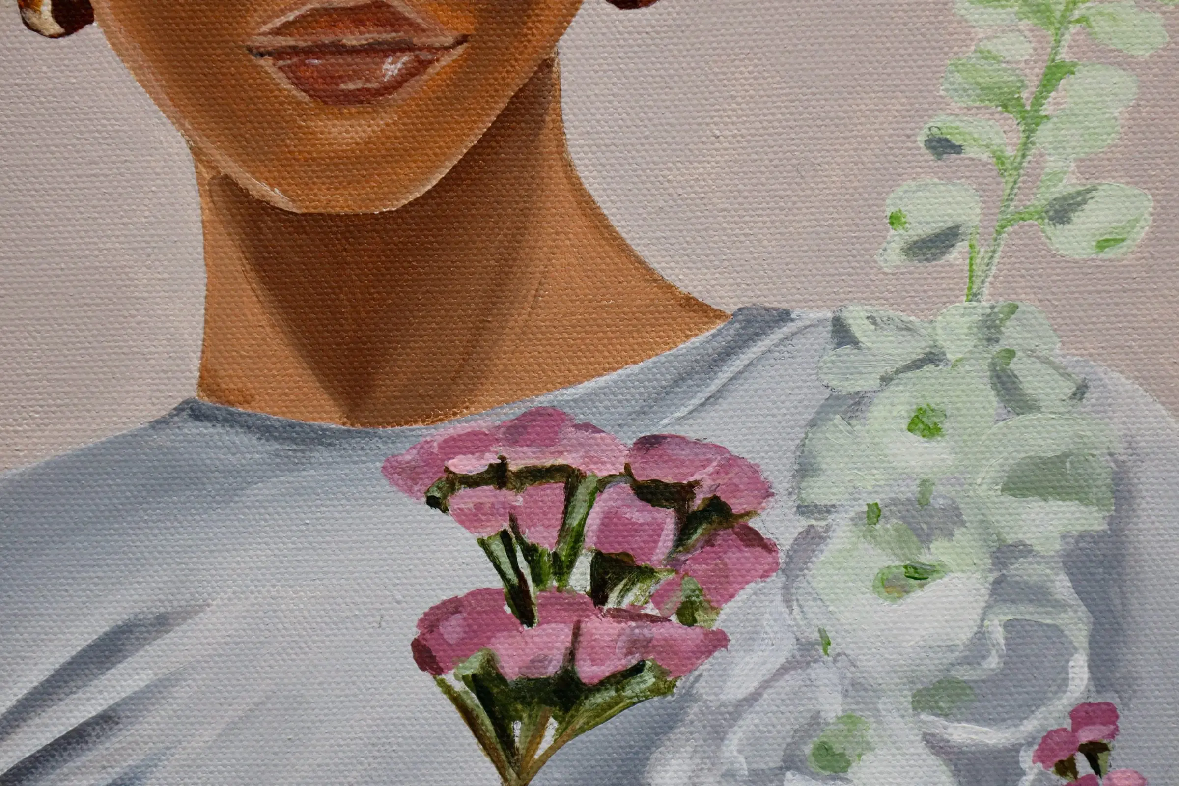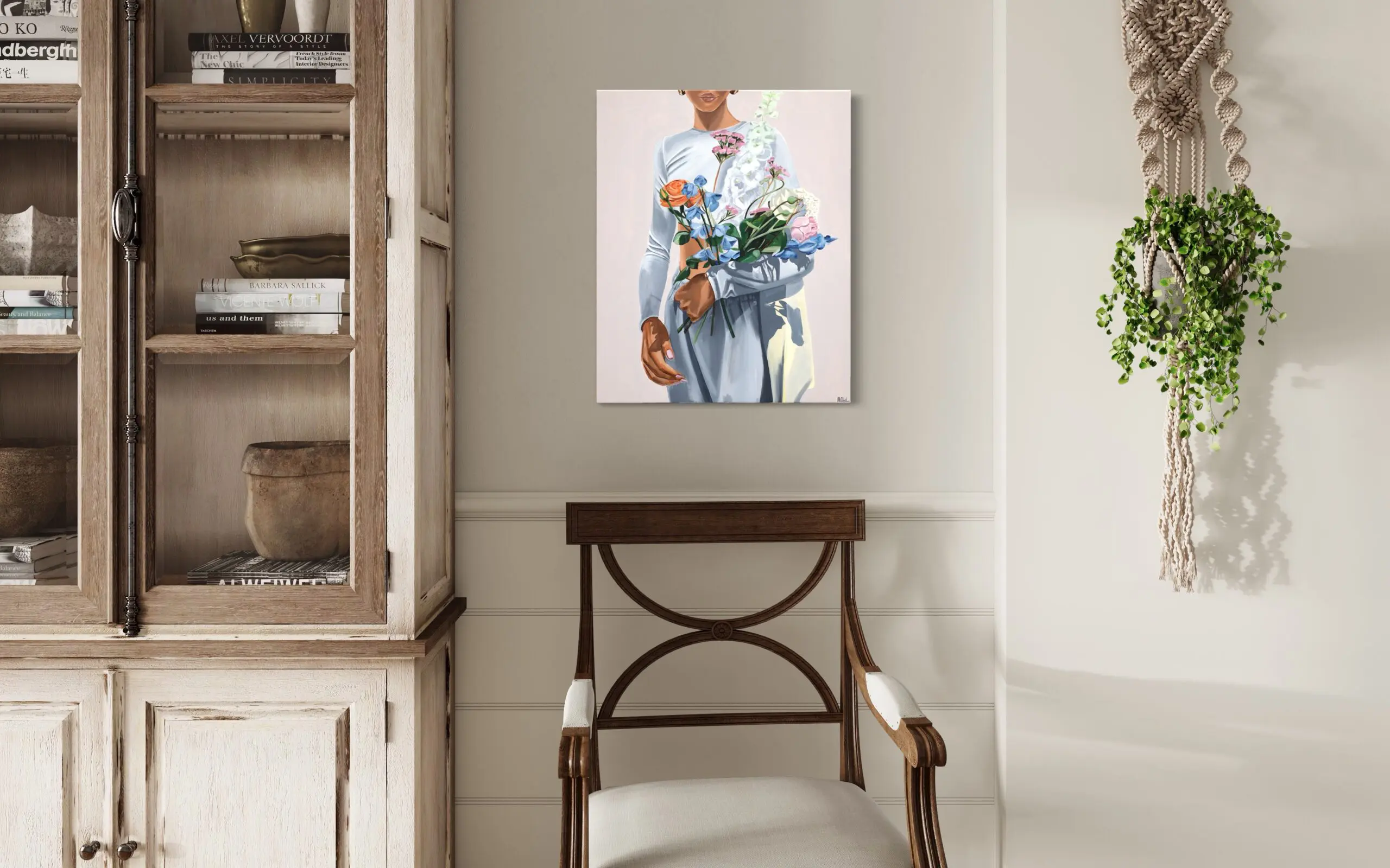 In Morgane Clavaud’s composition, “Street Bouquet,” the artist deliberately omits identifying facial features, expressing her explicit choice to focus less on portraying a specific individual and more on crafting a nuanced study of the universal spontaneity embodied by a woman holding a freshly gathered bouquet of flowers. The deliberate exclusion of facial details invites viewers to engage with the broader essence of the moment, emphasizing the universality of the scene over the specificity of the subject.