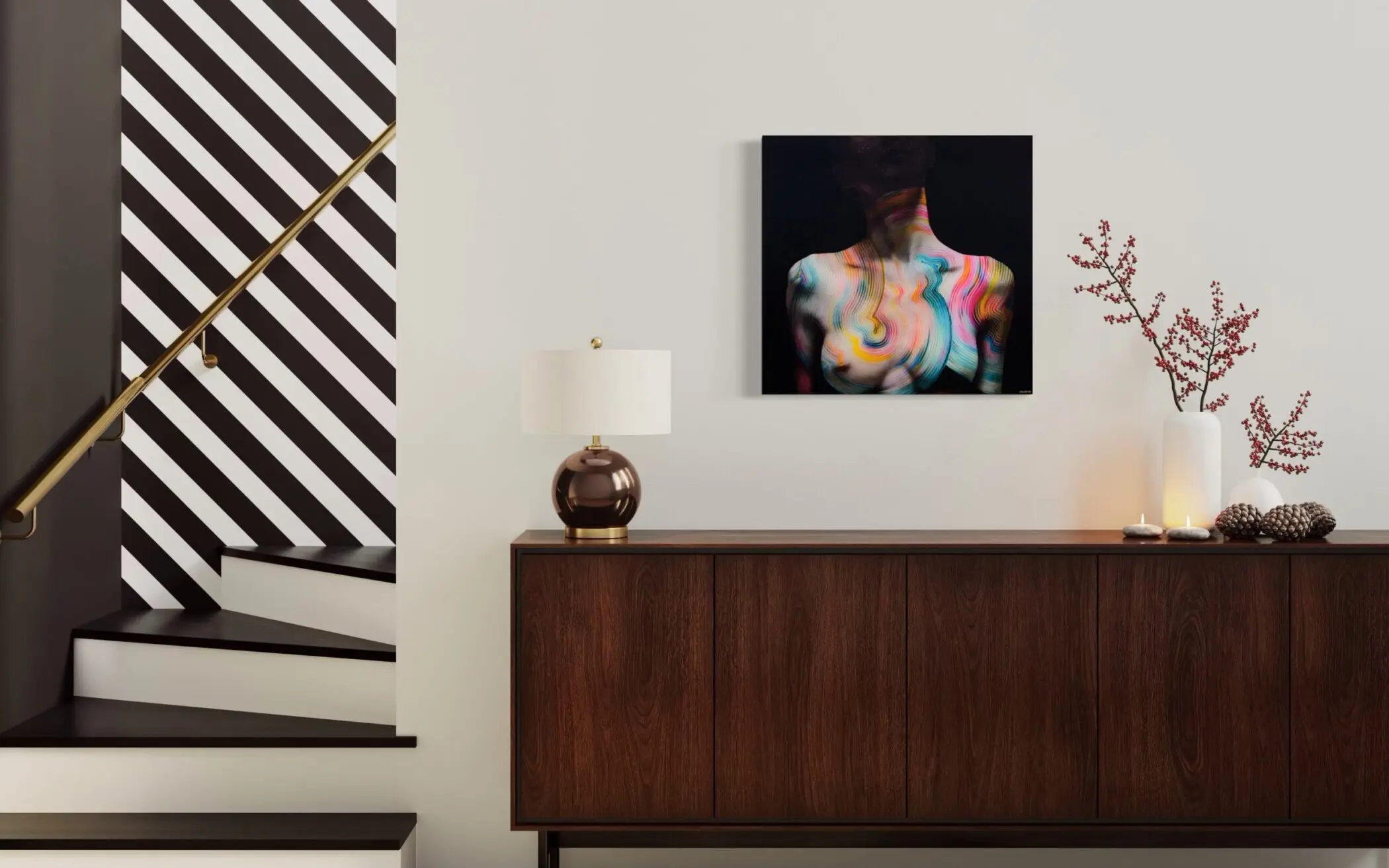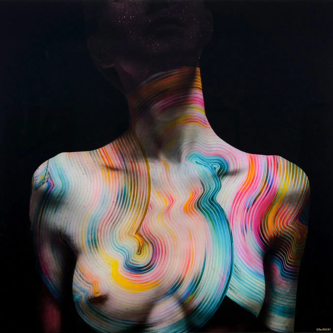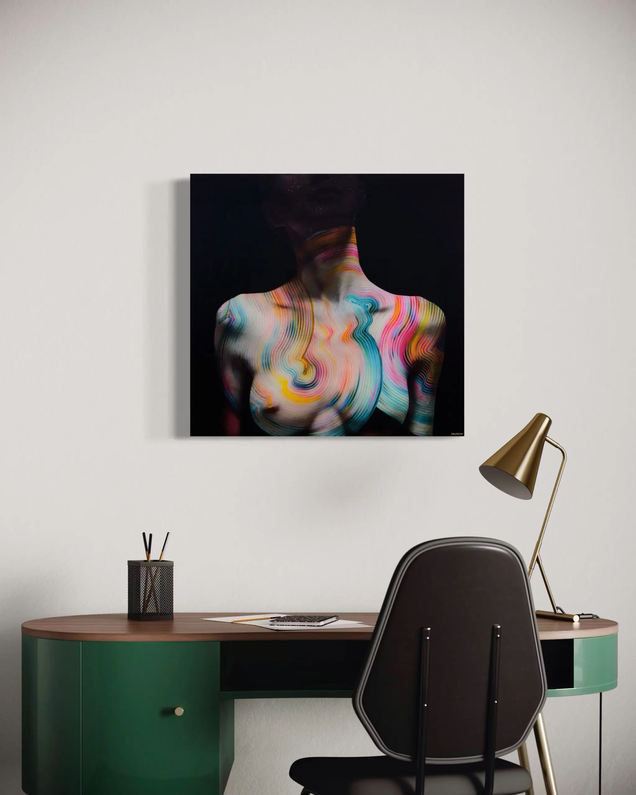 A striking interplay of light and texture heightens the painting’s emotional depth. The obscured face further reinforces the concept of dissolution, drawing the viewer’s focus toward the mesmerizing wave-like patterns that ripple across the figure, mirroring the way water meets light, or energy vibrates through space. The contrast between deep black voids and electrifying hues creates a sense of intimate vulnerability yet infinite vastness, as though the body is being absorbed into a cosmic field.