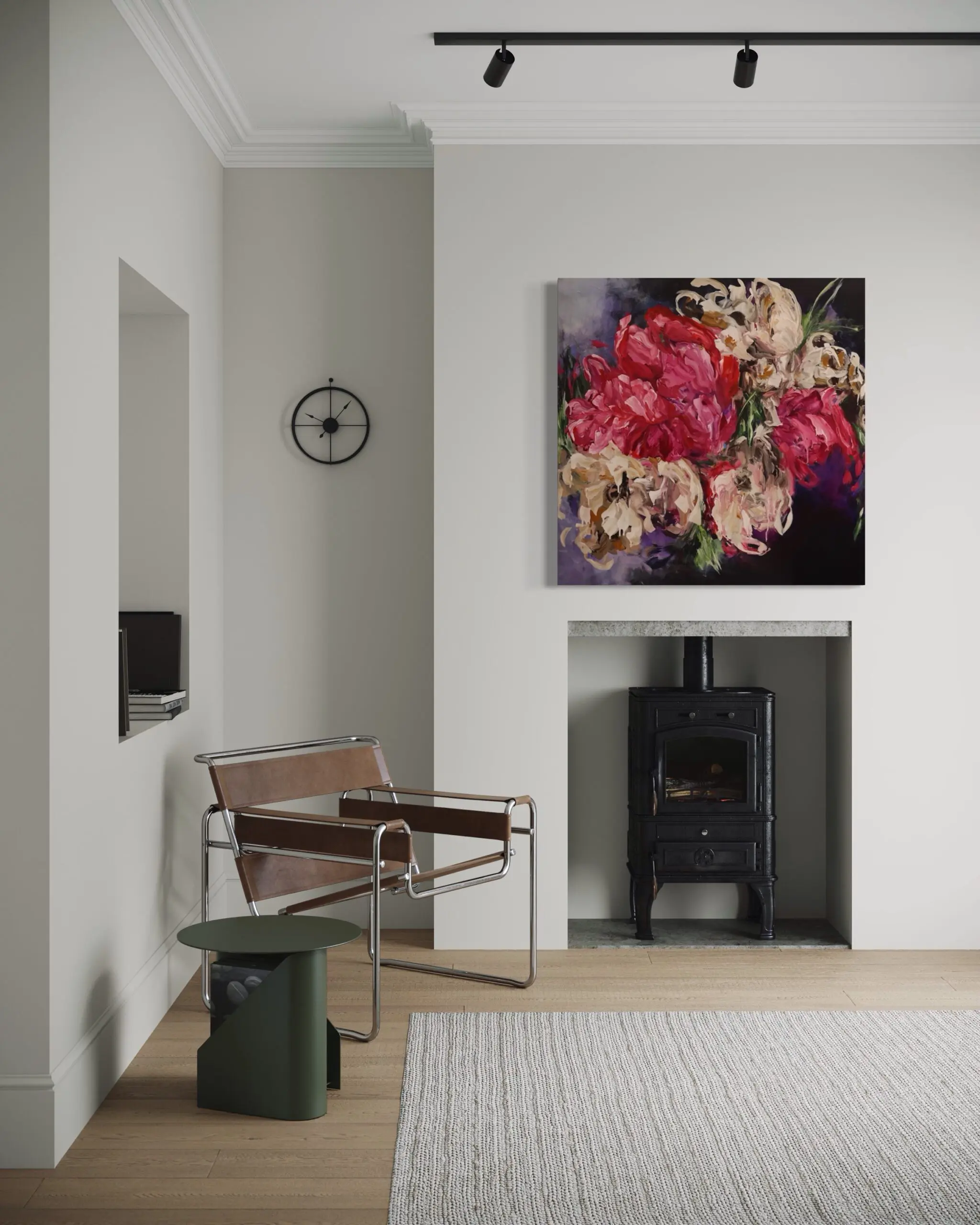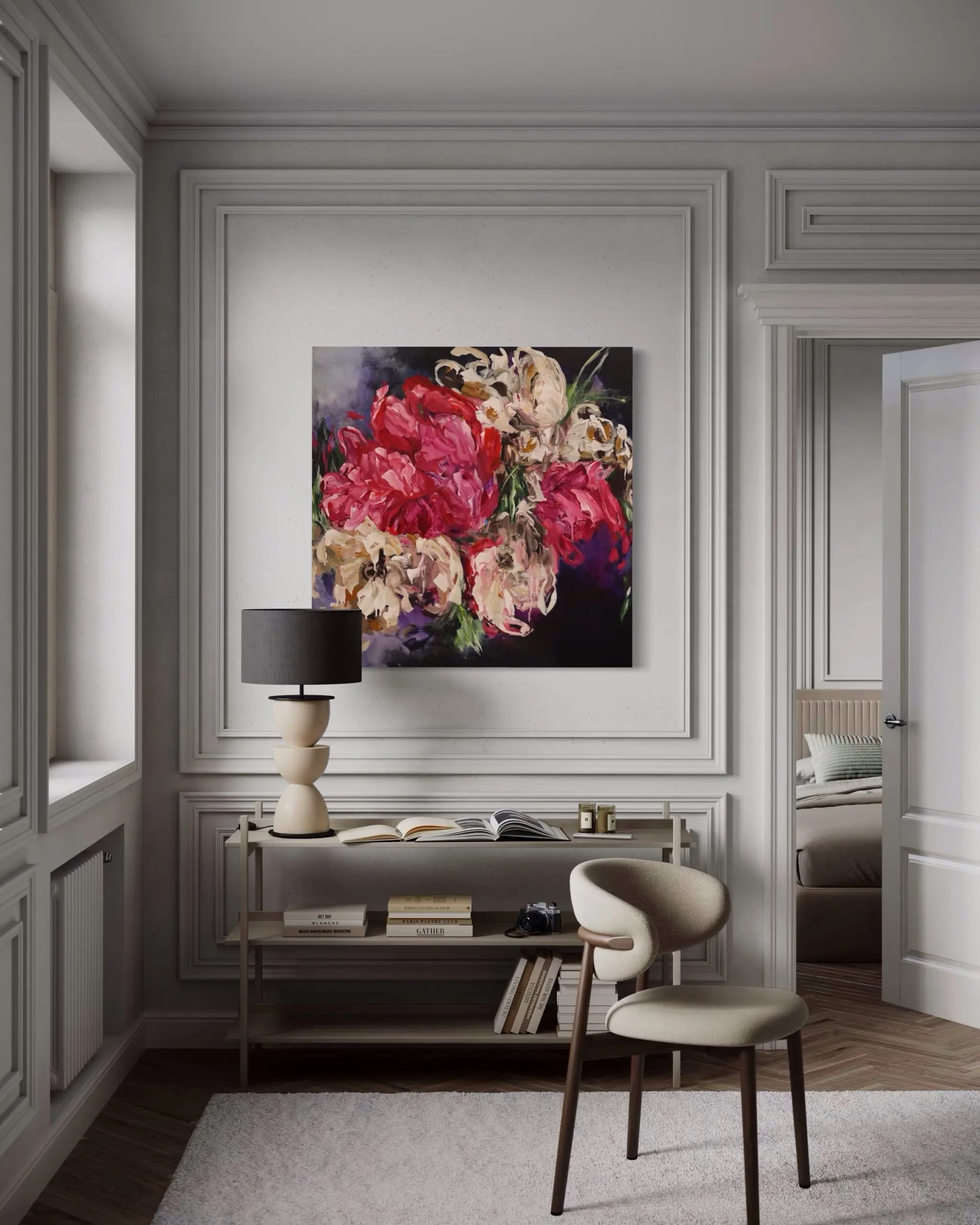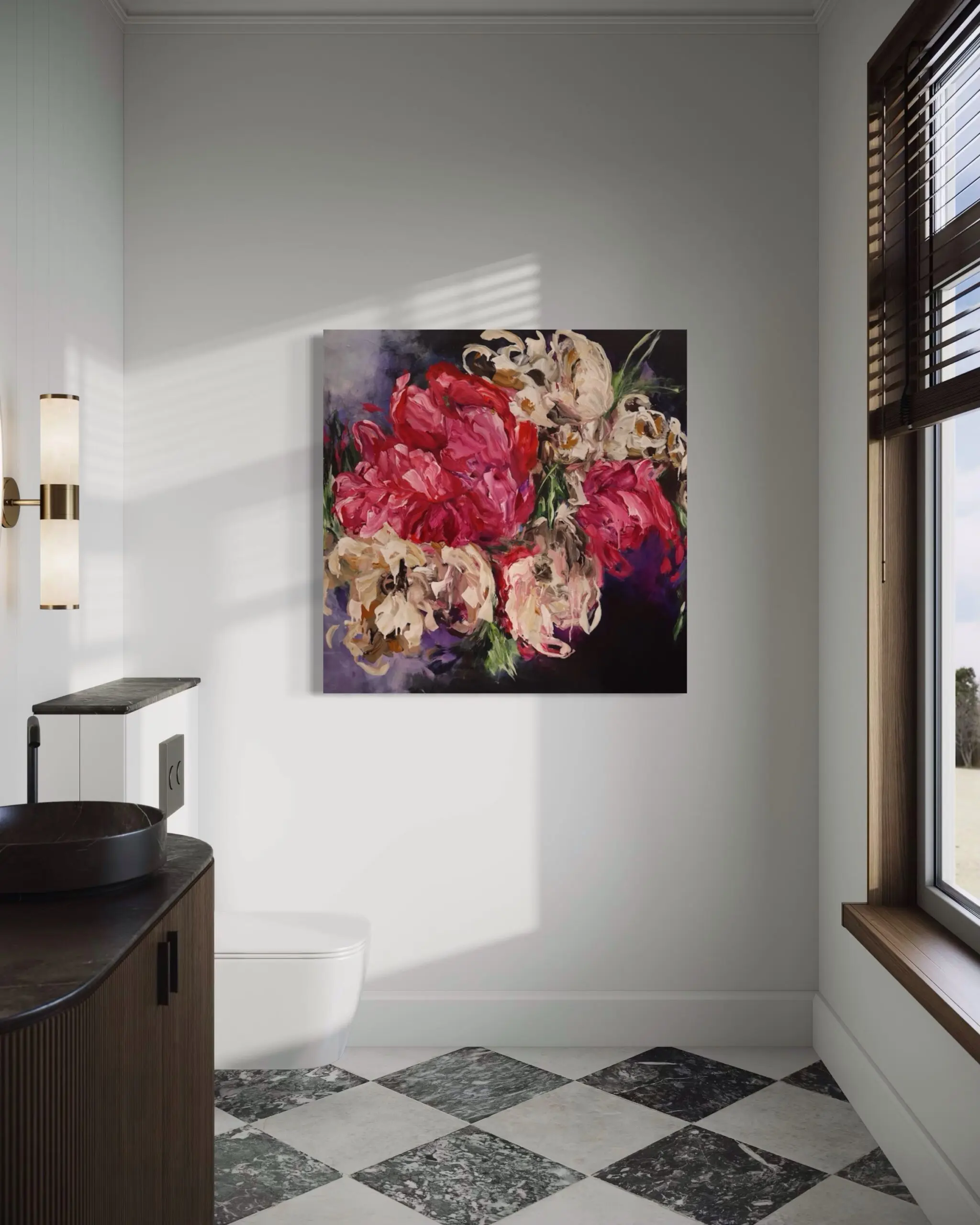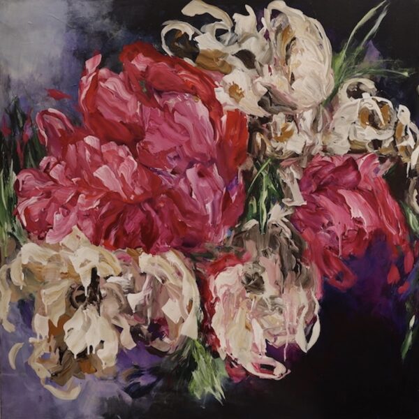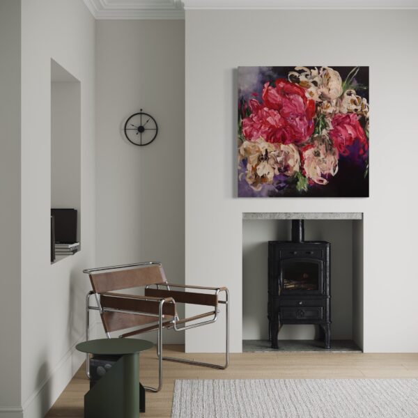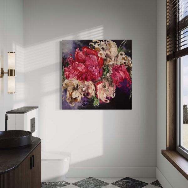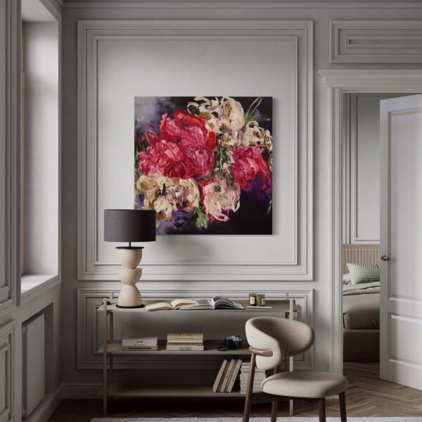 Sweet Scent of Love captures fuchsia and white roses with petals elegantly extending in various directions—some closed, others open—creating a whimsical, floating sensation. The flowers appear to be suspended in mid-air, exuding a fluffy, ethereal quality. Surrounding the roses are vibrant shades of blue and purple that swirl around them, evoking a sense of motion and joy as if the blooms are dancing in celebration.