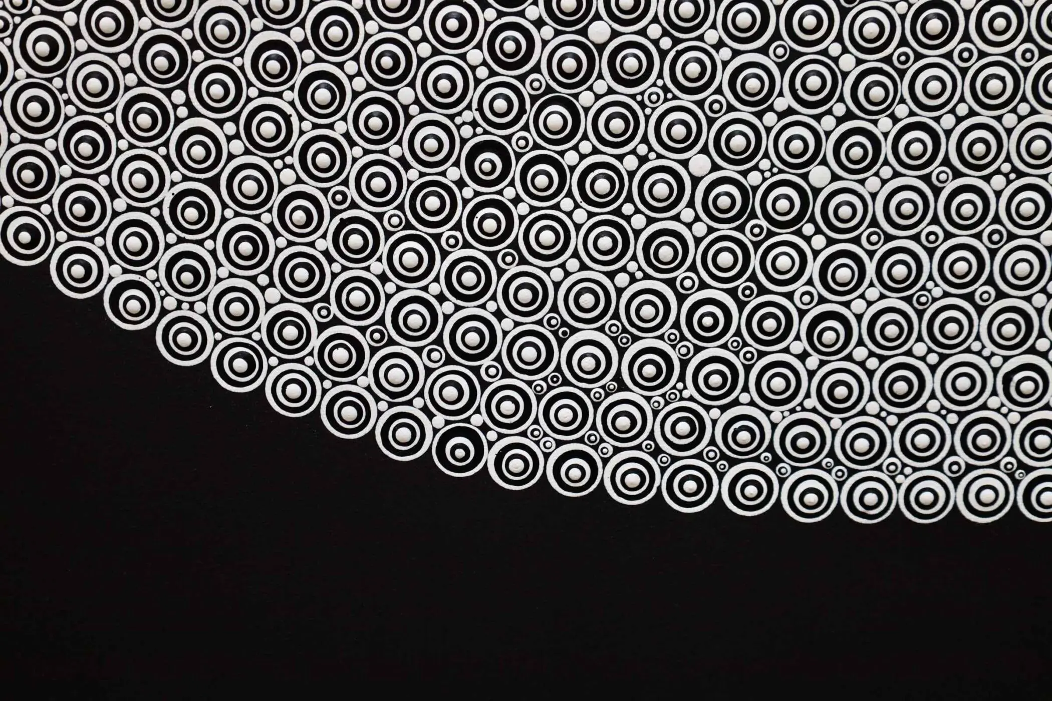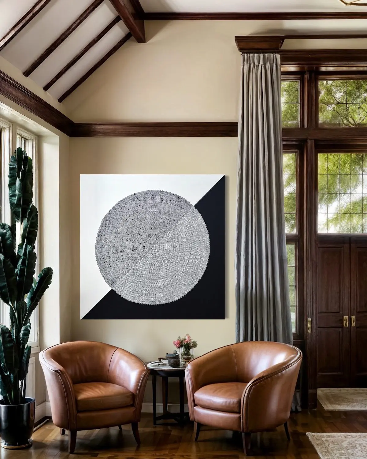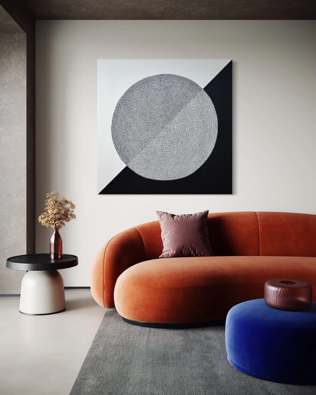 In the work “Synergy” by Ernesto Guevara the artist features an intriguing geometric composition centered on a large circle filled with multiple small, concentric rings, each made up of even smaller detailed patterns that create a sense of depth and texture. The circle dominates the composition against a sharp, diagonal background that is split into contrasting black and white sections. This stark contrast not only highlights the detail within the circle but also enhances the overall dynamic and modern aesthetic of the piece. The use of monochrome adds a timeless quality, focusing the viewer’s attention on the intricate patterns and the precision of the design.