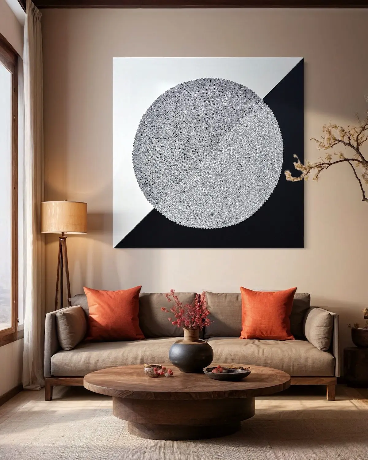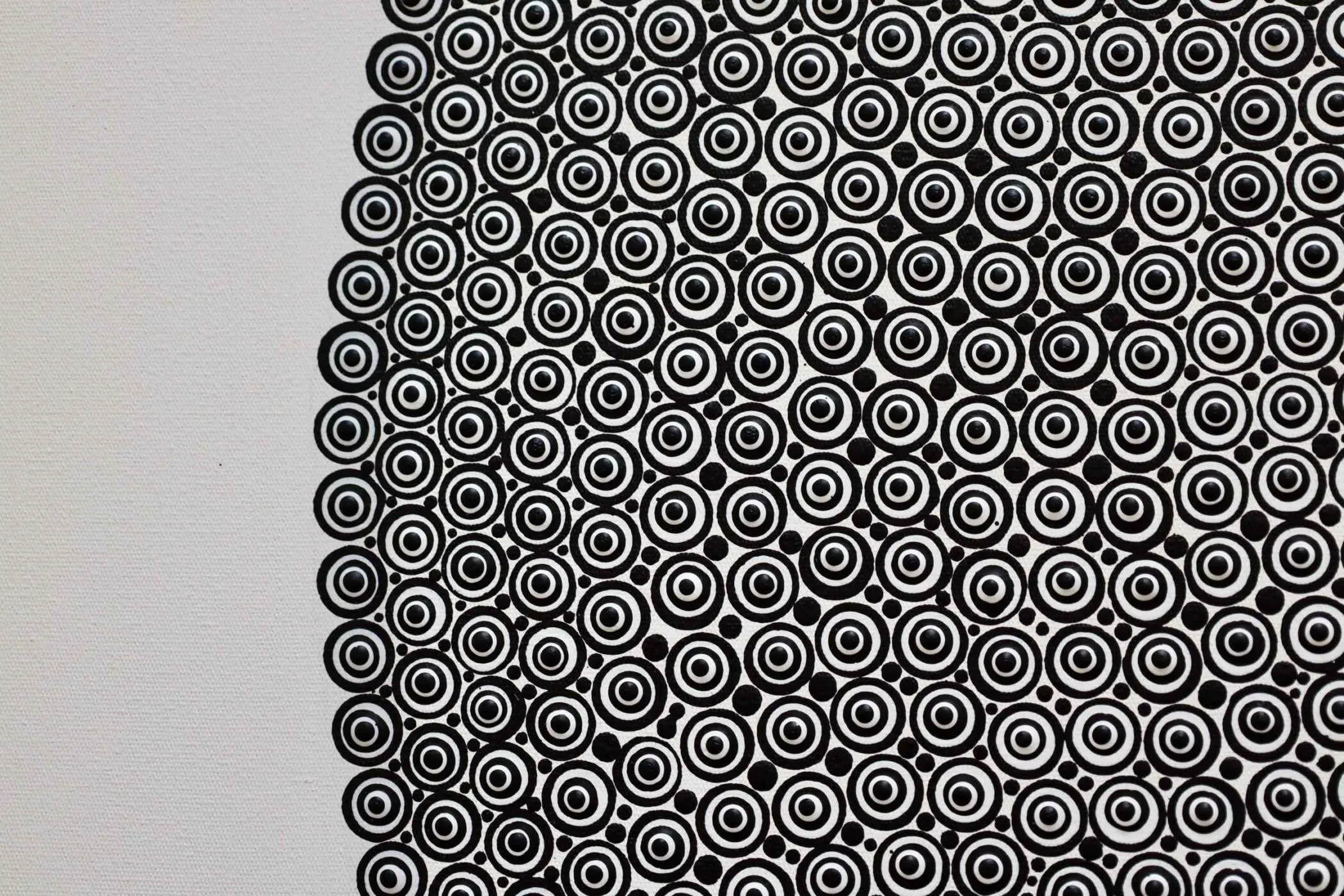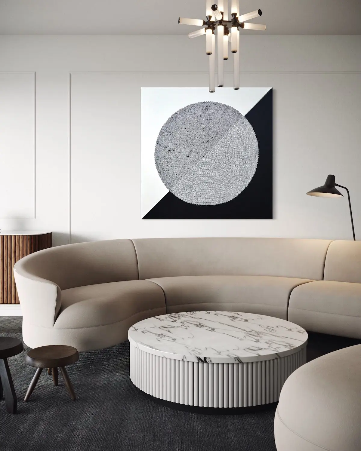In the work “Synergy” by Ernesto Guevara the artist features an intriguing geometric composition centered on a large circle filled with multiple small, concentric rings, each made up of even smaller detailed patterns that create a sense of depth and texture. The circle dominates the composition against a sharp, diagonal background that is split into contrasting black and white sections. This stark contrast not only highlights the detail within the circle but also enhances the overall dynamic and modern aesthetic of the piece. The use of monochrome adds a timeless quality, focusing the viewer’s attention on the intricate patterns and the precision of the design.