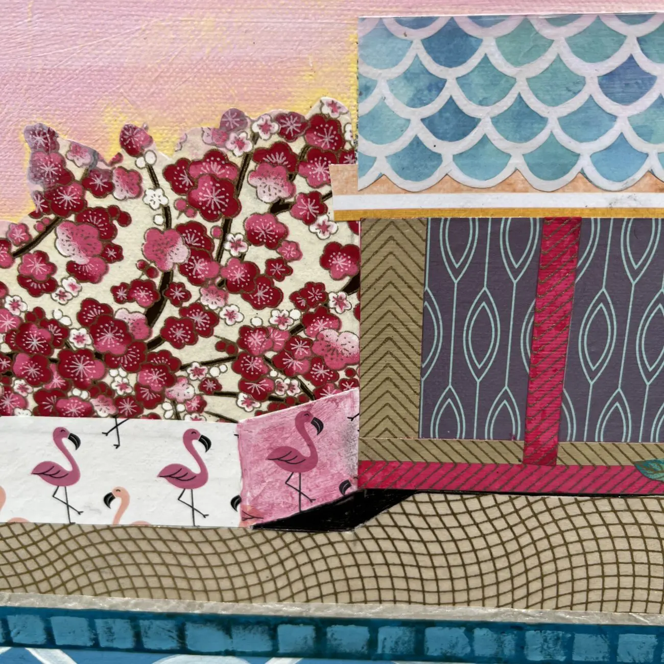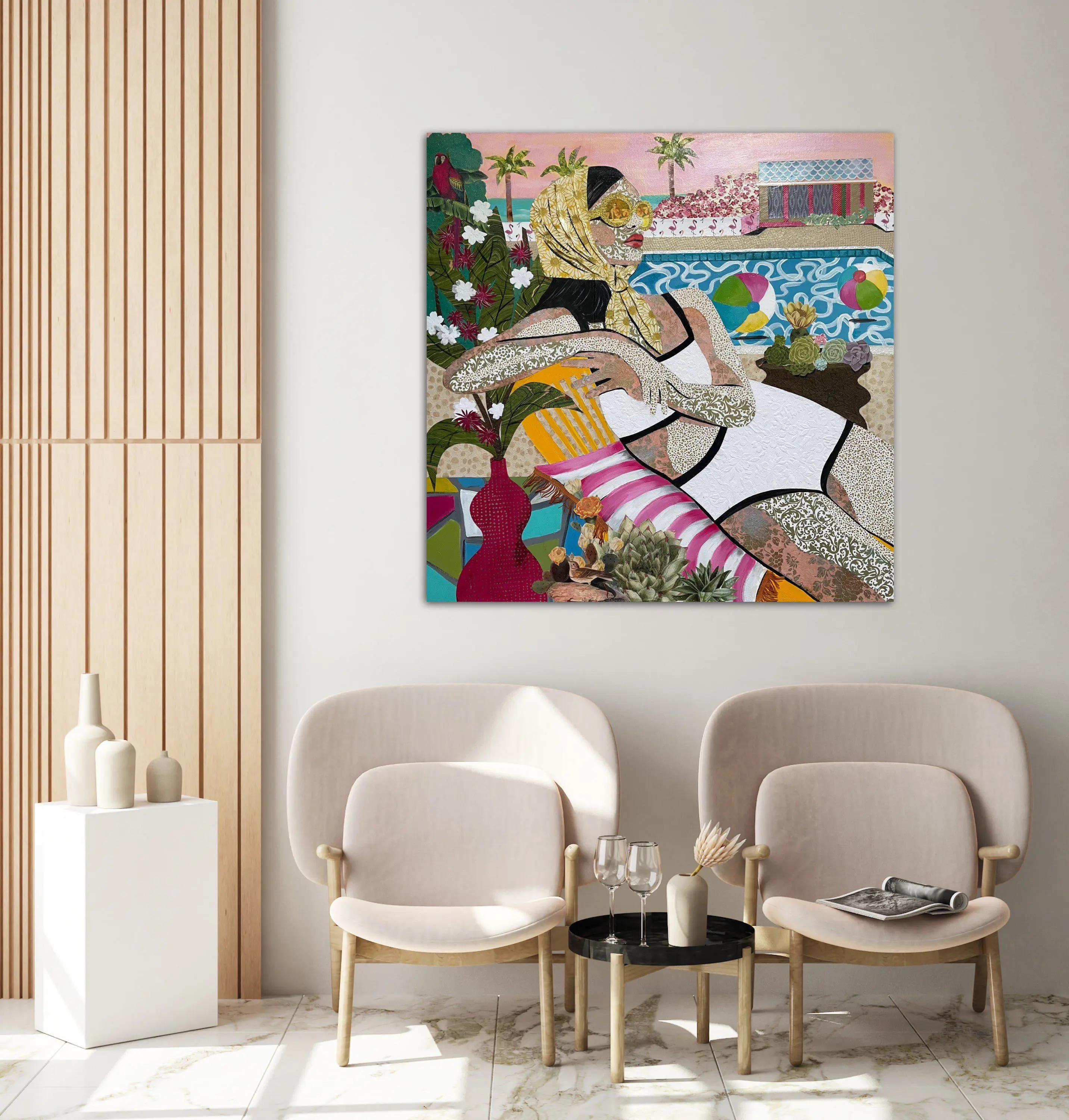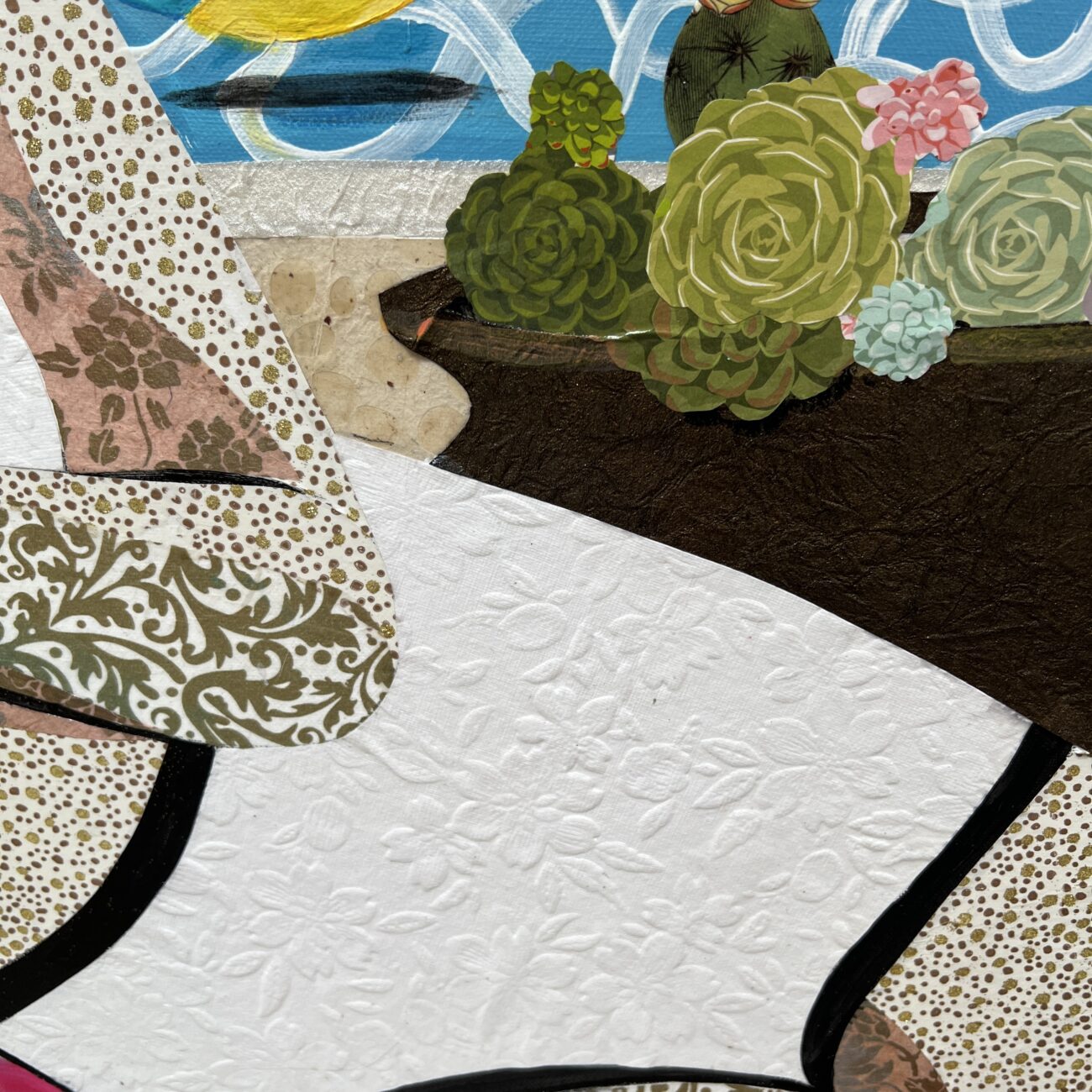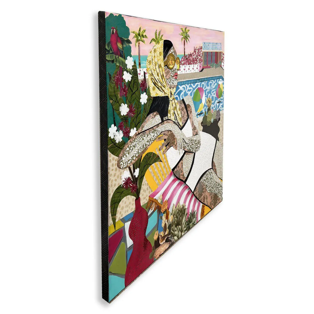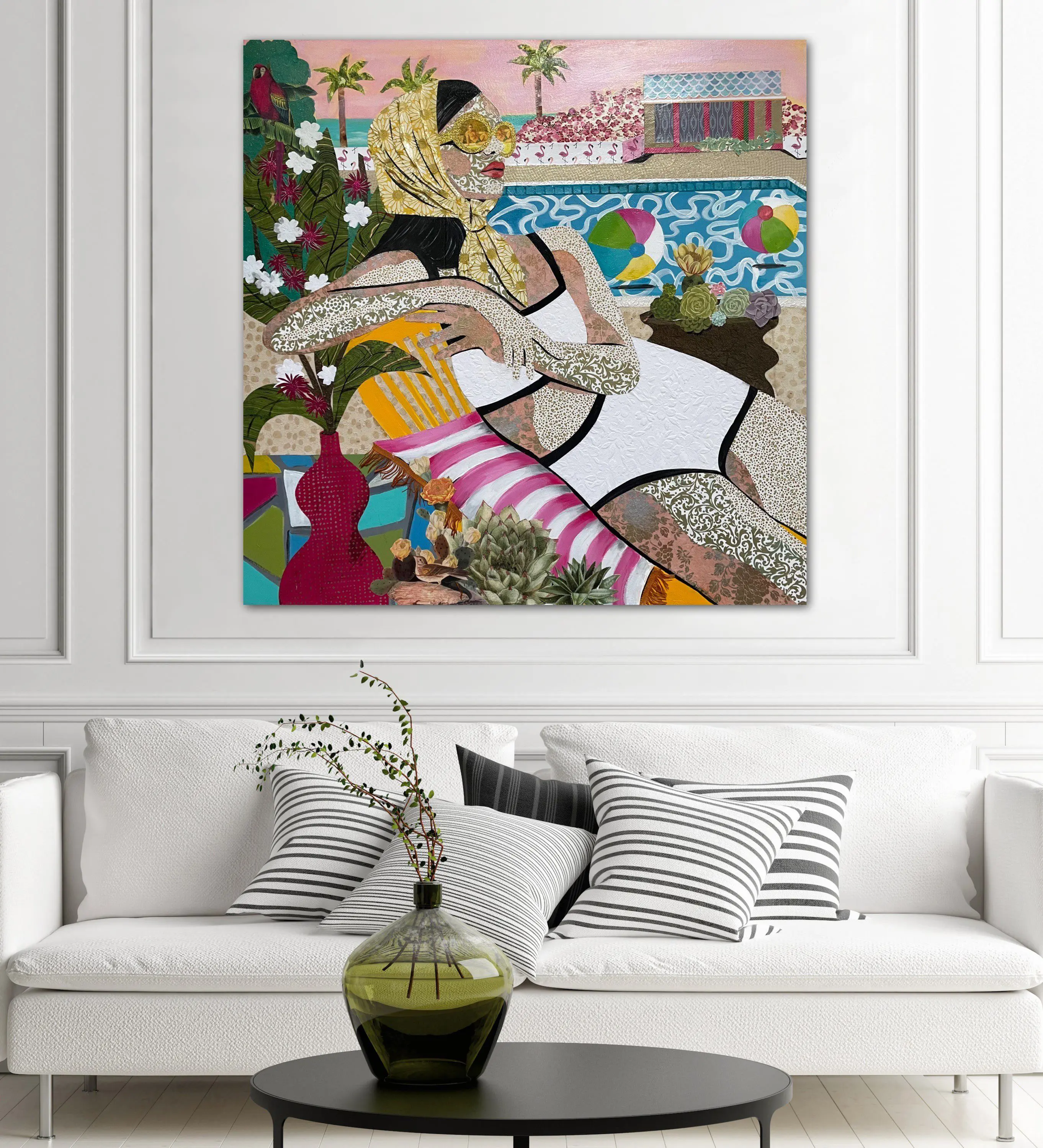 This 36 inch square original mixed media painting on canvas is stretched and ready to hang. Layers of patterned collage elements and acrylic paint bring this artwork to life. The layering and unique texture of colorful clippings and geometrical designs create a window looking into a luxurious escape perfect for any home or office. The sides of the artwork are painted and it does not require framing. It is signed and titled by the artist on the back of the artwork.
