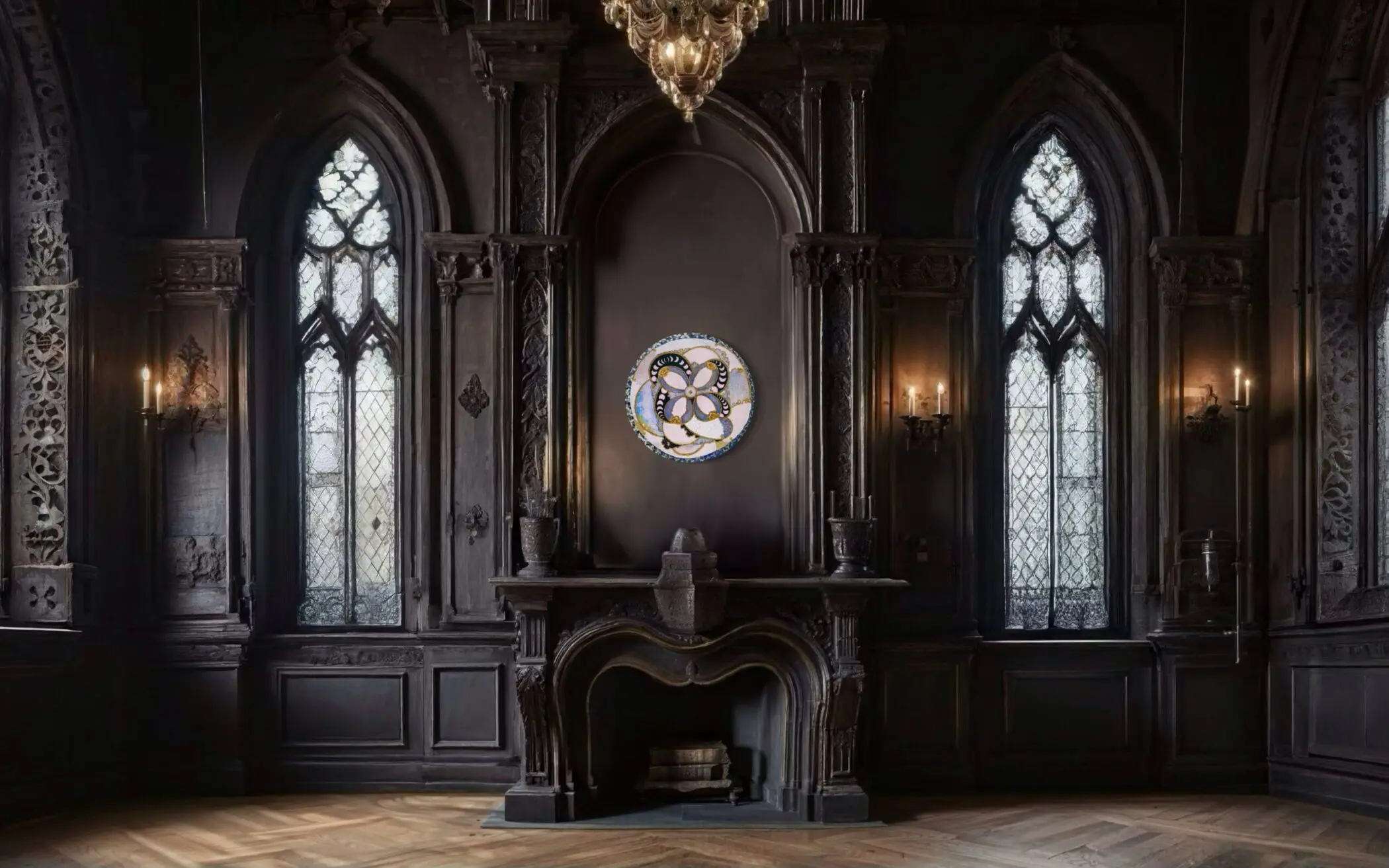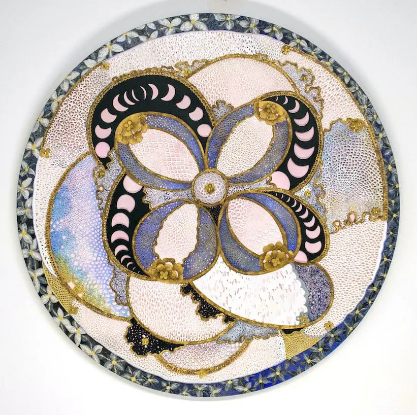The bold black and pink crescent patterns create a sense of rhythm, reminiscent of a spinning wheel, celestial orbits, or the continuous cycles of nature. Encased within a rich, decorative border, the composition exudes a sense of wholeness, a universe unto itself. The artist’s precise application of lace-like textures and gold embellishments imbues the work with both delicacy and grandeur, bridging the gap between the ethereal and the ornate.