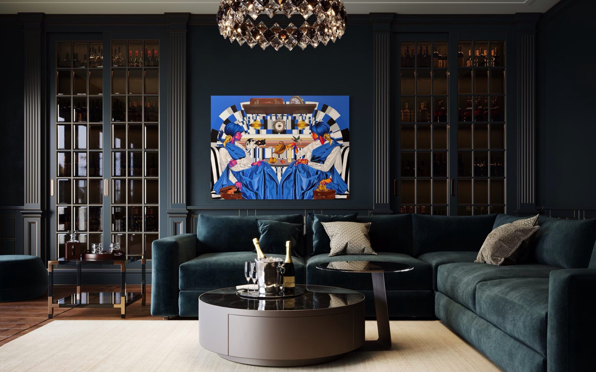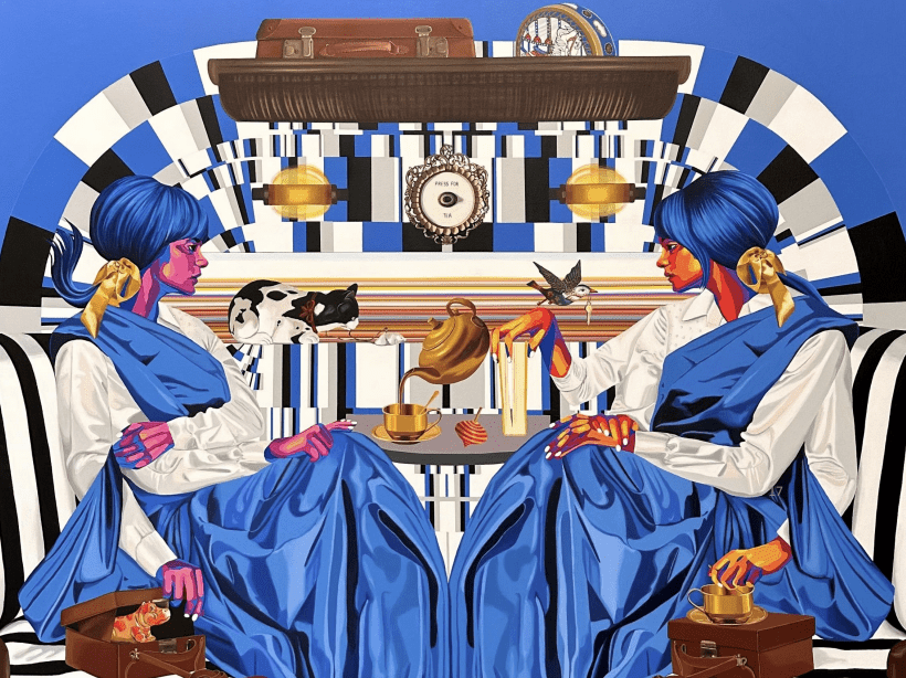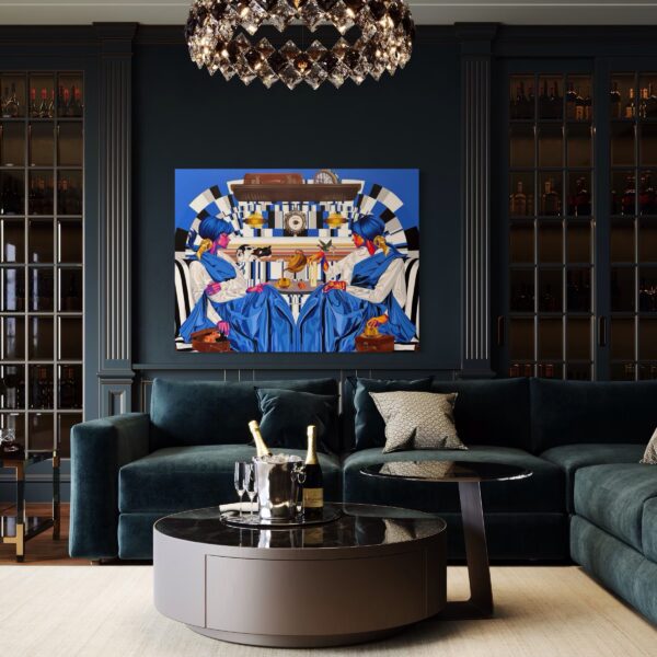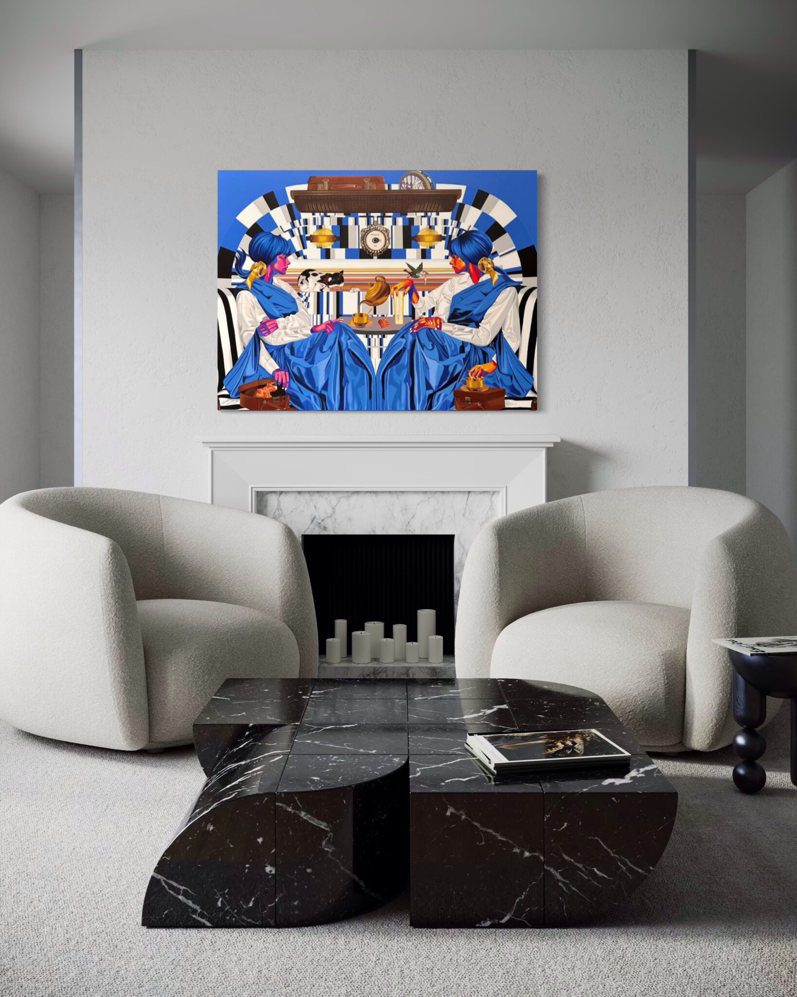 The artist’s sharp, hyper-stylized realism, combined with a bold contemporary color palette, places this work in dialogue with postmodern portraiture and contemporary surrealism. Kumar challenges the viewer to navigate the boundaries between reality and artifice, the familiar and the uncanny, creating a piece that is both aesthetically commanding and conceptually rich. Above all else, “Two For Tea, Change For One” is an invitation to decode a world of hidden symbols, layered narratives, and the interplay between structure and chaos.