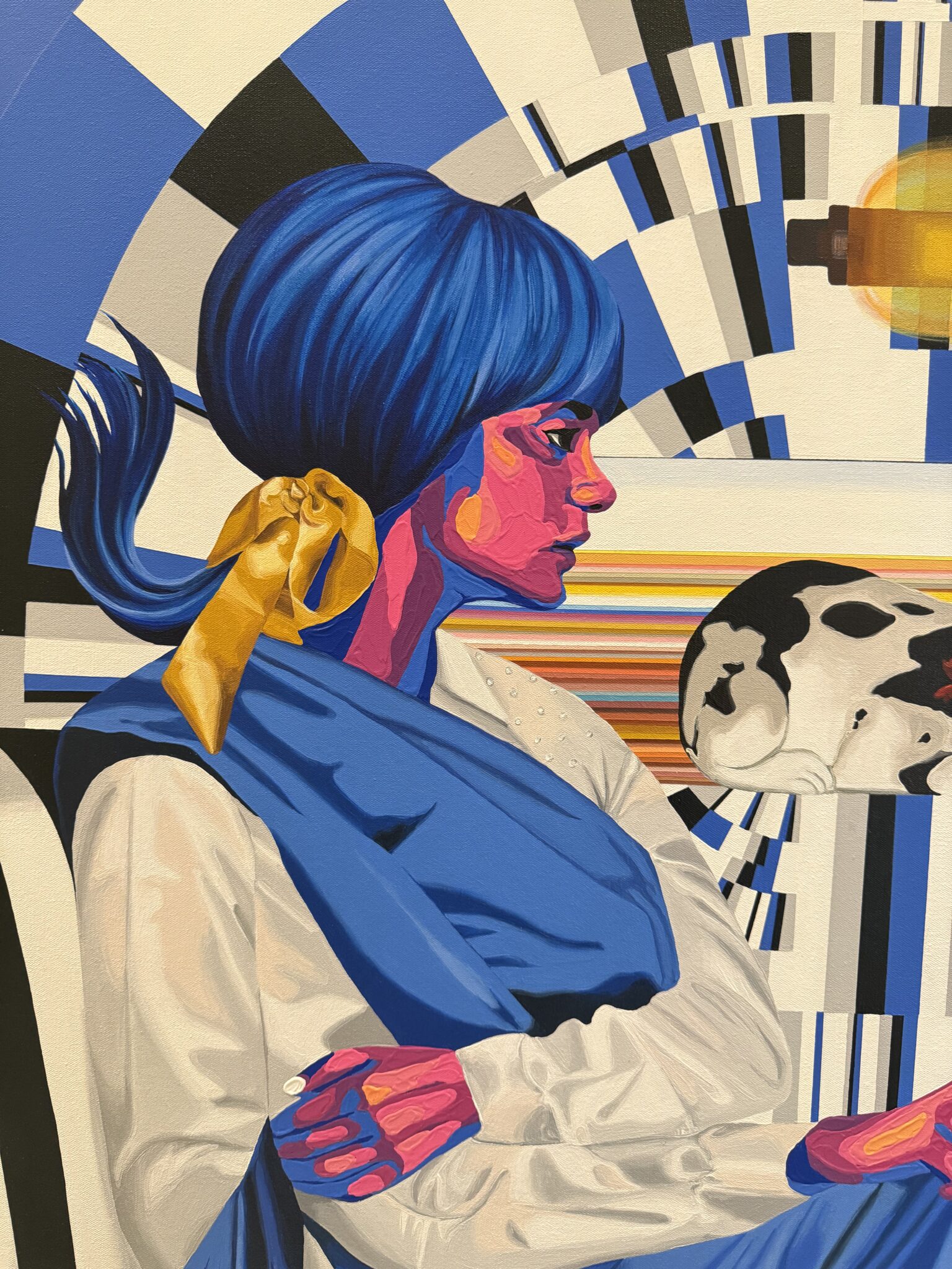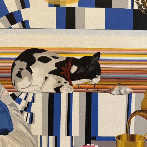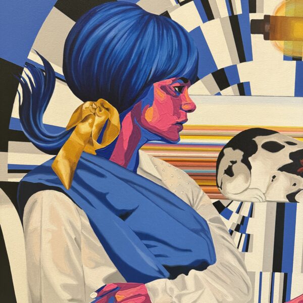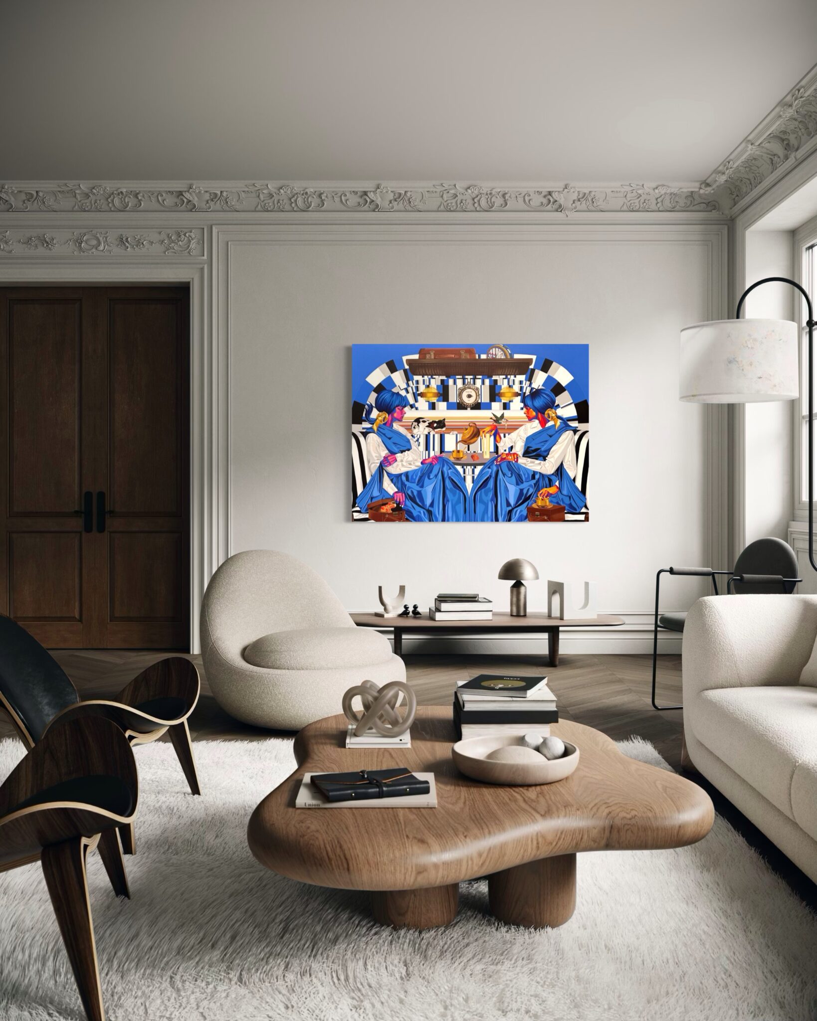The artist’s sharp, hyper-stylized realism, combined with a bold contemporary color palette, places this work in dialogue with postmodern portraiture and contemporary surrealism. Kumar challenges the viewer to navigate the boundaries between reality and artifice, the familiar and the uncanny, creating a piece that is both aesthetically commanding and conceptually rich. Above all else, “Two For Tea, Change For One” is an invitation to decode a world of hidden symbols, layered narratives, and the interplay between structure and chaos.