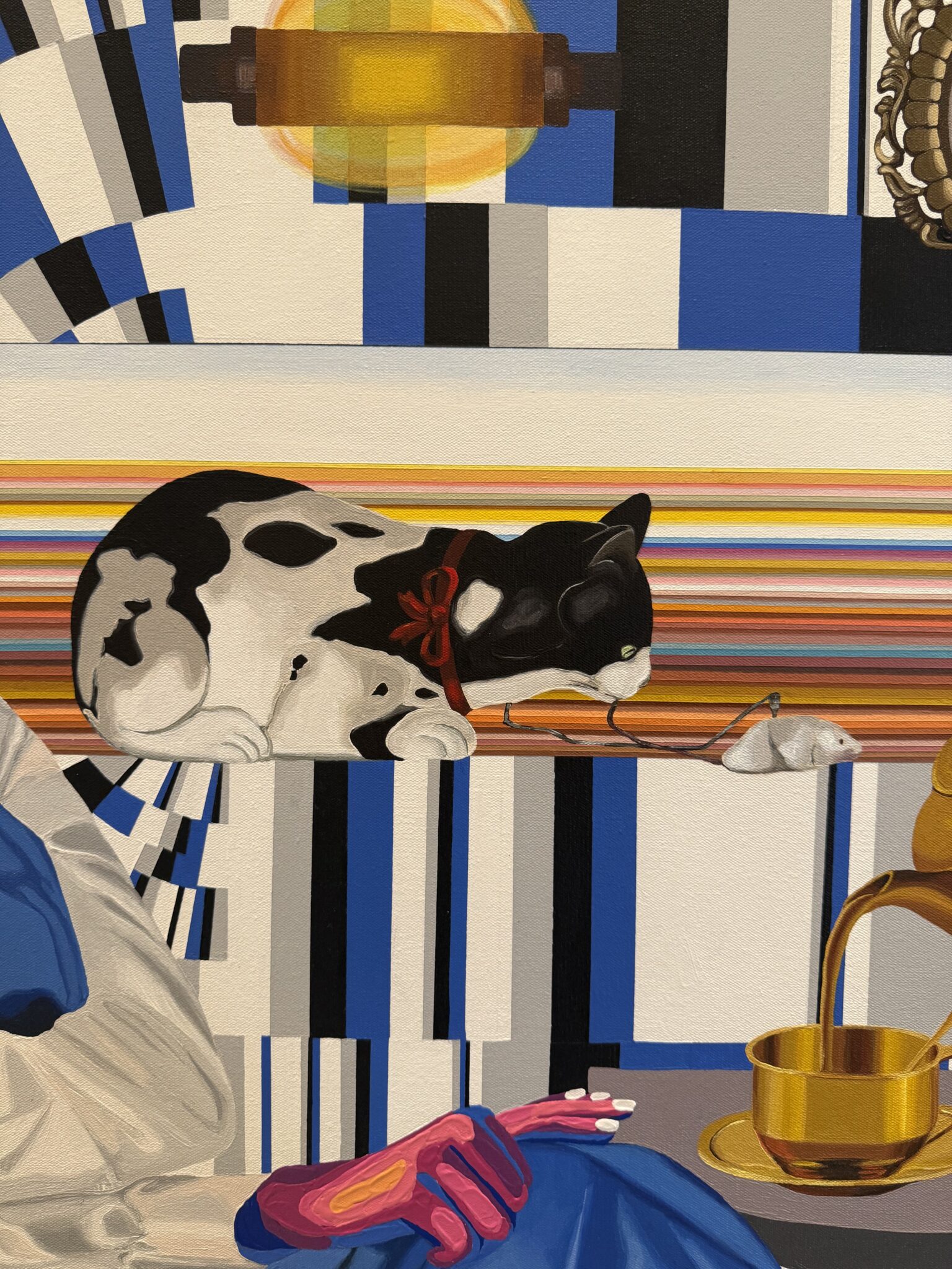 Set within what appears to be the luxurious interior of a train compartment, the background dissolves into a dizzying matrix of black, white, and blue geometric patterns, echoing the aesthetics of Op Art and Modernist design. The theatricality of the space is heightened by the meticulously placed symbolic elements—a resting cat, a golden tea set, a hovering bird with a key, and a vintage “Press for Tea” button—all suggesting a scene that transcends mere domesticity, hinting at hidden narratives of power, secrecy, and ritual.