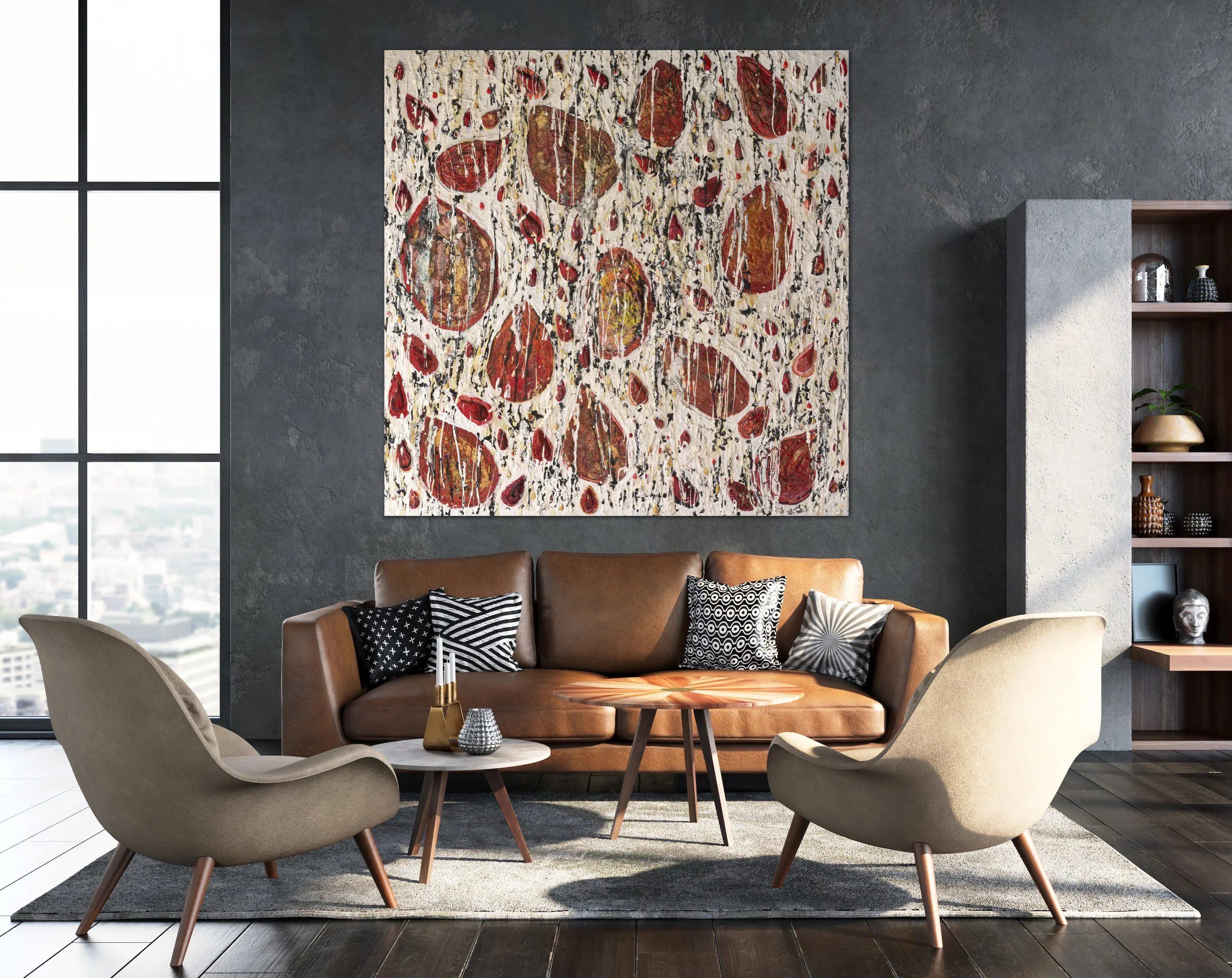 In Tears of Joy, Haleh Mashian captures the emotional intensity of celebration through a richly textured, layered surface. Vivid crimson forms—reminiscent of teardrops or blossoming petals—float across a luminous field of white and cream, animated by spontaneous drips and intricate material layering. The surface hums with energy, translating the complexity of joy into a tactile, visual experience.