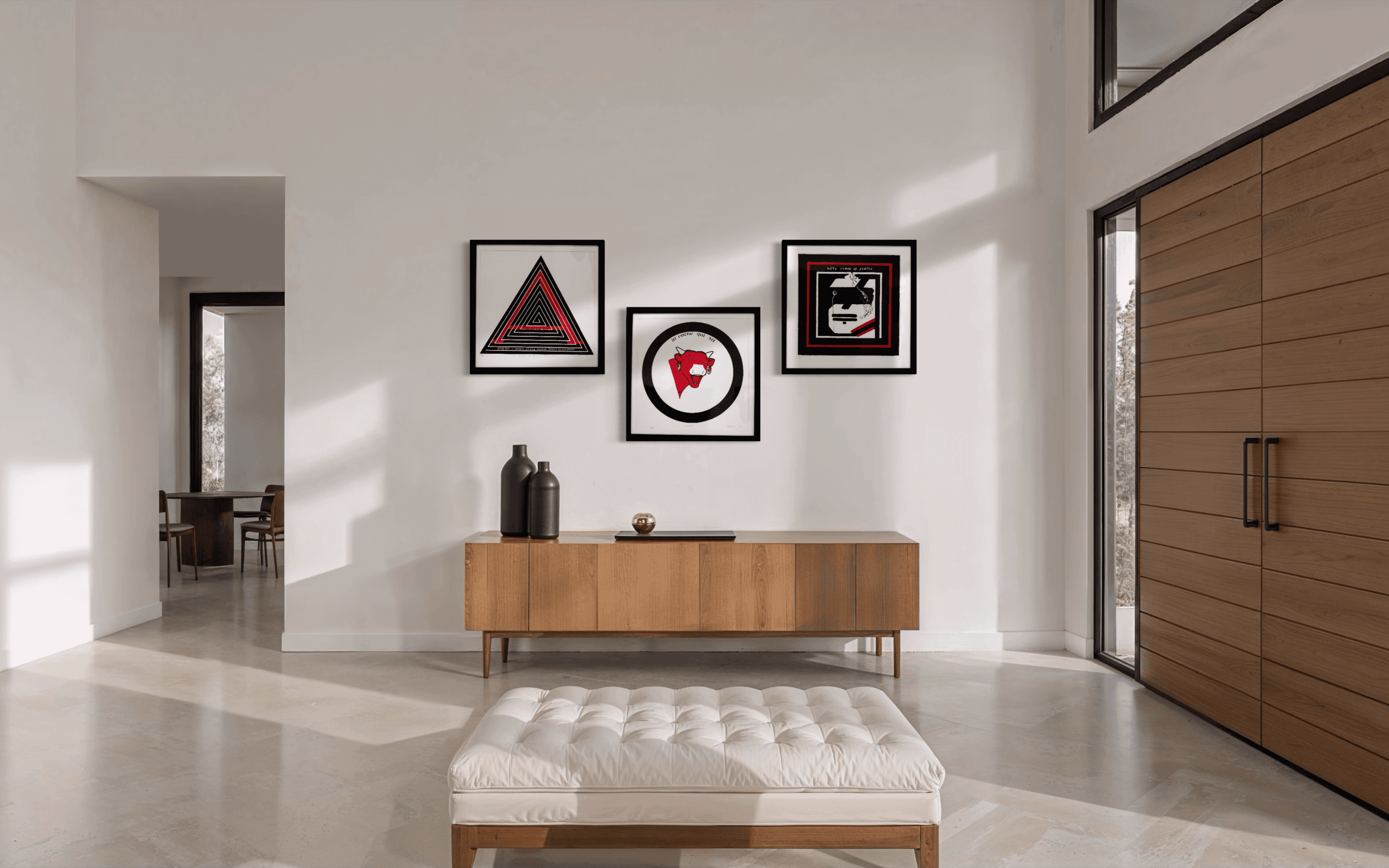 This triptych brings together three hand-made silkscreens unified by a restrained palette of black, white, and red, and a shared investigation into geometry, symbol, and psychological tension. Drawing from Constructivist, Op Art, and postwar European graphic traditions, the works explore how form, repetition, and iconography communicate emotion and meaning without narrative. Presented together, the three panels create a cohesive visual rhythm while maintaining distinct identities, making the triptych both architecturally strong and conceptually layered.