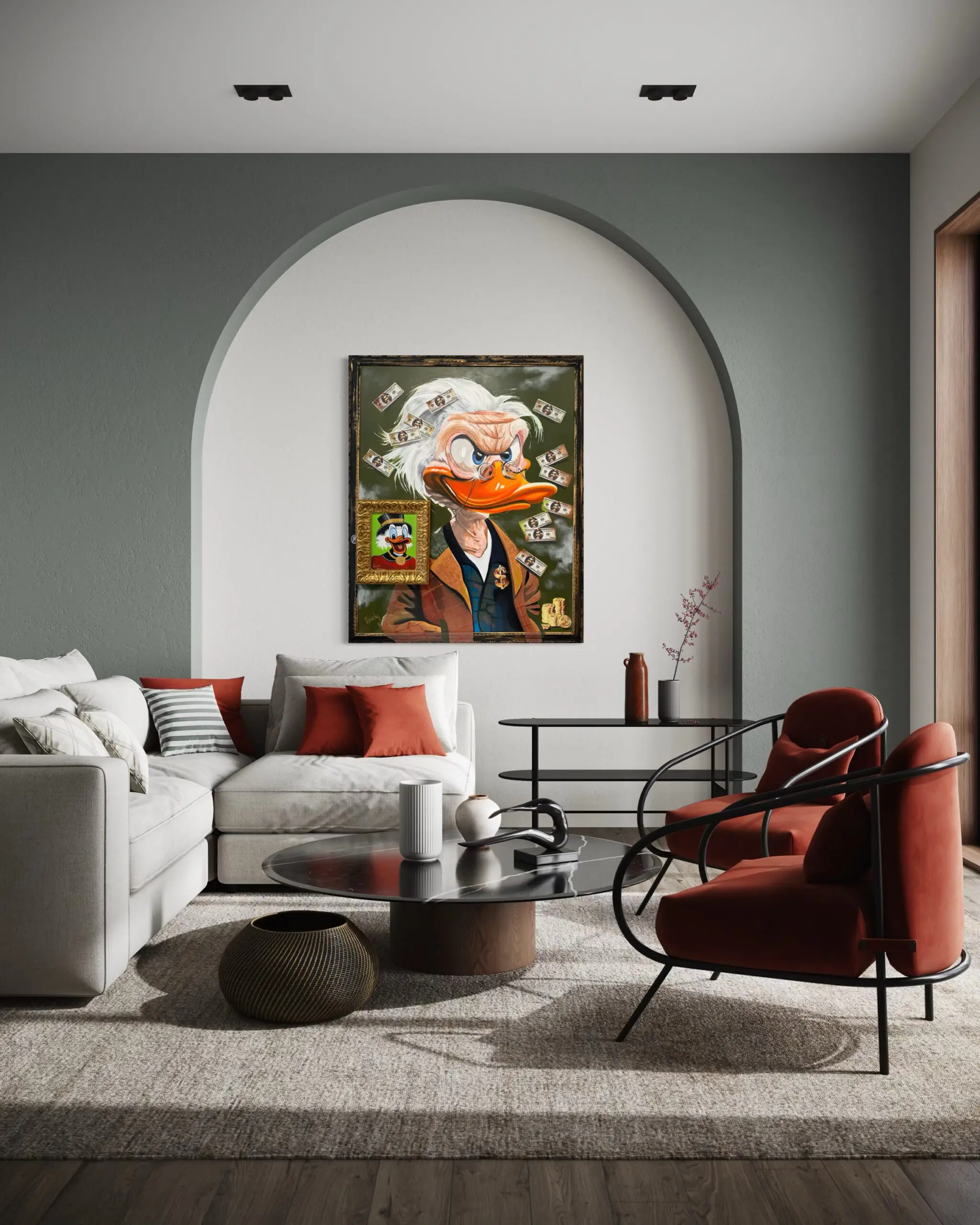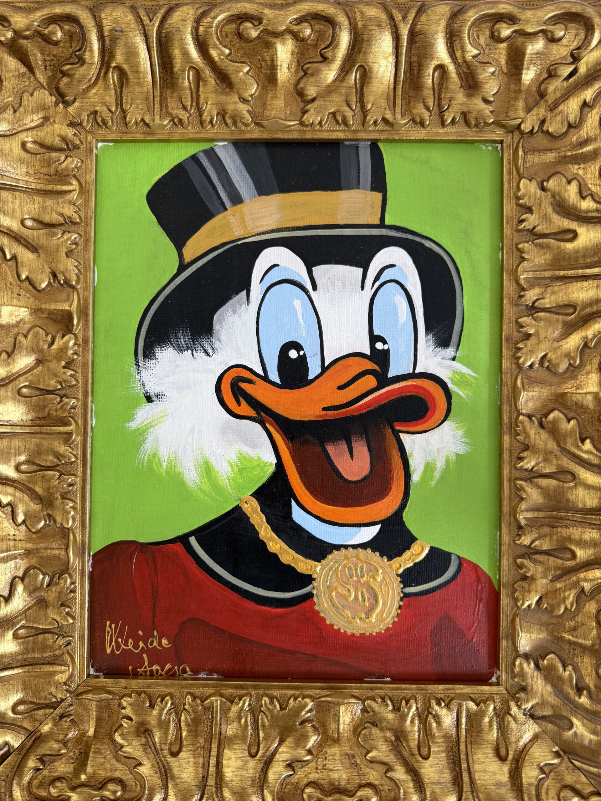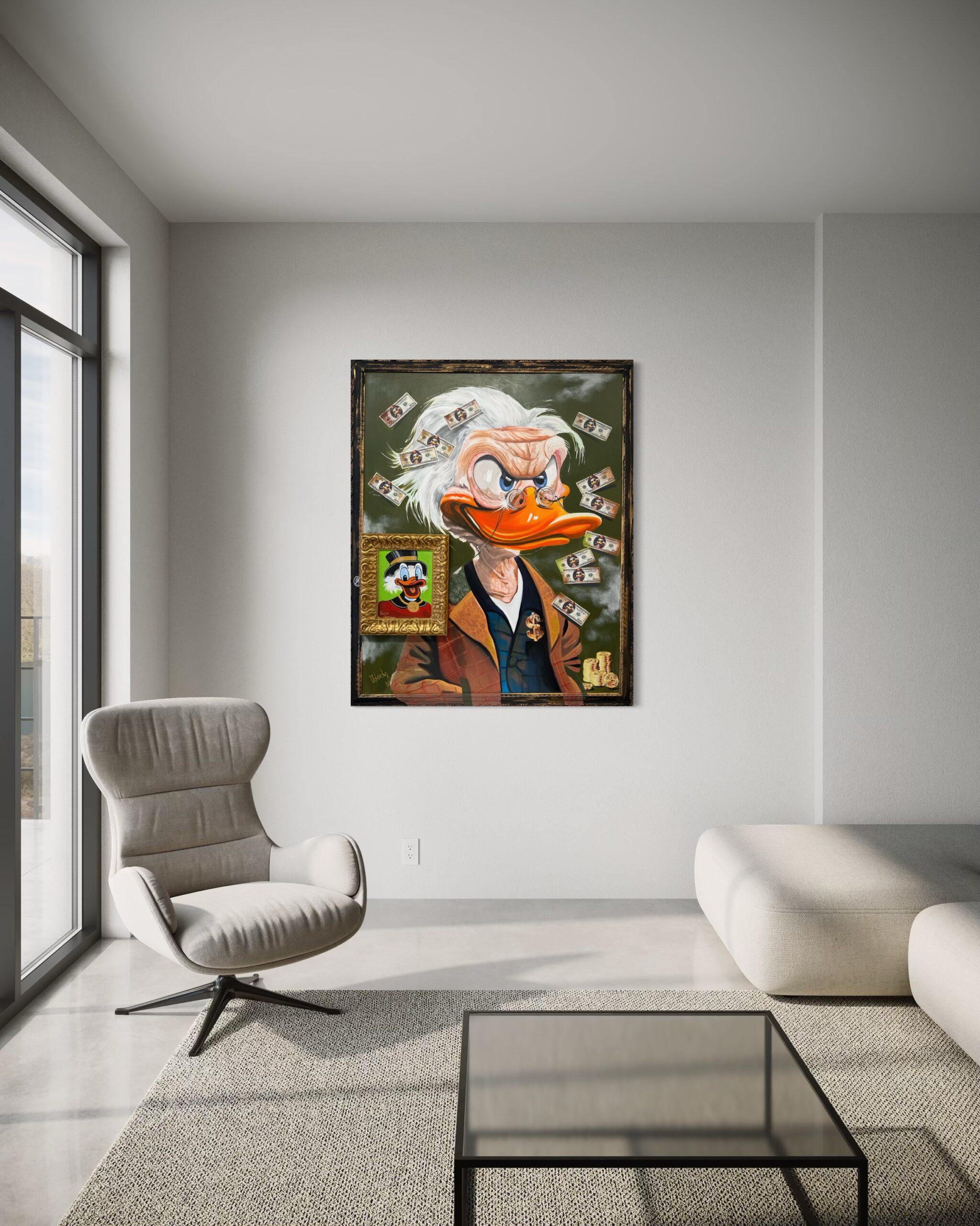 The character is dressed in a richly textured plaid coat and wears a dollar-sign badge, echoing themes of wealth, greed, and transformation. A golden inset frame holds the original version of Scrooge McDuck in his classic cartoon form, wide-eyed and smiling—juxtaposing innocence with the aged, more cynical version who now dominates the canvas. Stacks of gold coins and smoke curling through the background enhance the piece’s narrative tension and theatrical flair.