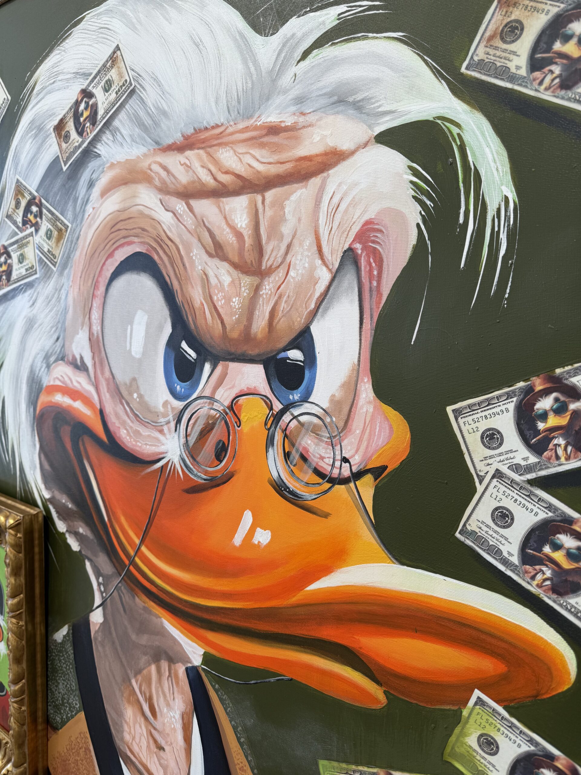 Scrooge McDuck is reimagined through a pop surrealist lens, transformed from a cheerful cartoon billionaire into a hardened, elder capitalist with wild white hair and furrowed features. His expression is intense, his eyes narrowed behind a pair of wired spectacles, hinting at decades of financial conquest and capitalist cunning. Dollar bills rain across the dark green backdrop, each embedded with a warped likeness of the iconic duck, merging money, ego, and legacy into one charged visual narrative.