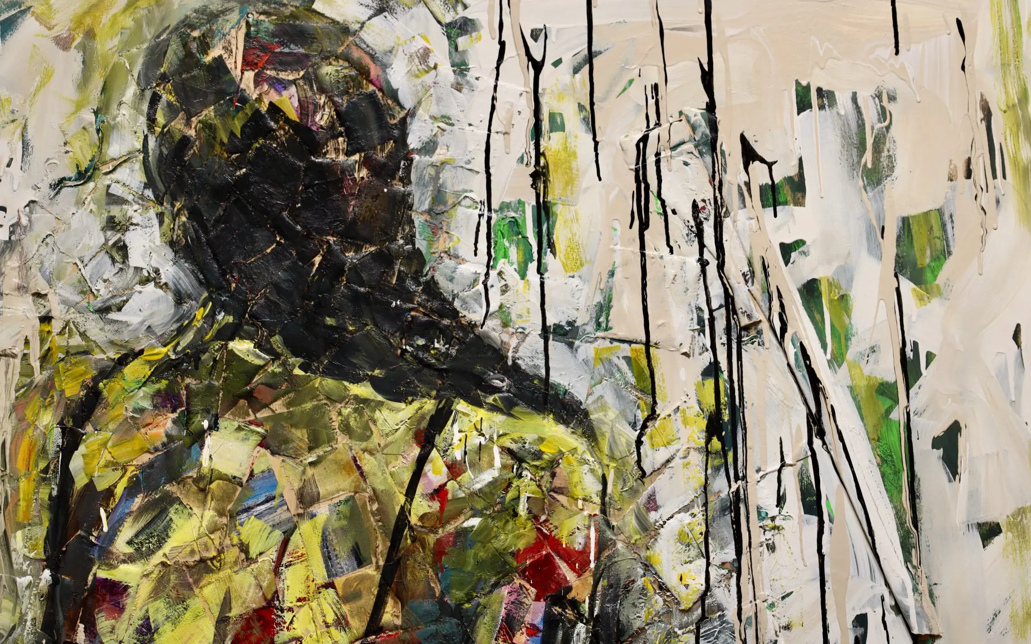 Layered textures and collage elements build the figure’s form, symbolizing the memories, challenges, and growth that shape her. Behind her, a backdrop of vertical drips and geometric fragments suggests the passage of time—where the past dissolves into fluid motion and the future begins to crystallize. Muted tones of cream and black anchor the scene, while flashes of yellow and blue inject a sense of energy and momentum.