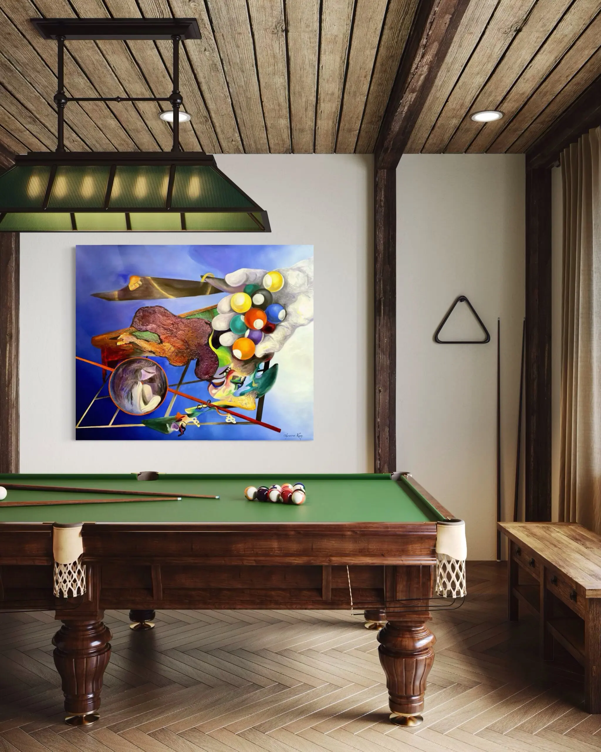 At the core of this visually arresting surrealist artwork, an oversized, spectral hand clutches a cluster of billiard balls, their reflective surfaces glistening with potential energy and inevitable consequence. Detached from any visible figure, the hand becomes an allegory for manipulation, destiny, and the unseen forces that govern life’s unpredictable nature. This central motif immediately evokes themes of gambling, decision-making, and the fine line between mastery and luck.