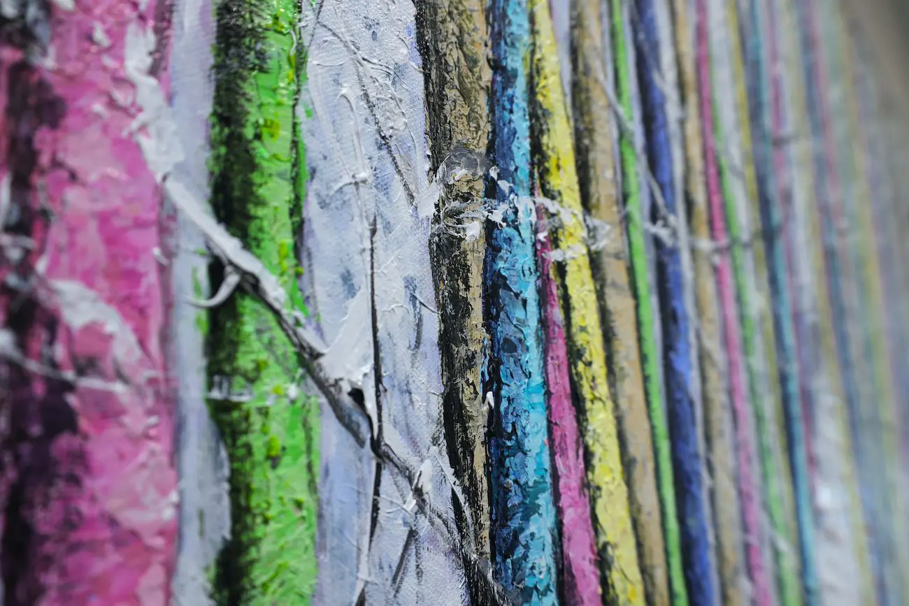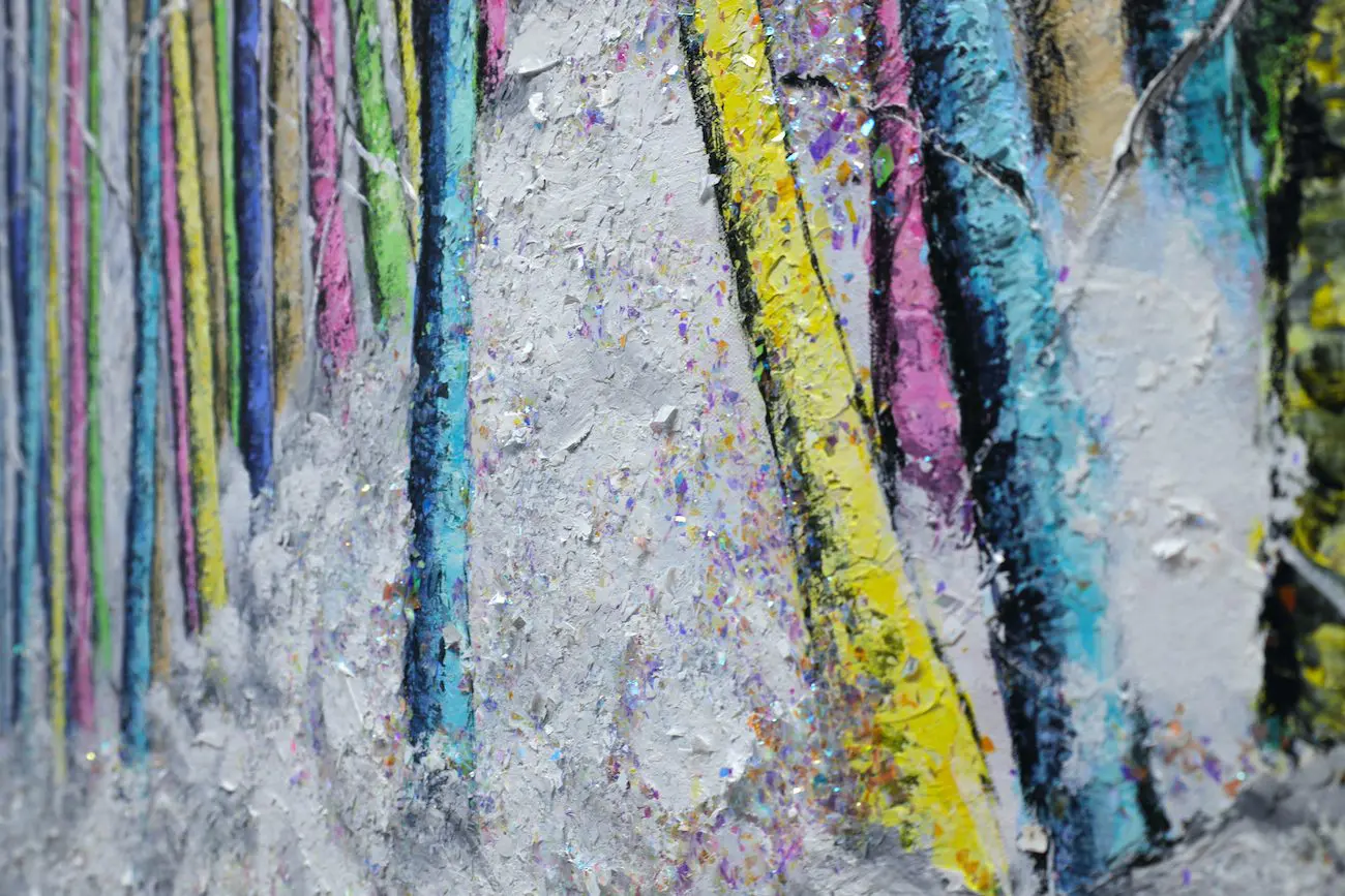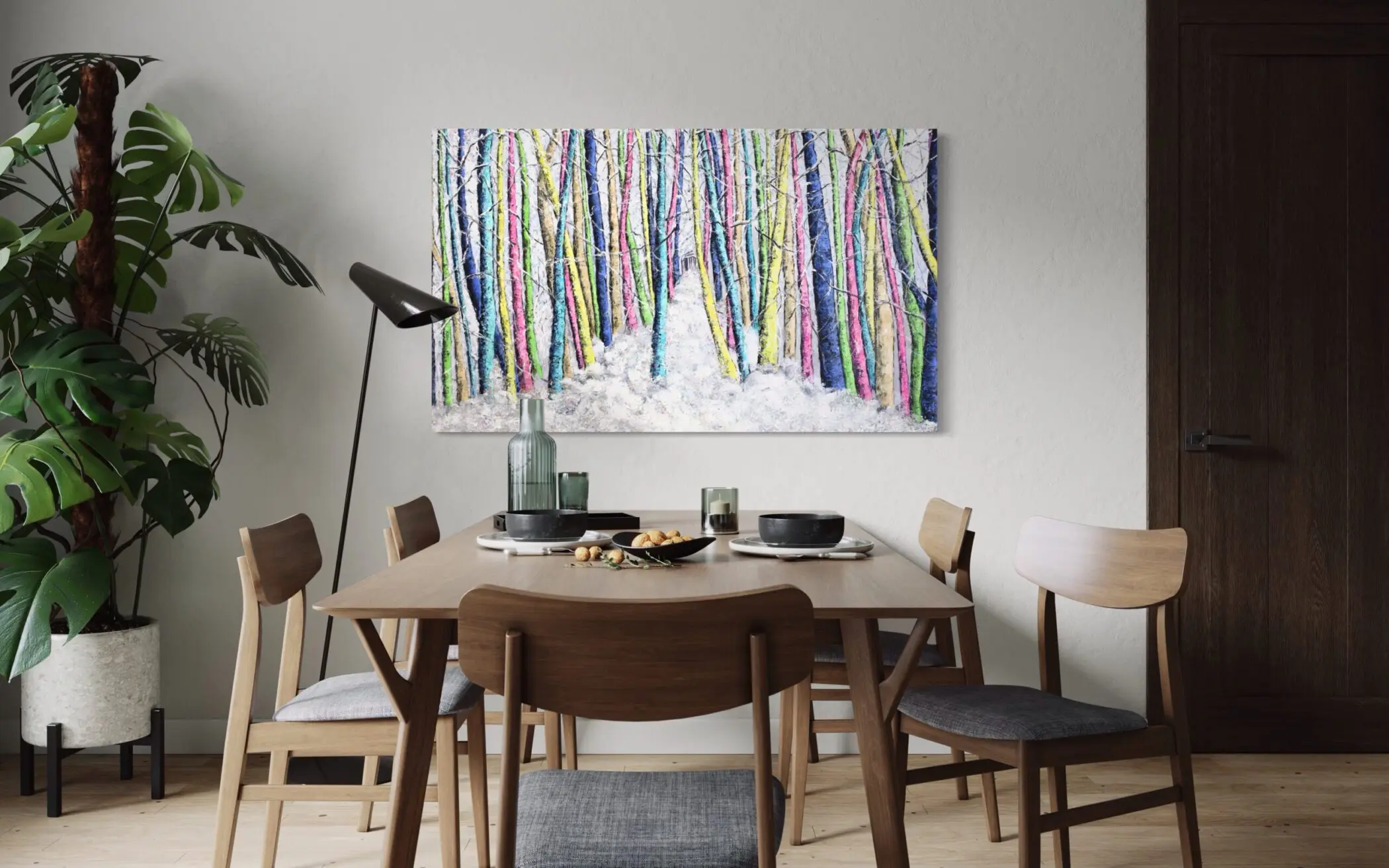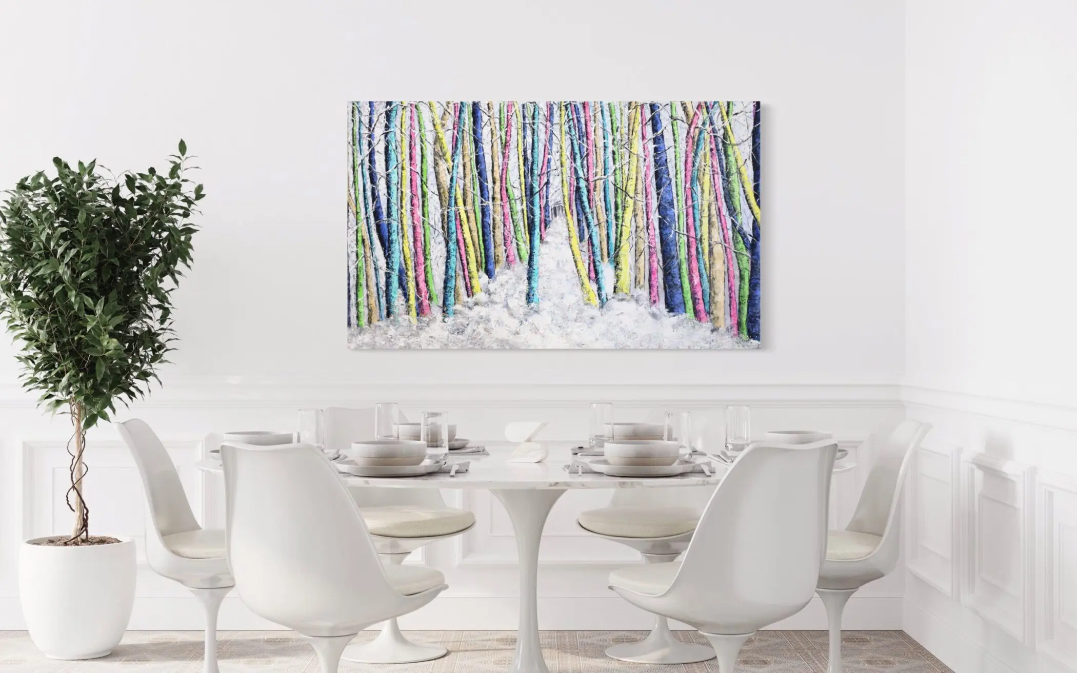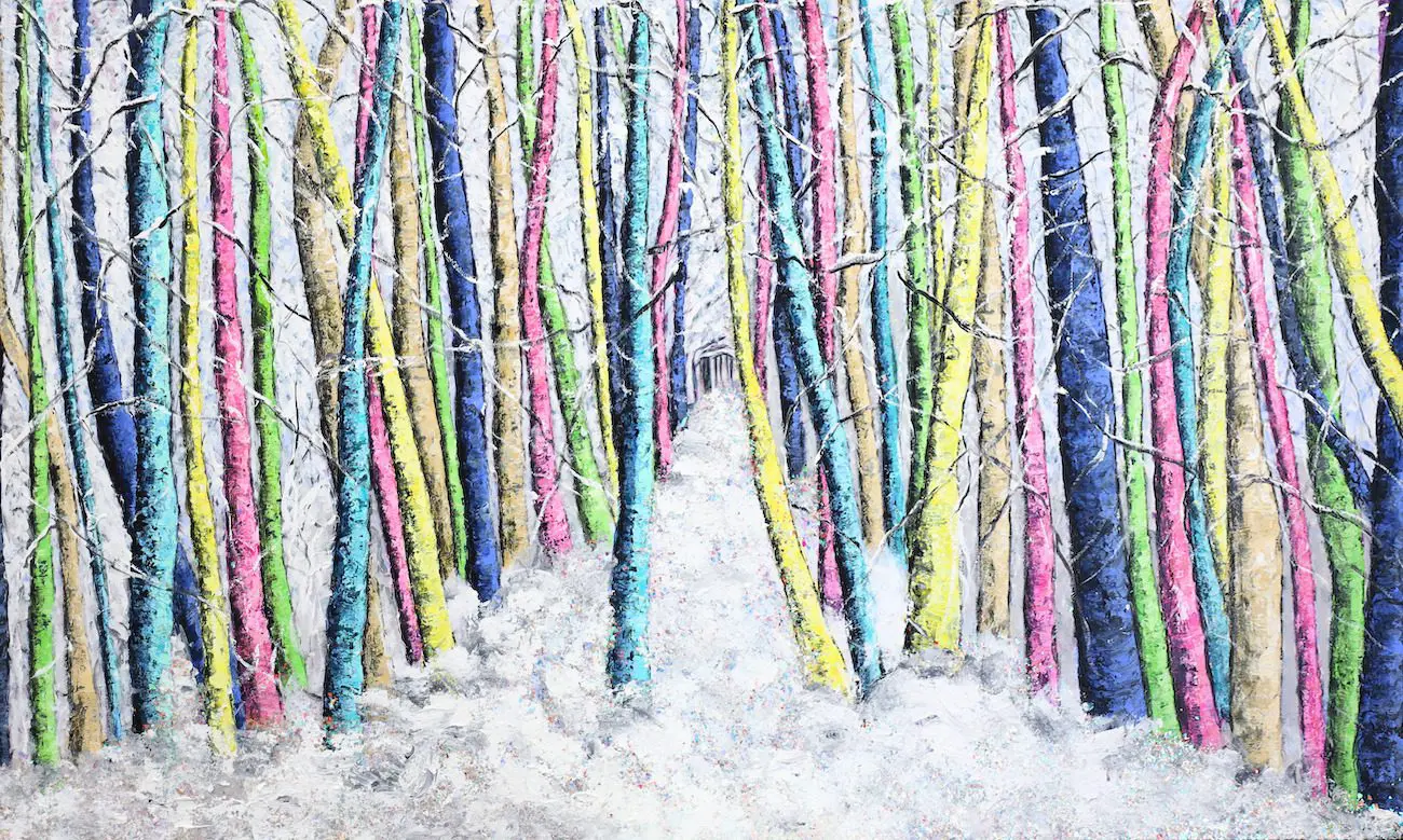 Haleh Mashian’s “The Lush Winter” transforms a traditionally monochromatic season into a symphony of color and texture. The forest, blanketed in snow, glows with an unexpected vibrancy as tree trunks burst with electric blues, radiant pinks, and luminous yellows. The juxtaposition of cool whites against these bold hues creates a sense of energy, as if winter itself has been infused with new life.