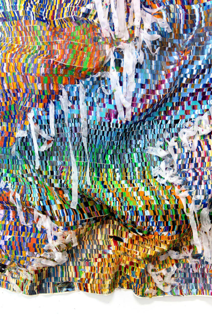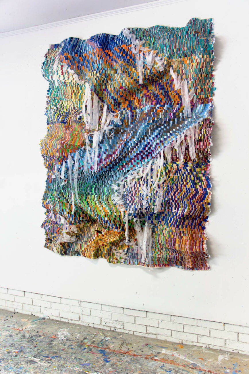 Nguyen creates what he calls “deconstructed paintings,” large, bold works that are comprised of hundreds of silk strips, which he cuts, paints, and meticulously applies onto canvas. The pieces may be hung in different iterations: sculpturally on the wall with undulations or flat, stretched like a painting on bars or behind glass.