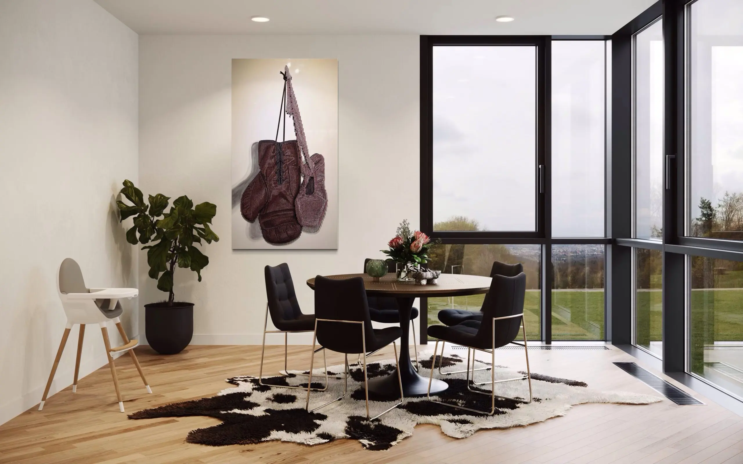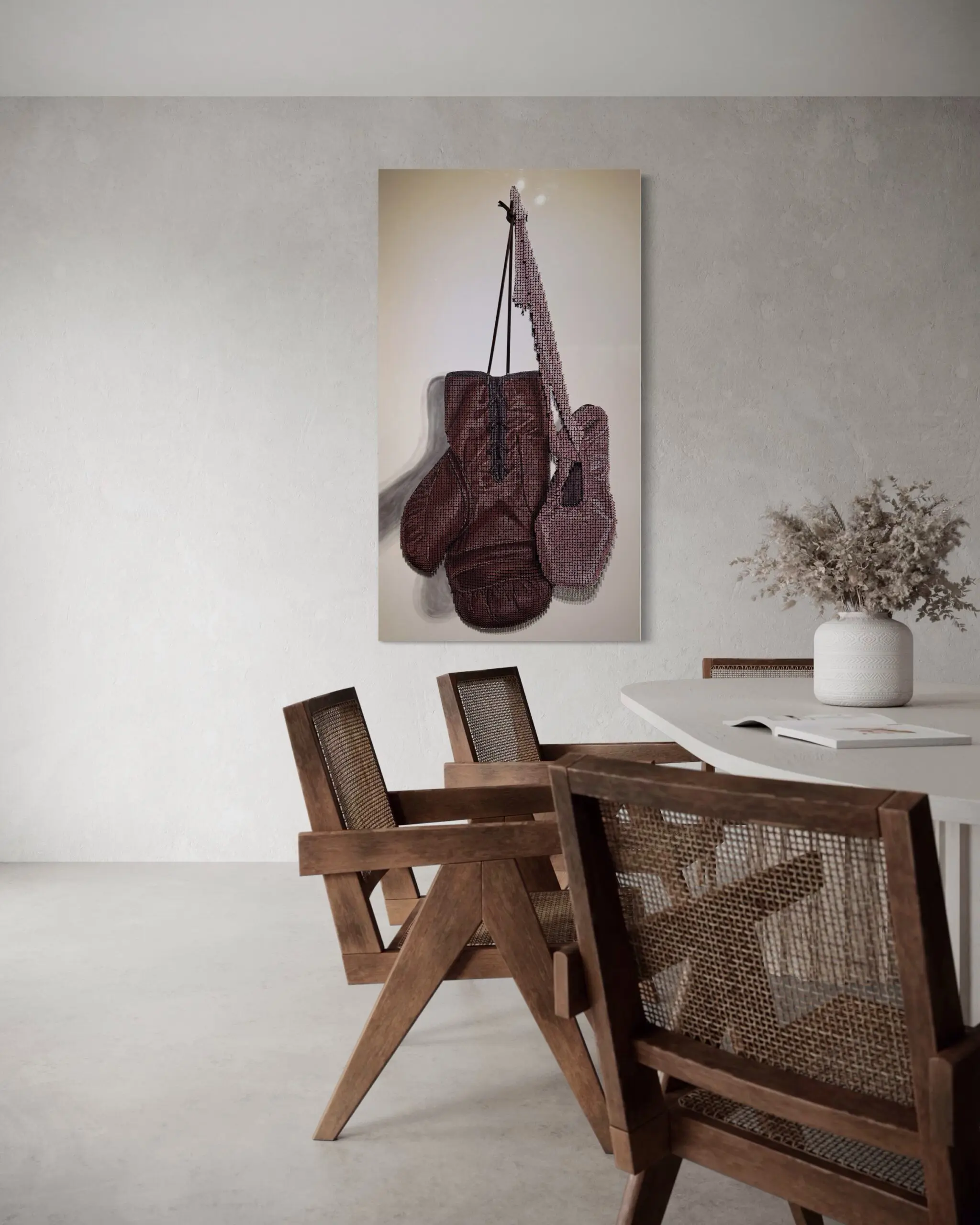 The boxing glove, rendered in deep, rich browns, symbolizes discipline, perseverance, and the physical toll of battle—whether in the ring or in life itself. Suspended from its laces, it conveys both a moment of rest and the lingering tension of an unfinished fight. In contrast, the ballet slipper, embodies the vulnerability of artistic expression: a universal emblem of creativity, passion, endurance, and vulnerability, which reinforces the sacrifices required in the pursuit of art.