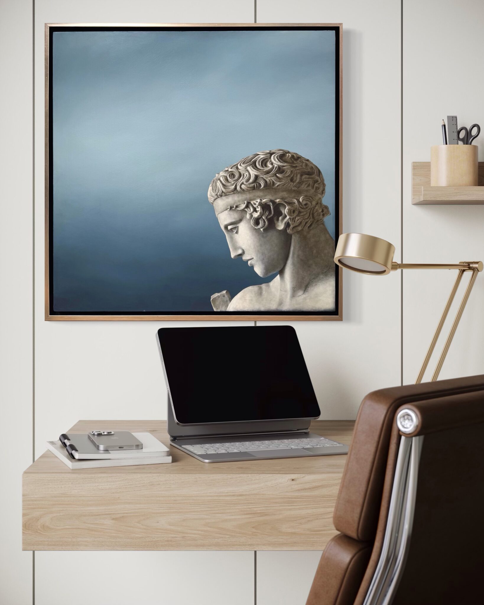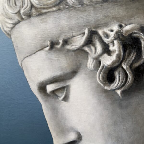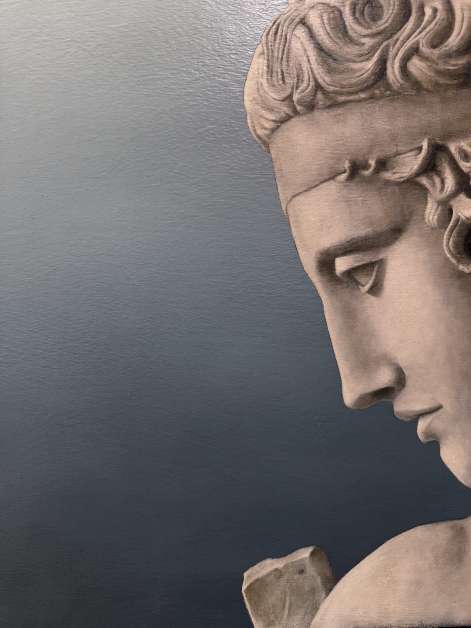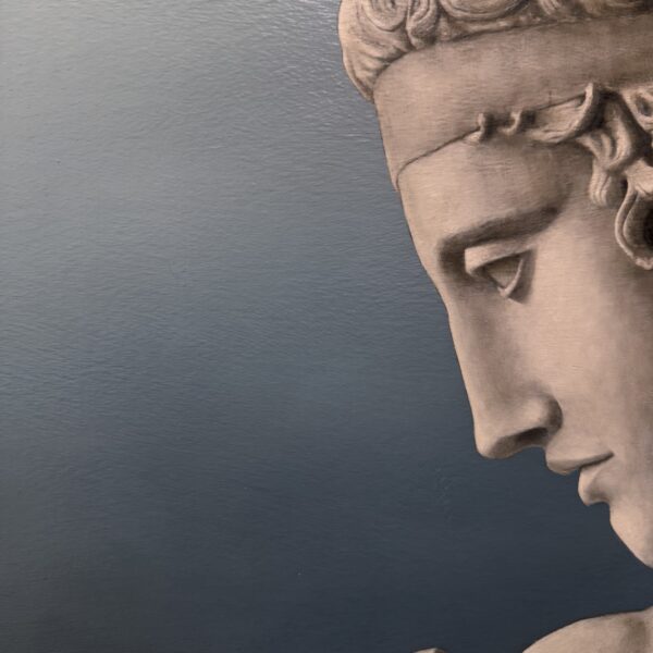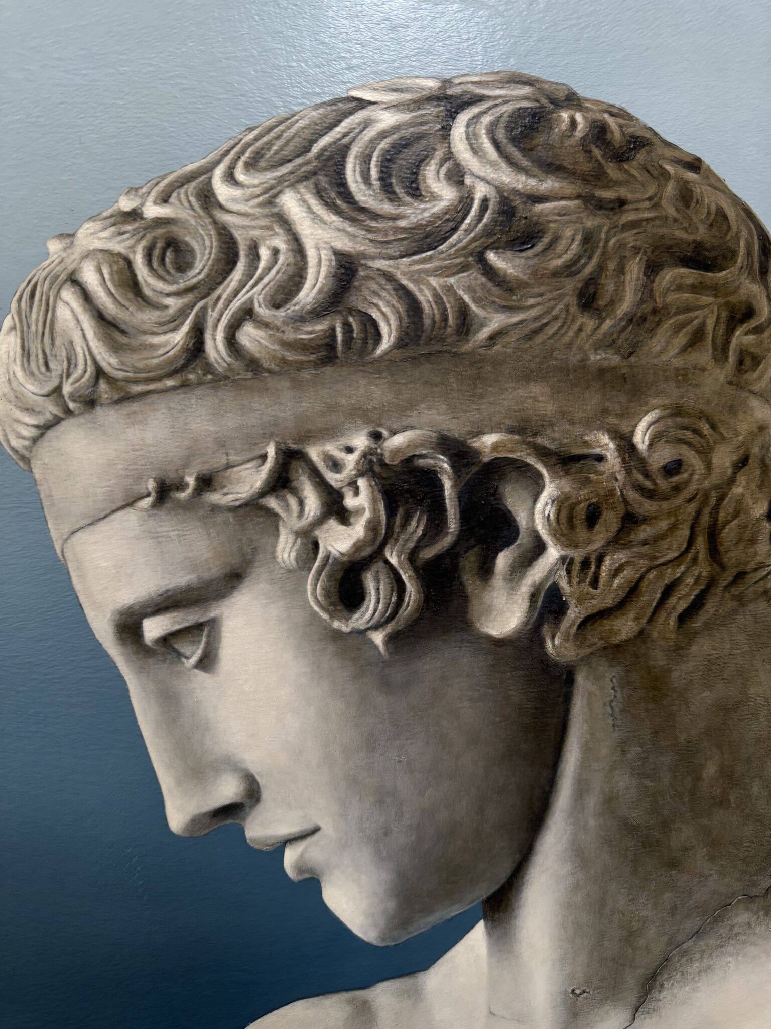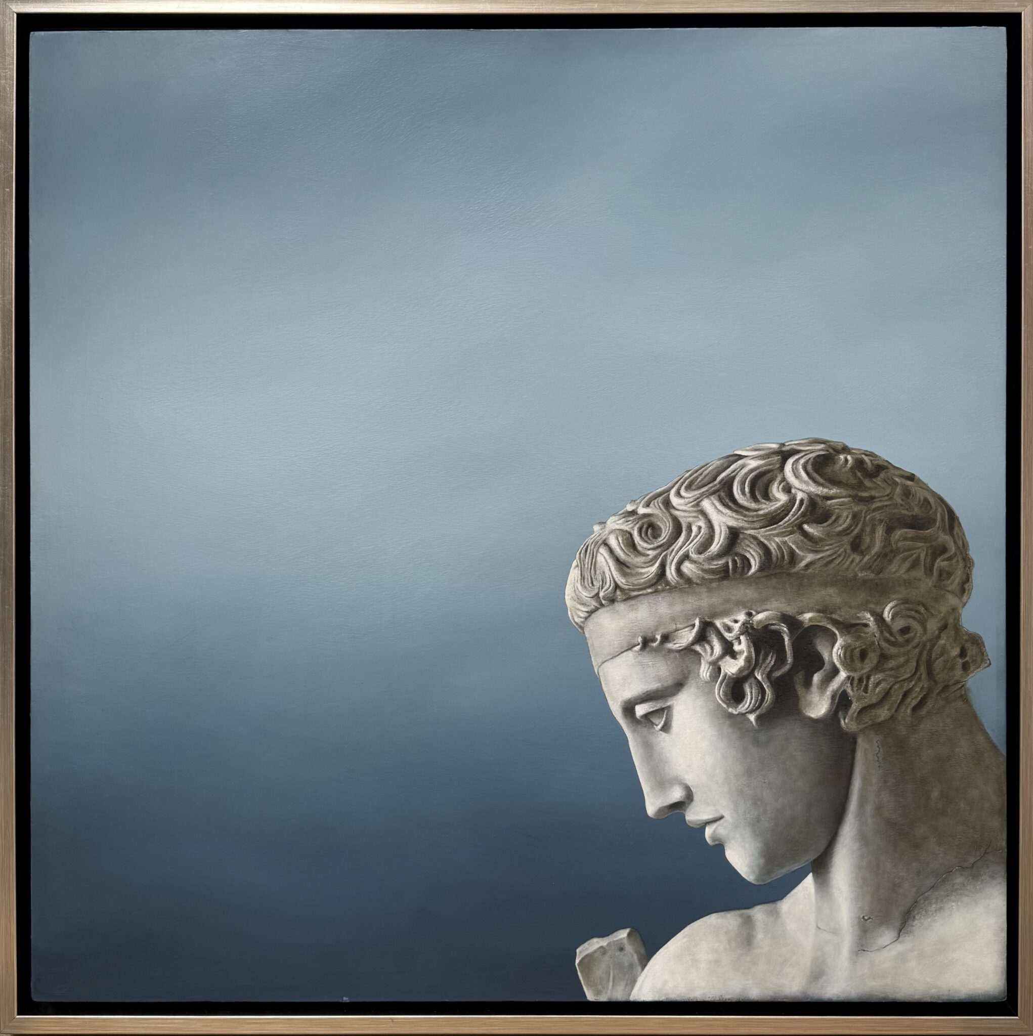 Through expert use of oil paint, Binder captures the intricate nuances of marble—the smooth finish, subtle tonal variations, and sculptural precision—rendering the ancient form with remarkable realism. The composition balances classical artistry with a contemporary presentation, honoring the heroic ideals of ancient Greece while presenting them through a modern fine art lens.