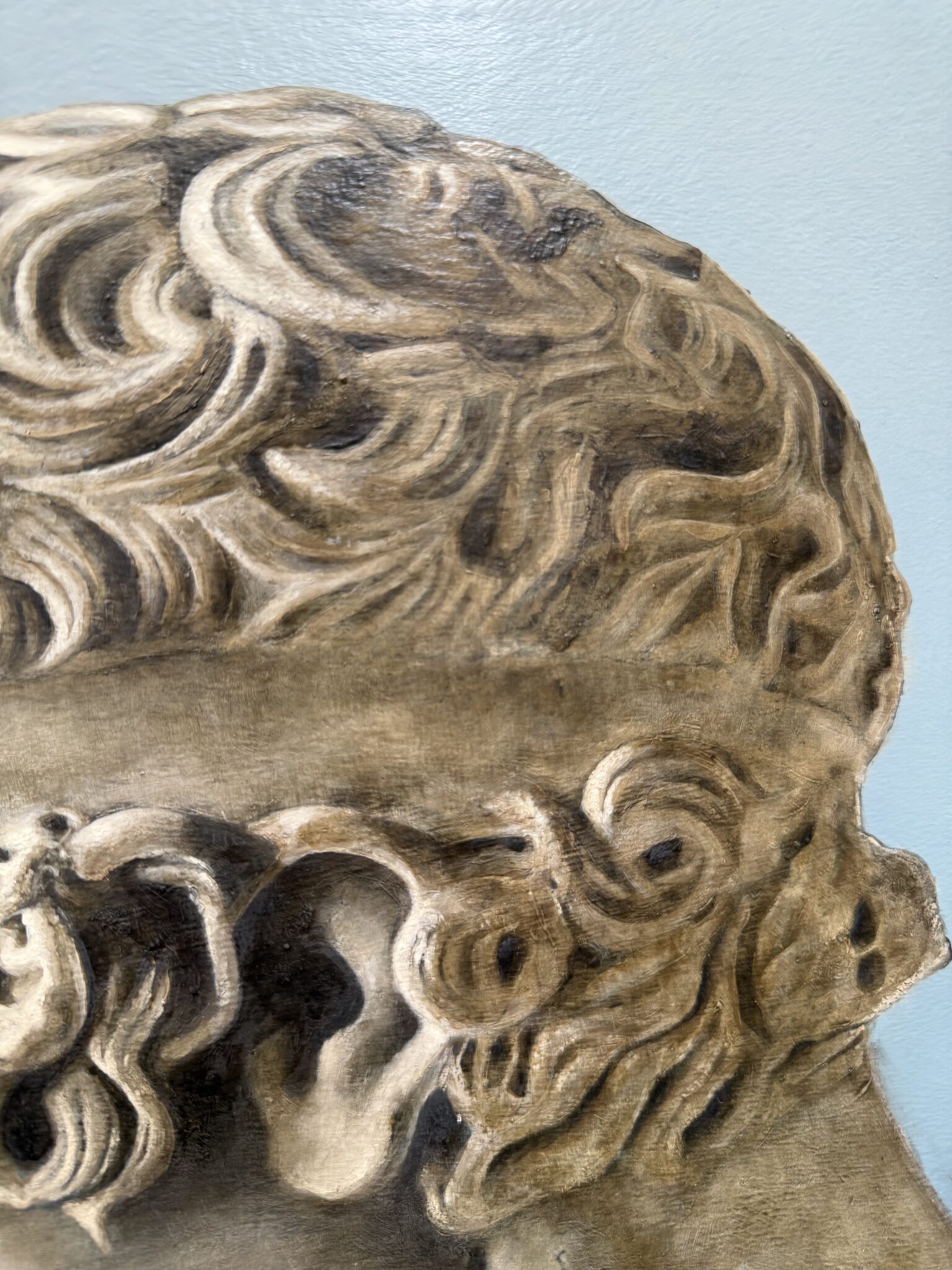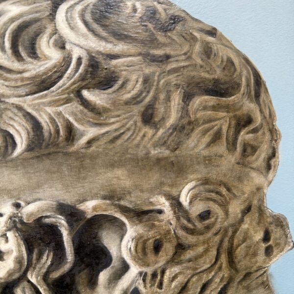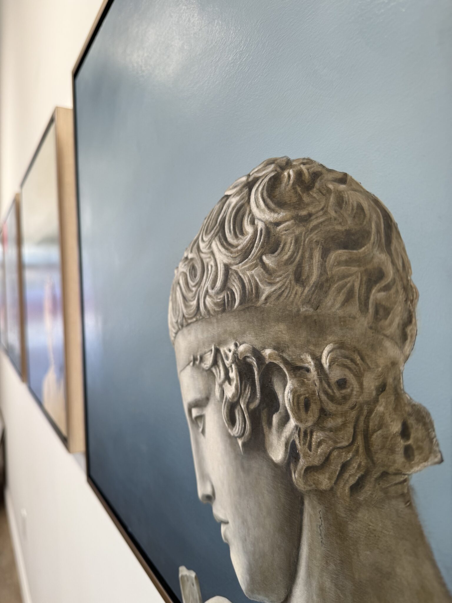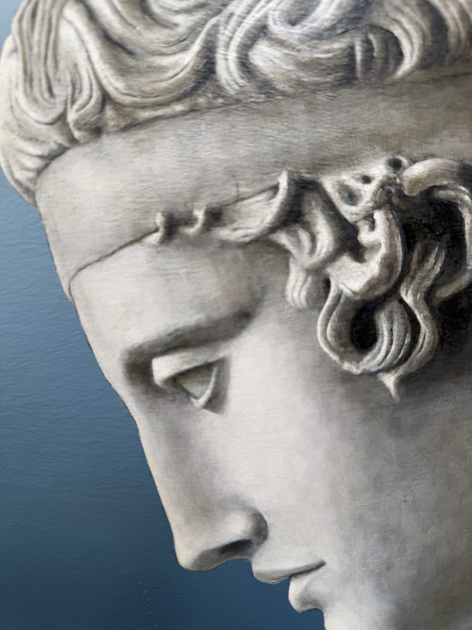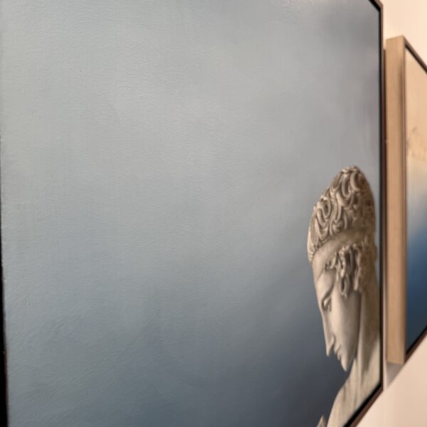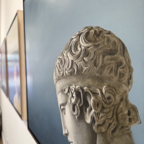 Through expert use of oil paint, Binder captures the intricate nuances of marble—the smooth finish, subtle tonal variations, and sculptural precision—rendering the ancient form with remarkable realism. The composition balances classical artistry with a contemporary presentation, honoring the heroic ideals of ancient Greece while presenting them through a modern fine art lens.