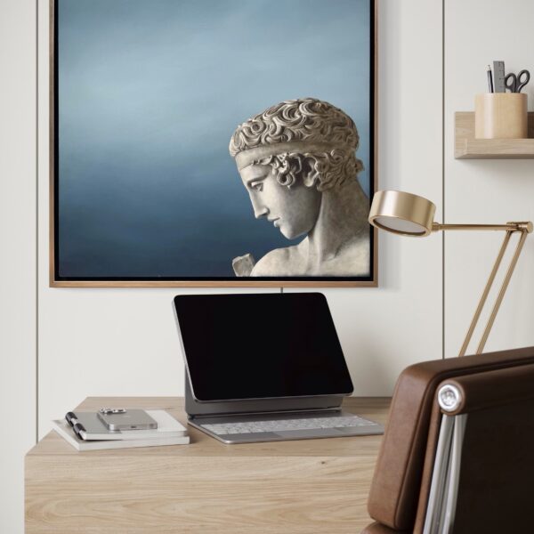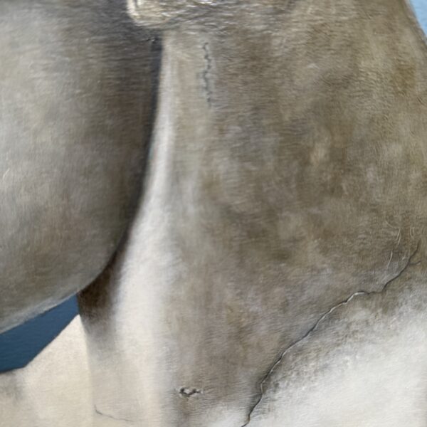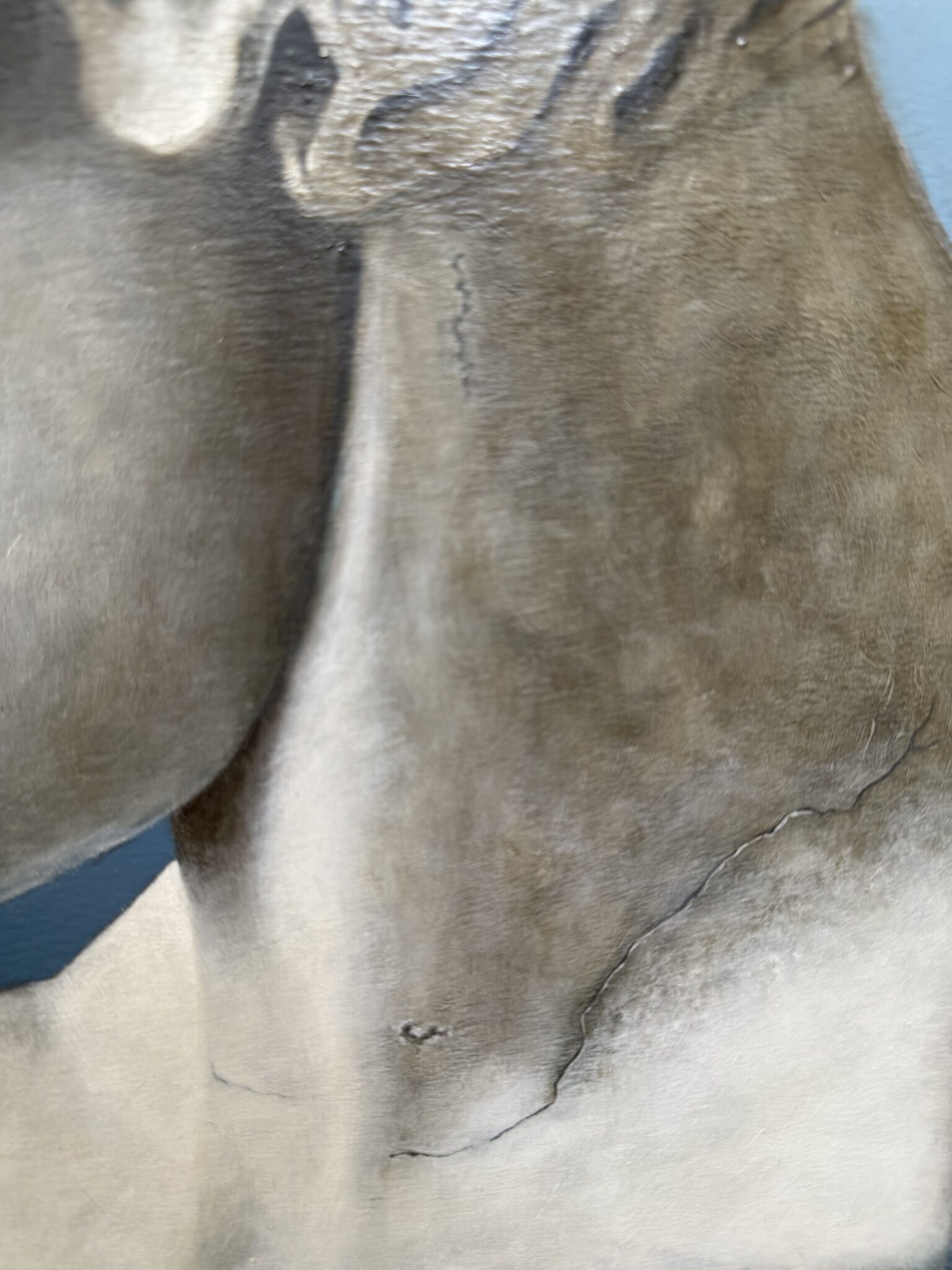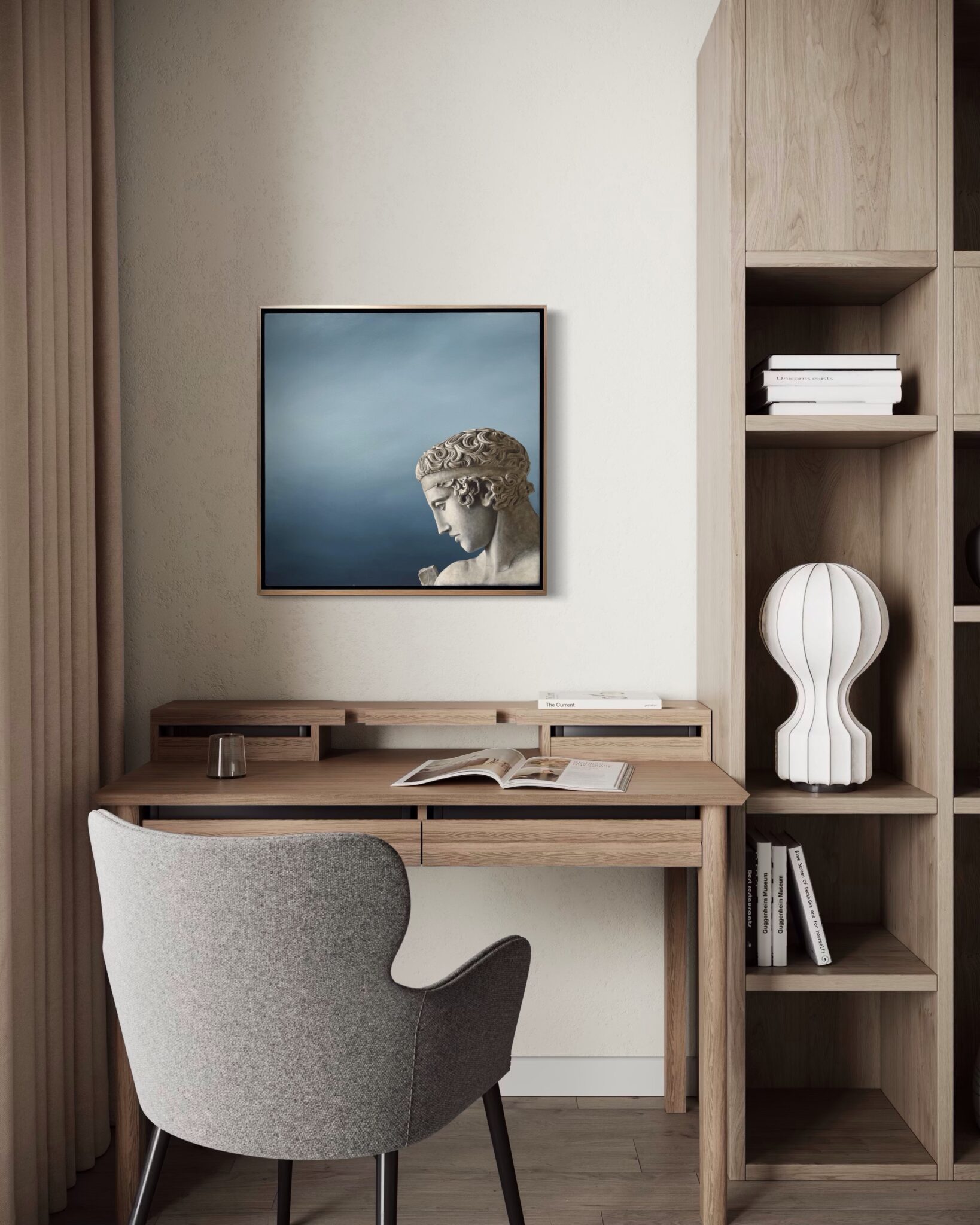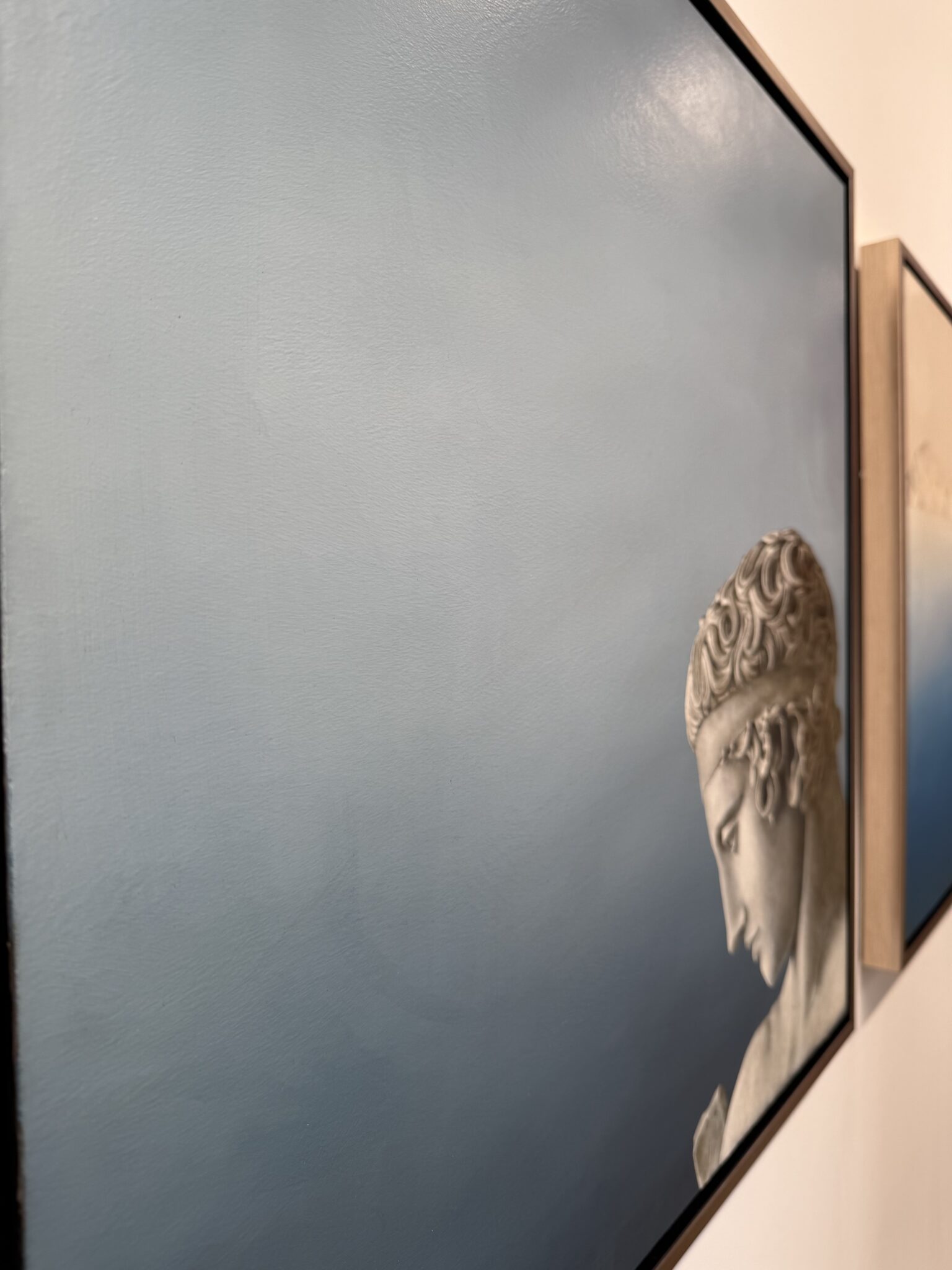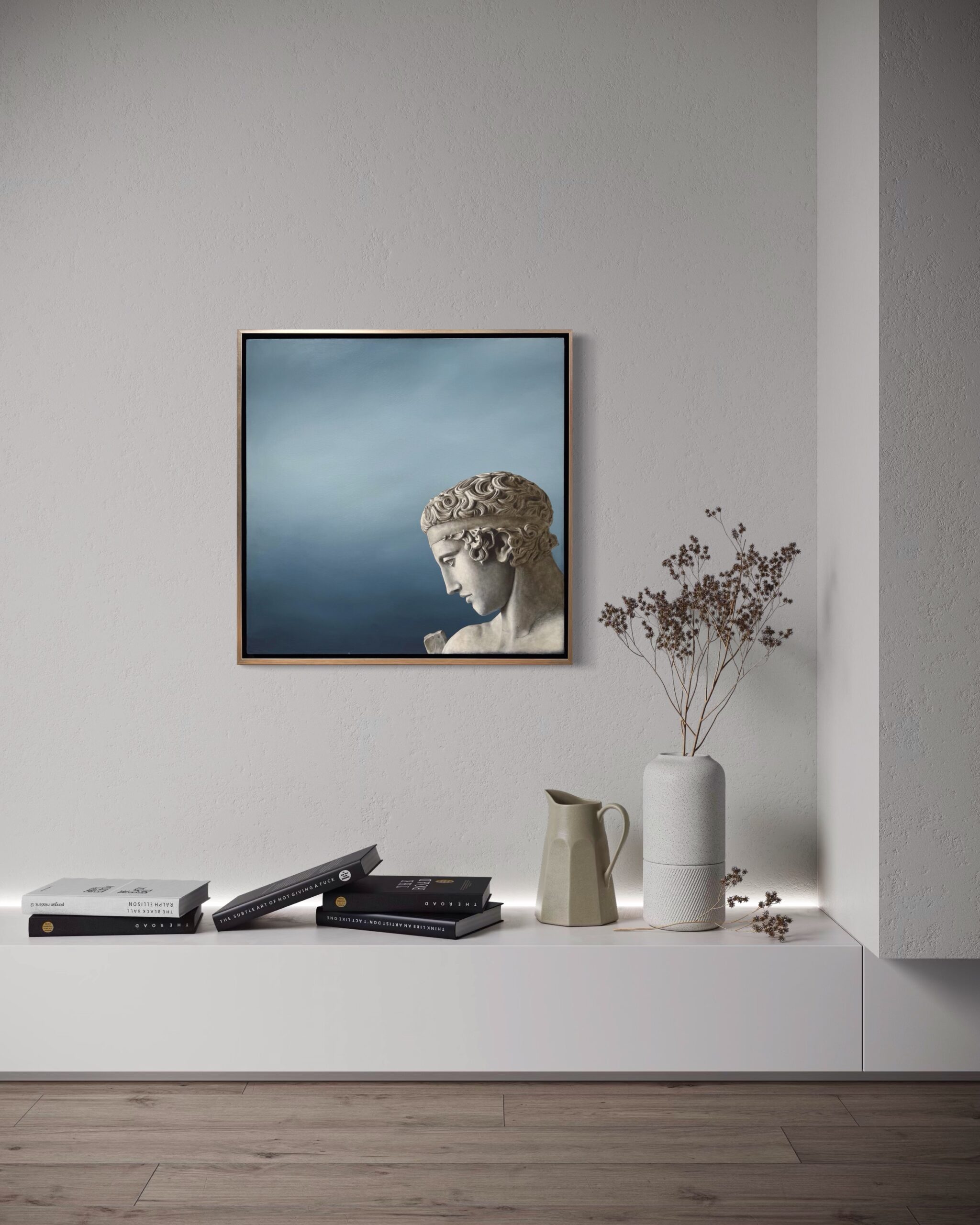 Through expert use of oil paint, Binder captures the intricate nuances of marble—the smooth finish, subtle tonal variations, and sculptural precision—rendering the ancient form with remarkable realism. The composition balances classical artistry with a contemporary presentation, honoring the heroic ideals of ancient Greece while presenting them through a modern fine art lens.