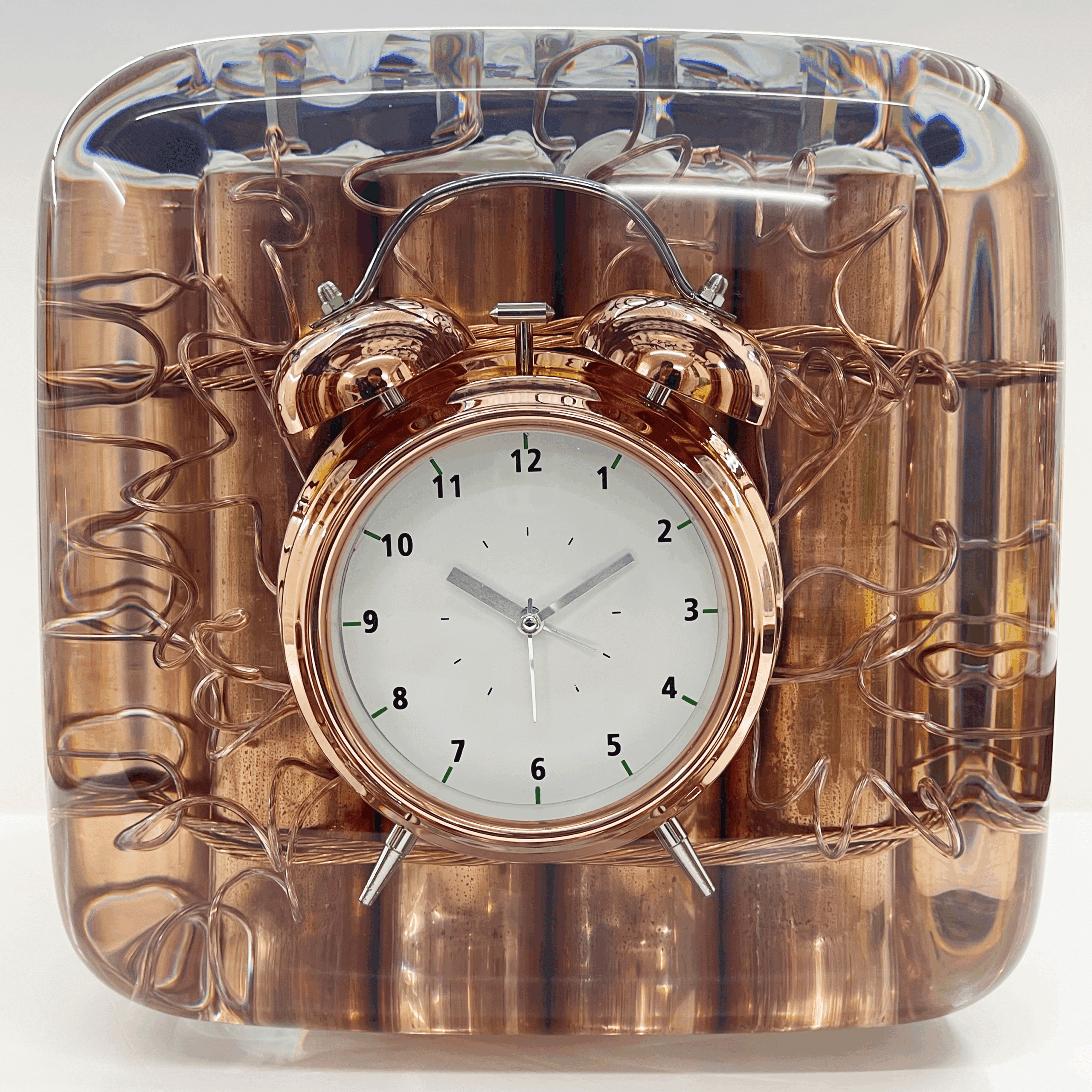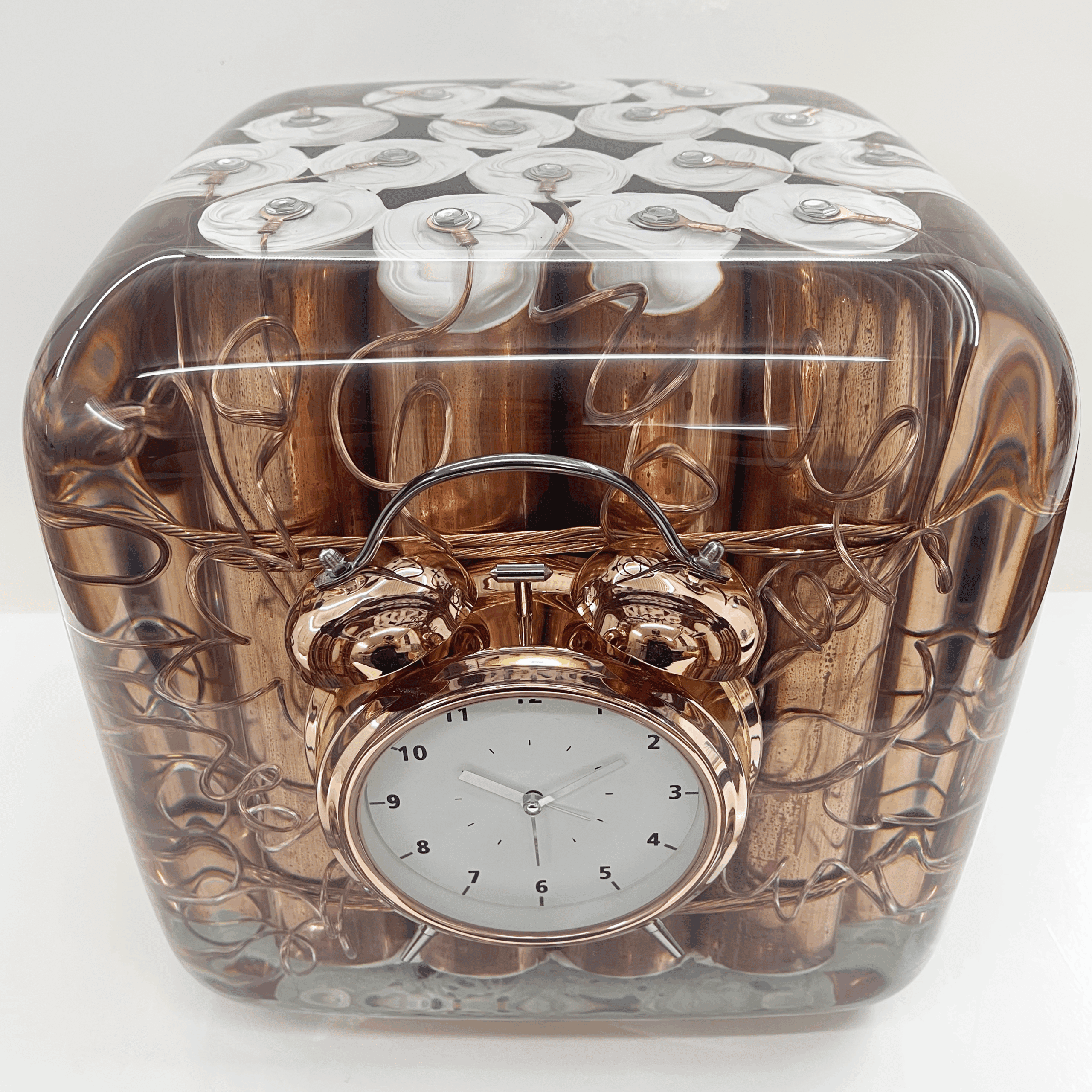 The transparency of the resin allows light to refract through the layers, emphasizing the intricate details within the structure. The copper tones give the piece a warm, almost luxurious feel, while the embedded electrical components suggest themes of power, time constraints, and the mechanical nature of modern life. The alarm clock, a universal symbol of time’s passage, reminds us that eventually, time will come for us all.