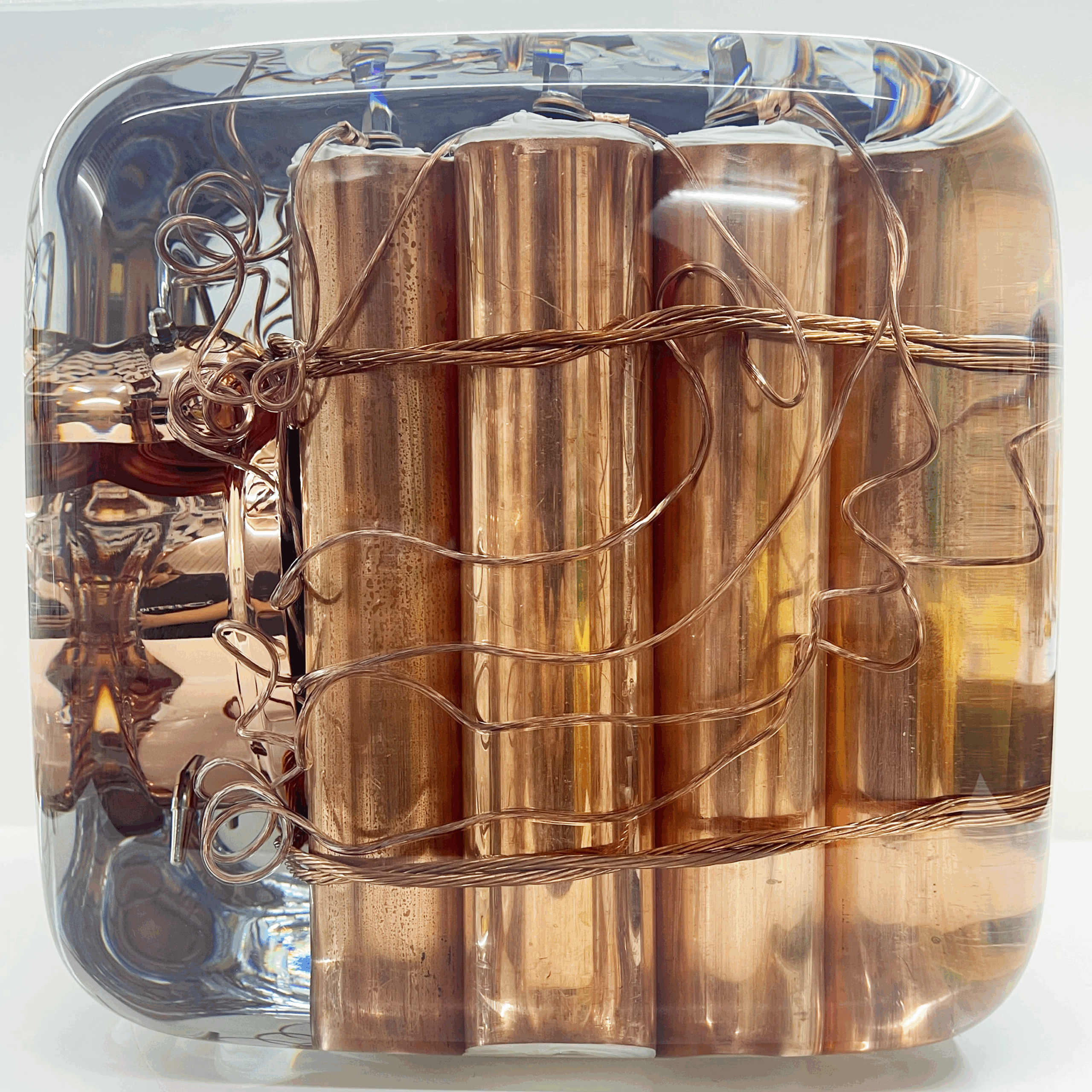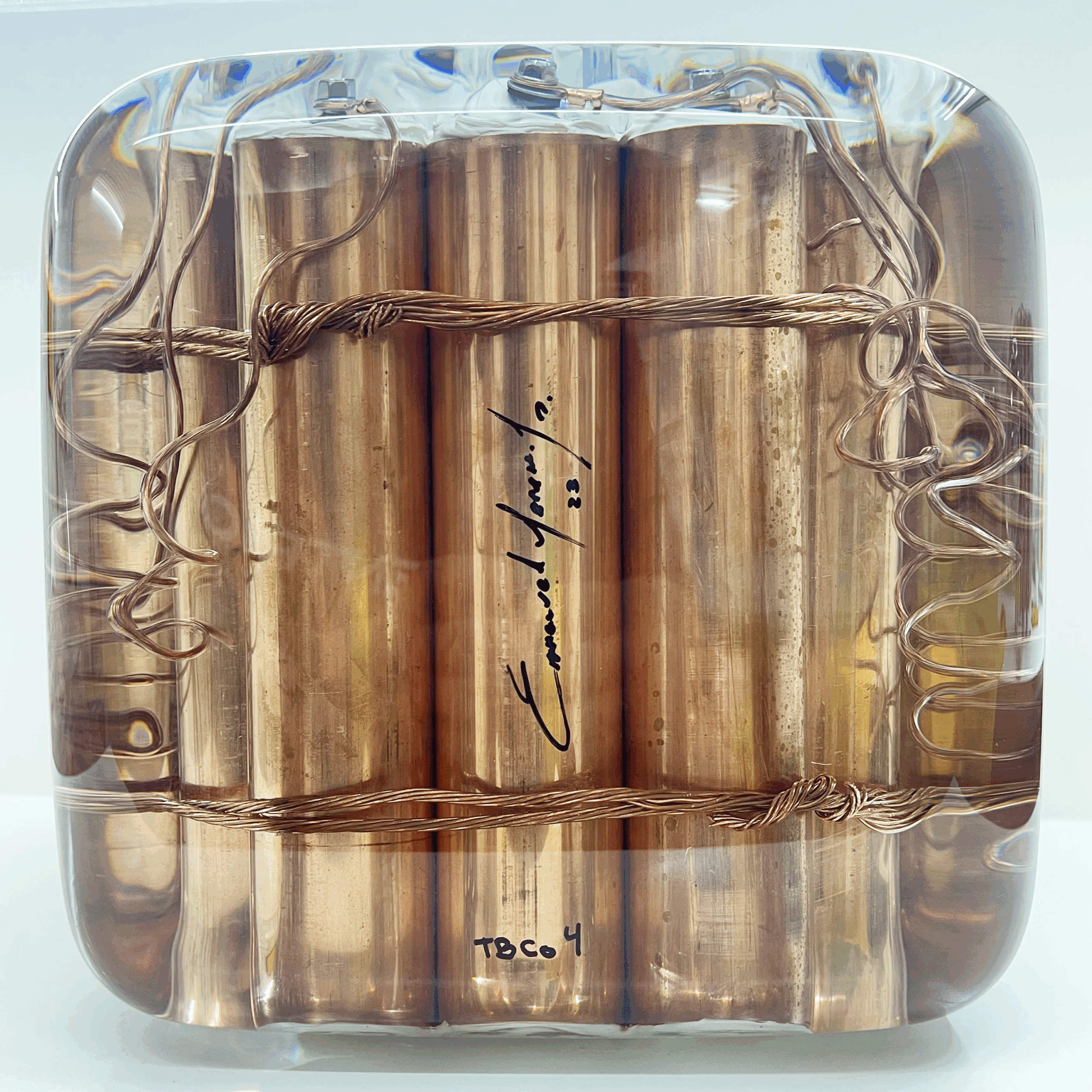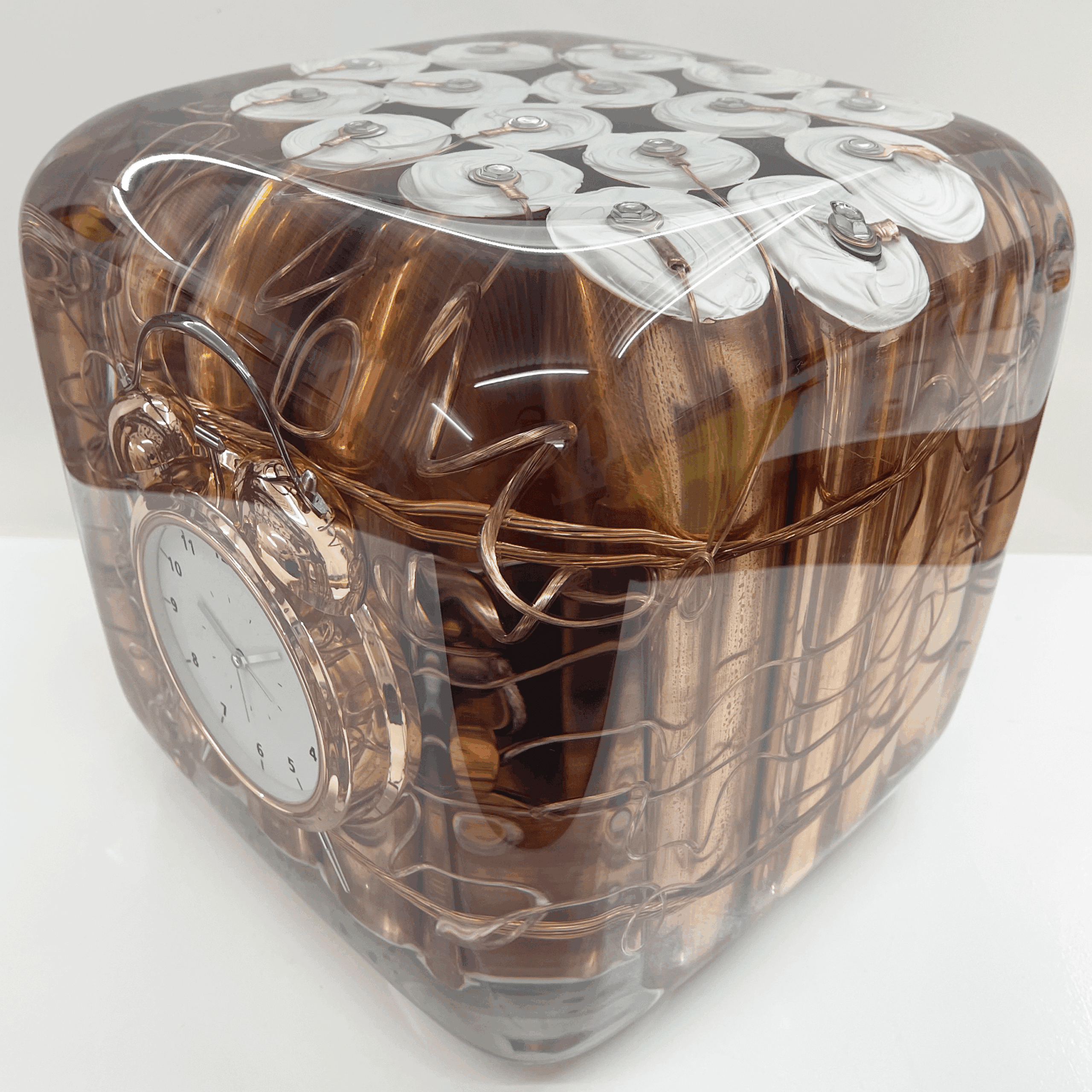 Emmanuel Meneses’ “Time Bomb Copper” fuses industrial design with conceptual depth, transforming an ordinary alarm clock into a powerful symbol of urgency and energy. Encased in a transparent resin block, the sculpture features a polished copper alarm clock, surrounded by coiled wiring and cylindrical copper elements that evoke the aesthetics of a detonator. The juxtaposition of smooth, reflective surfaces with tangled metallic wires creates a sense of tension, highlighting the delicate balance between control and chaos.