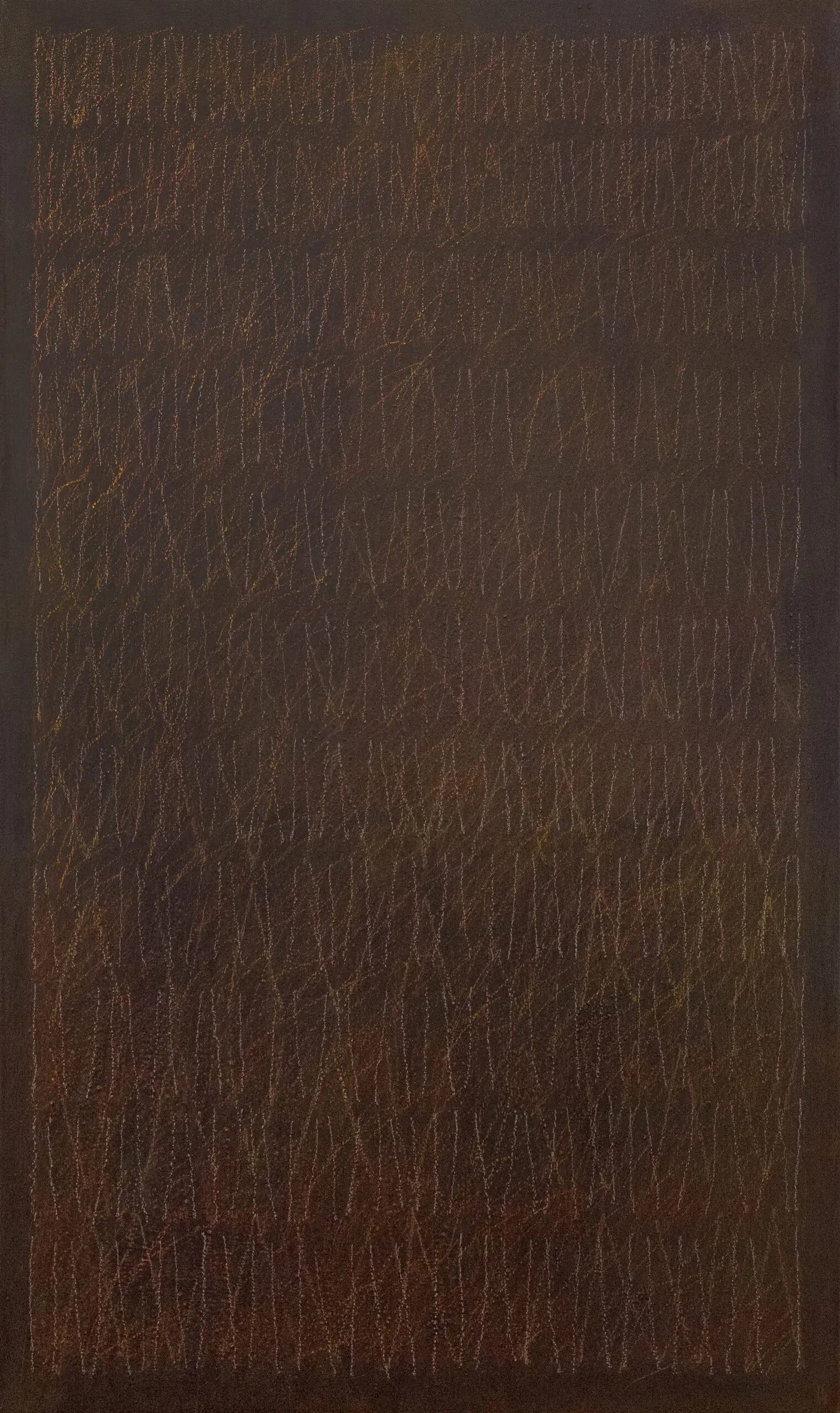 Bluefield’s approach emphasizes the relationship between repetition and perception. While each mark is similar in structure, their subtle variations create a nuanced composition that shifts as the viewer moves through space. The layered oil bar lines contribute a tactile dimension, catching and diffusing light to produce a natural luminosity across the surface. The title Tinder II evokes the faint beginnings of ignition echoed in the warm palette and the rhythm of the marks.