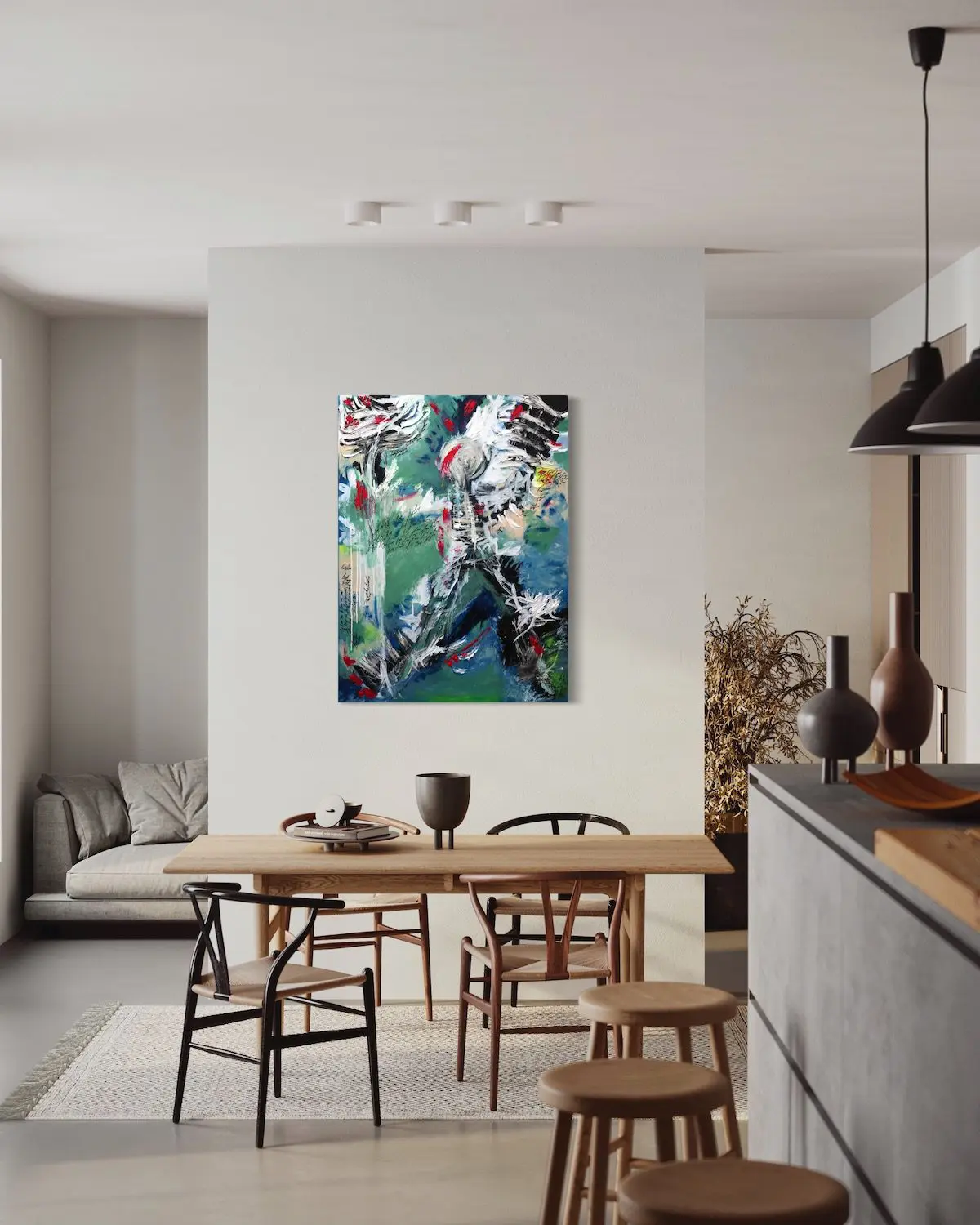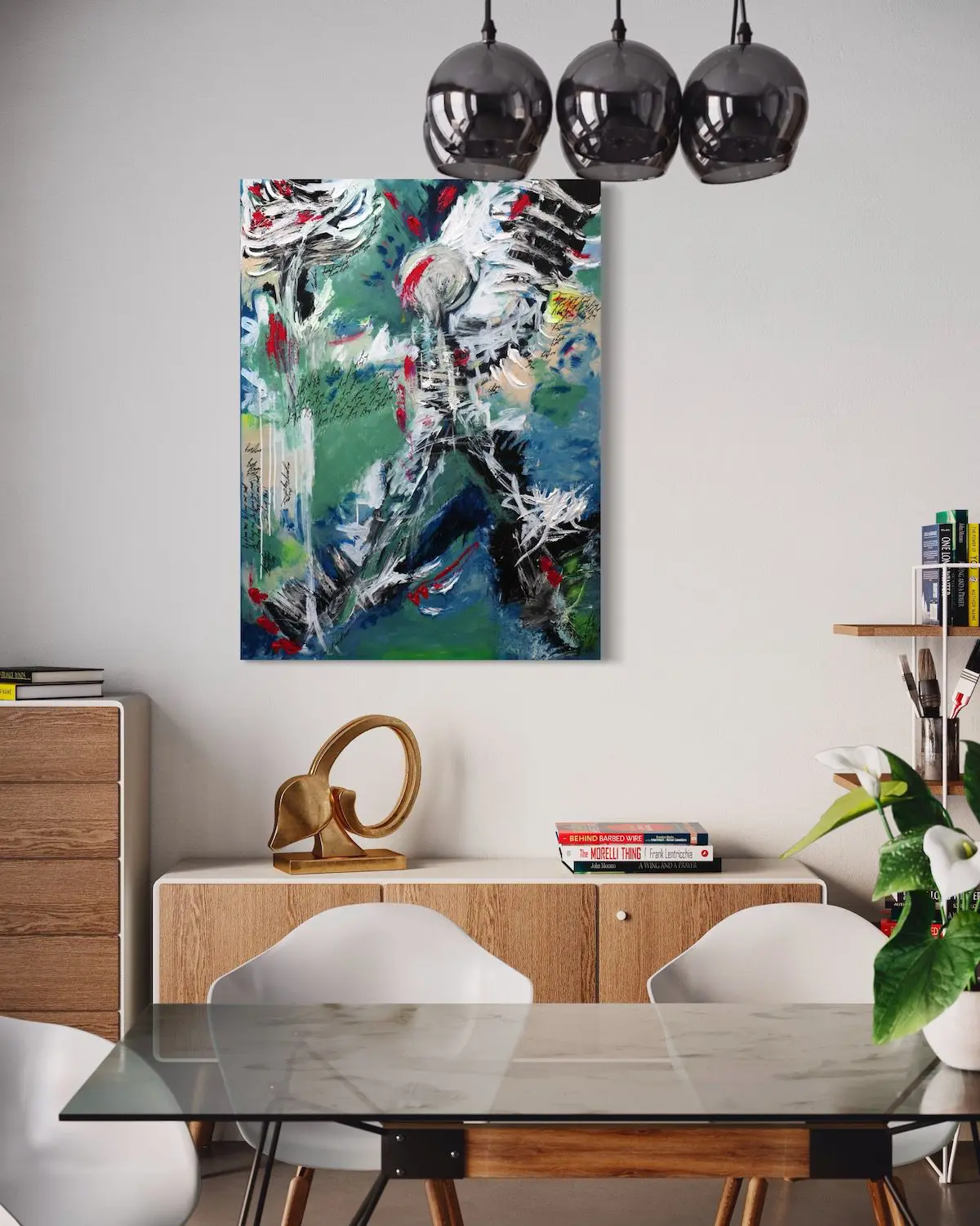 “To The Bone” by Amanza Smith is an expressive abstract work, vibrant with energy and rich in texture. It features bold strokes and splashes across a verdant background that varies from deep greens to lighter hues. White and black brushstrokes dominate, creating swirling forms that suggest natural elements like wind or water currents with stark accents in red. These red dashes add a dramatic flair, drawing the eye and invoking a sense of motion.