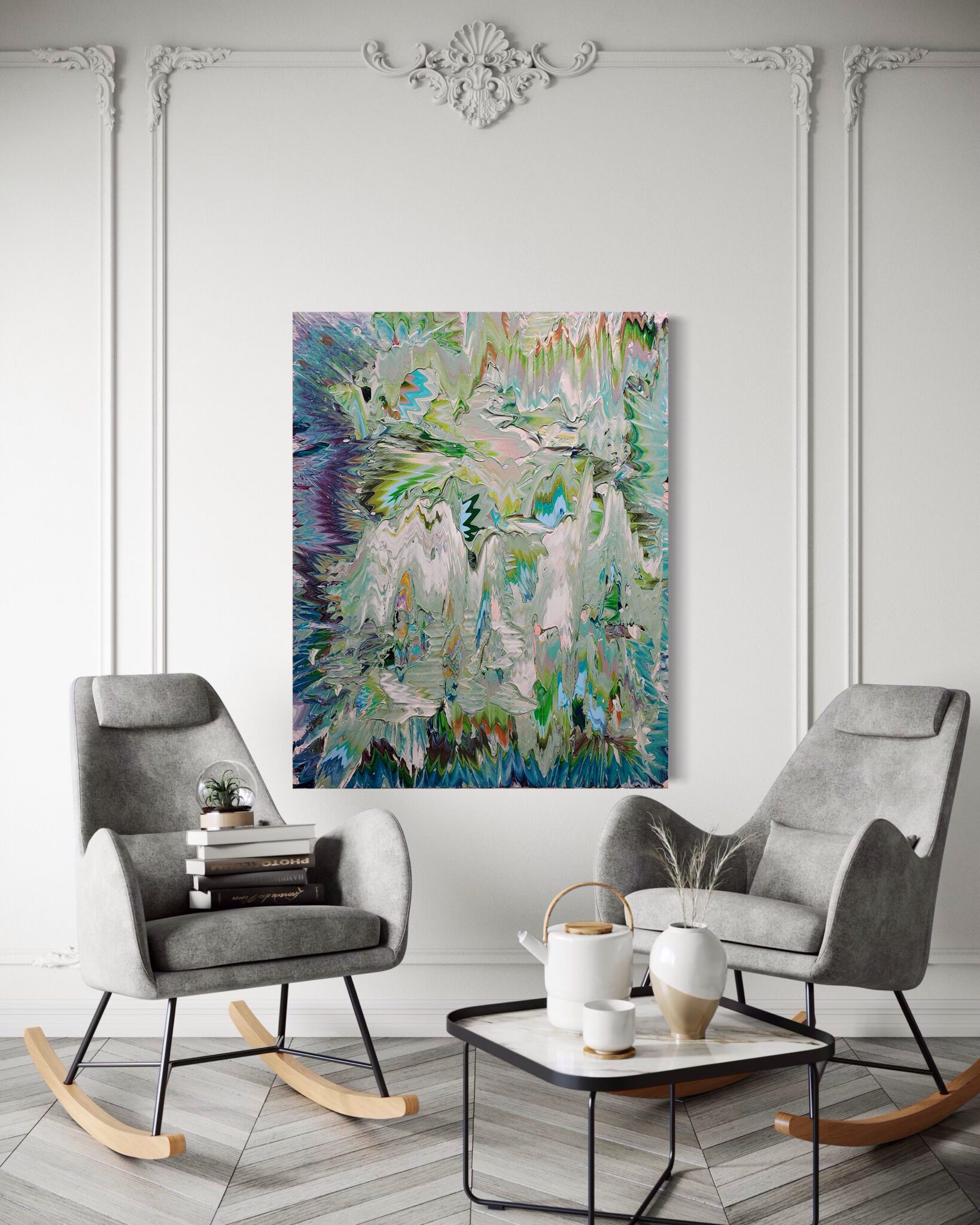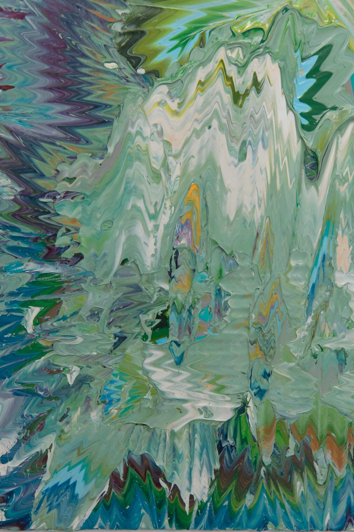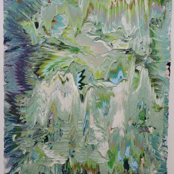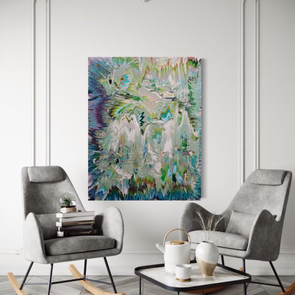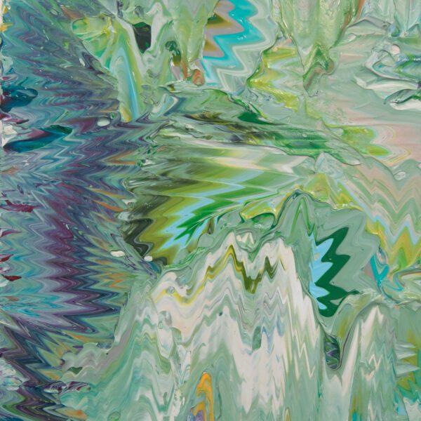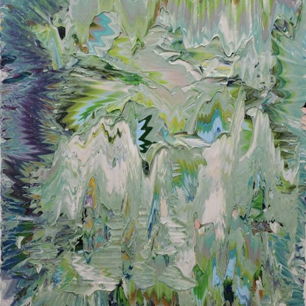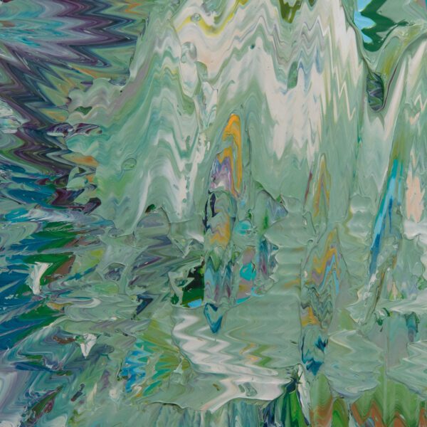 The painting is dominated by blue and green tones, with copper and warm hues framing the composition along the top and bottom, while subtle violet accents emerge from the sides. The work seems to be contained yet simultaneously in motion, with energy rising from the lower section and cascading downward from above. Despite its cool color palette, the dynamic bursts of warmth inject a sense of vitality and openness, creating an unexpectedly inviting atmosphere. The result is a piece that feels both playful and unpredictable, charged with a sense of vibrant energy.