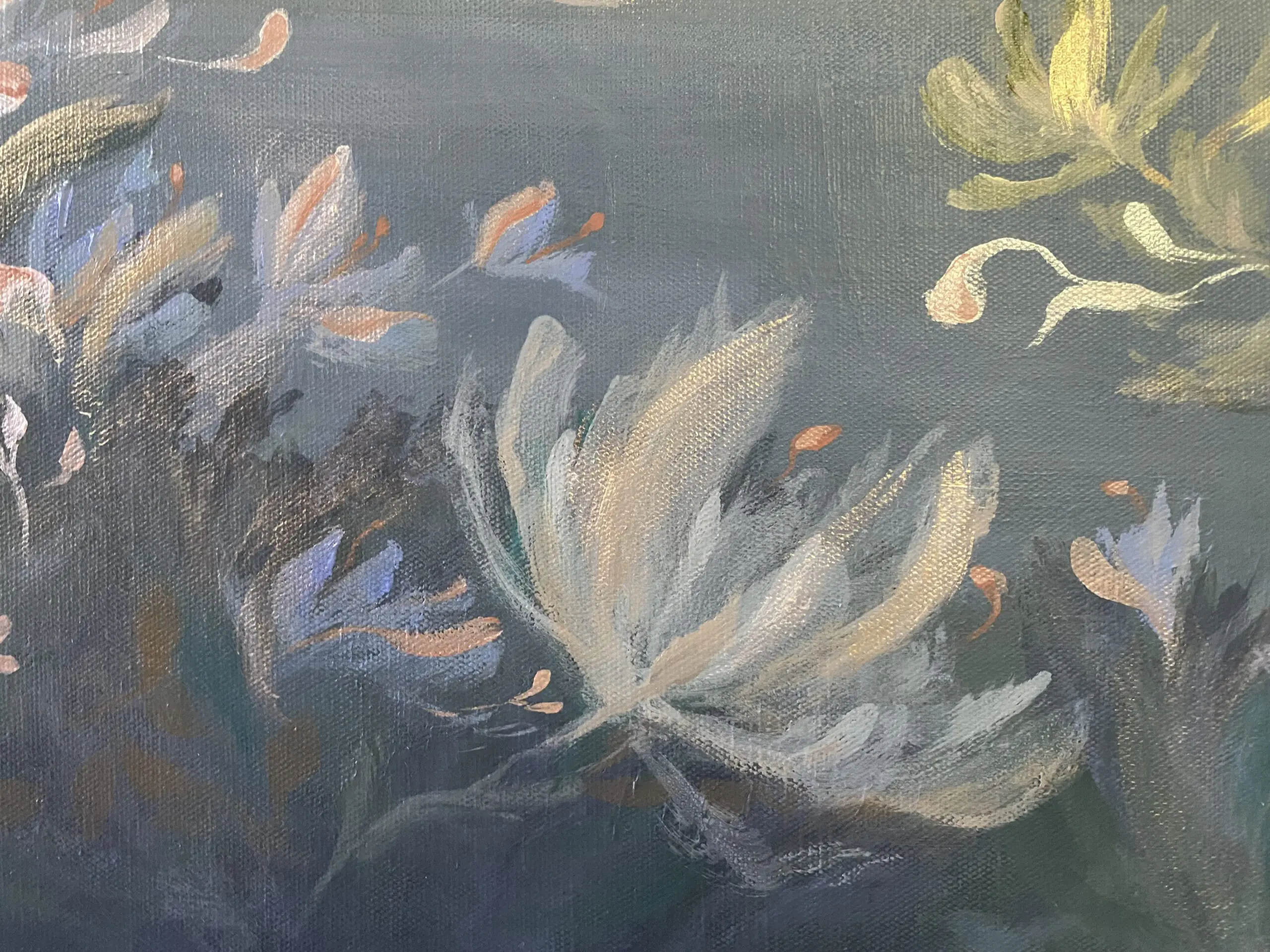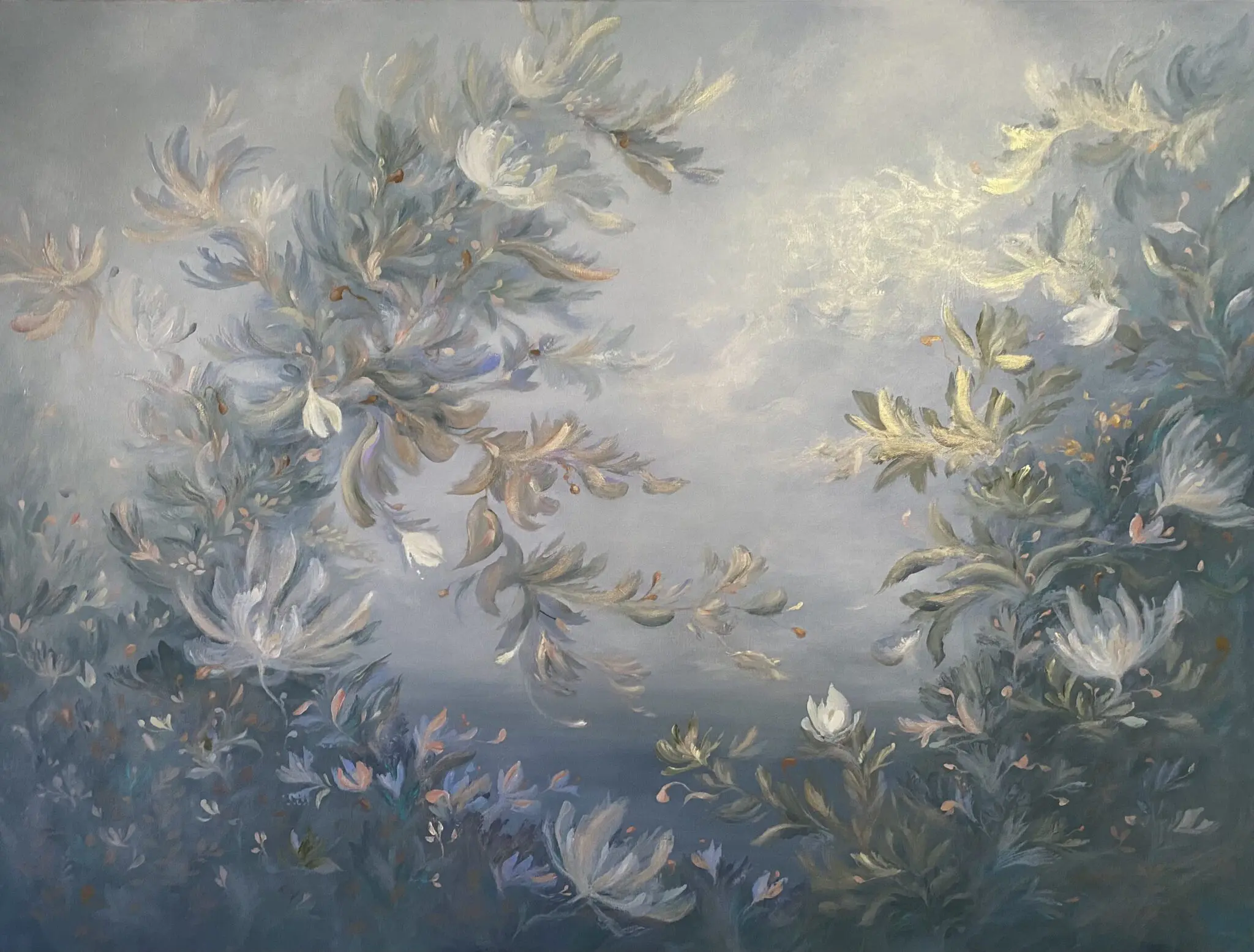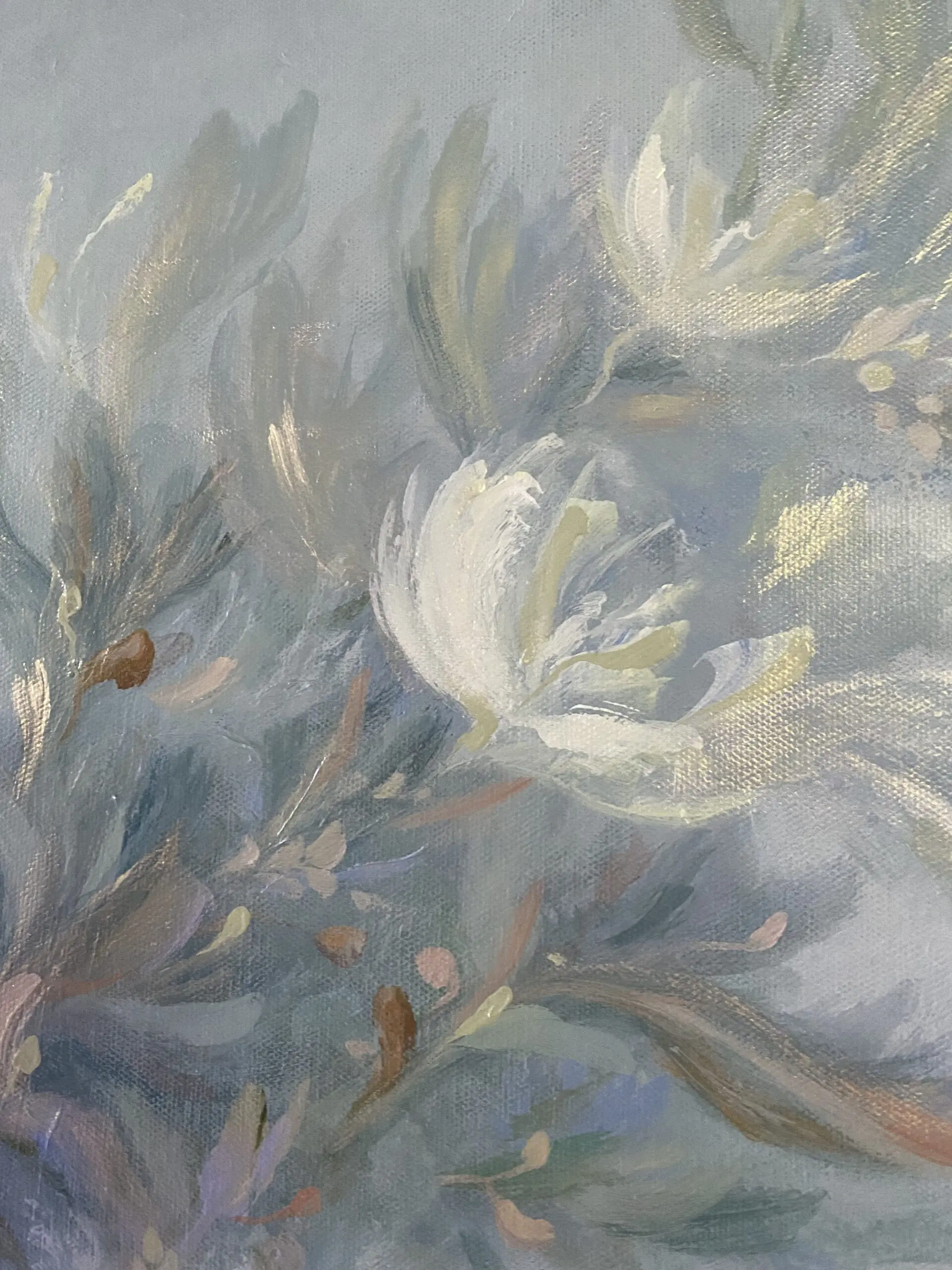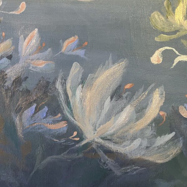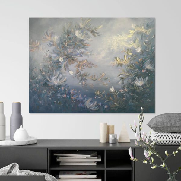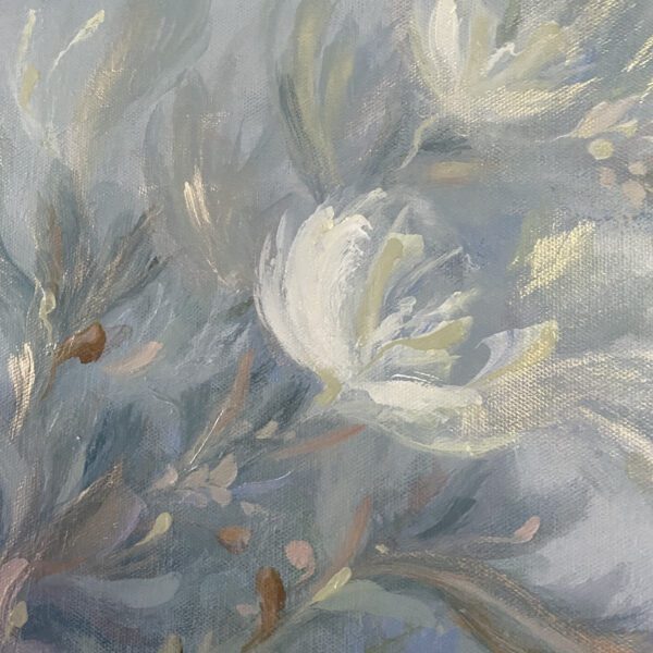 In “Transcendent Beauty,” every flower seems to radiate a sense of grace and enchantment. The gentle hues effortlessly blend together, giving off an aura of enduring elegance. Amid this floral canvas, you’ll spot occasional bursts of lively coral in the foreground, reminding us of the unpredictable beauty of nature, where every element serves a unique purpose. Each stroke, no matter how small, contributes to the greater whole, guiding the observer into a deeper connection with nature’s constant, prayerful presence. These bursts of vibrant color pop out, providing a captivating contrast to the overall softness of the composition.