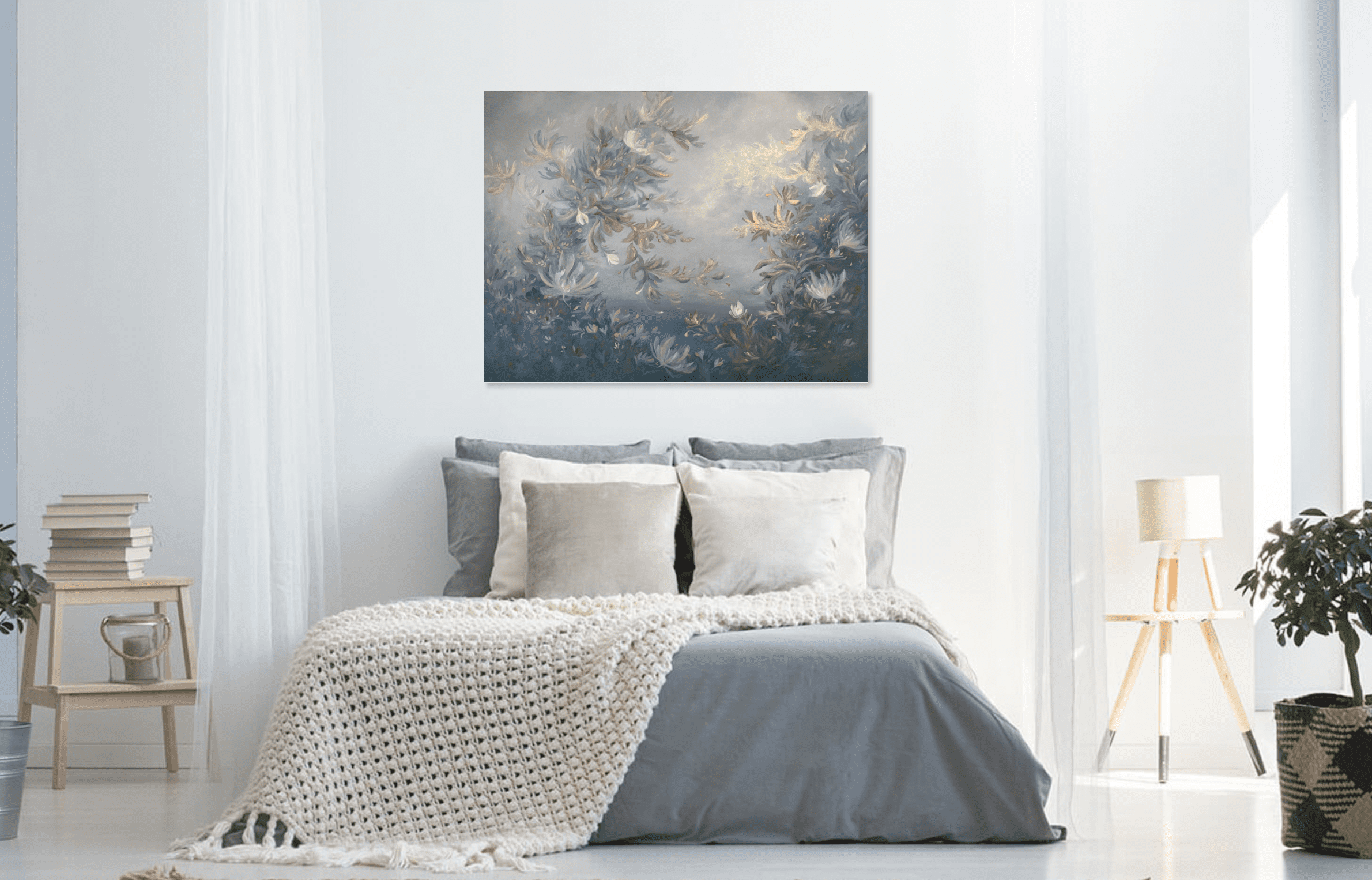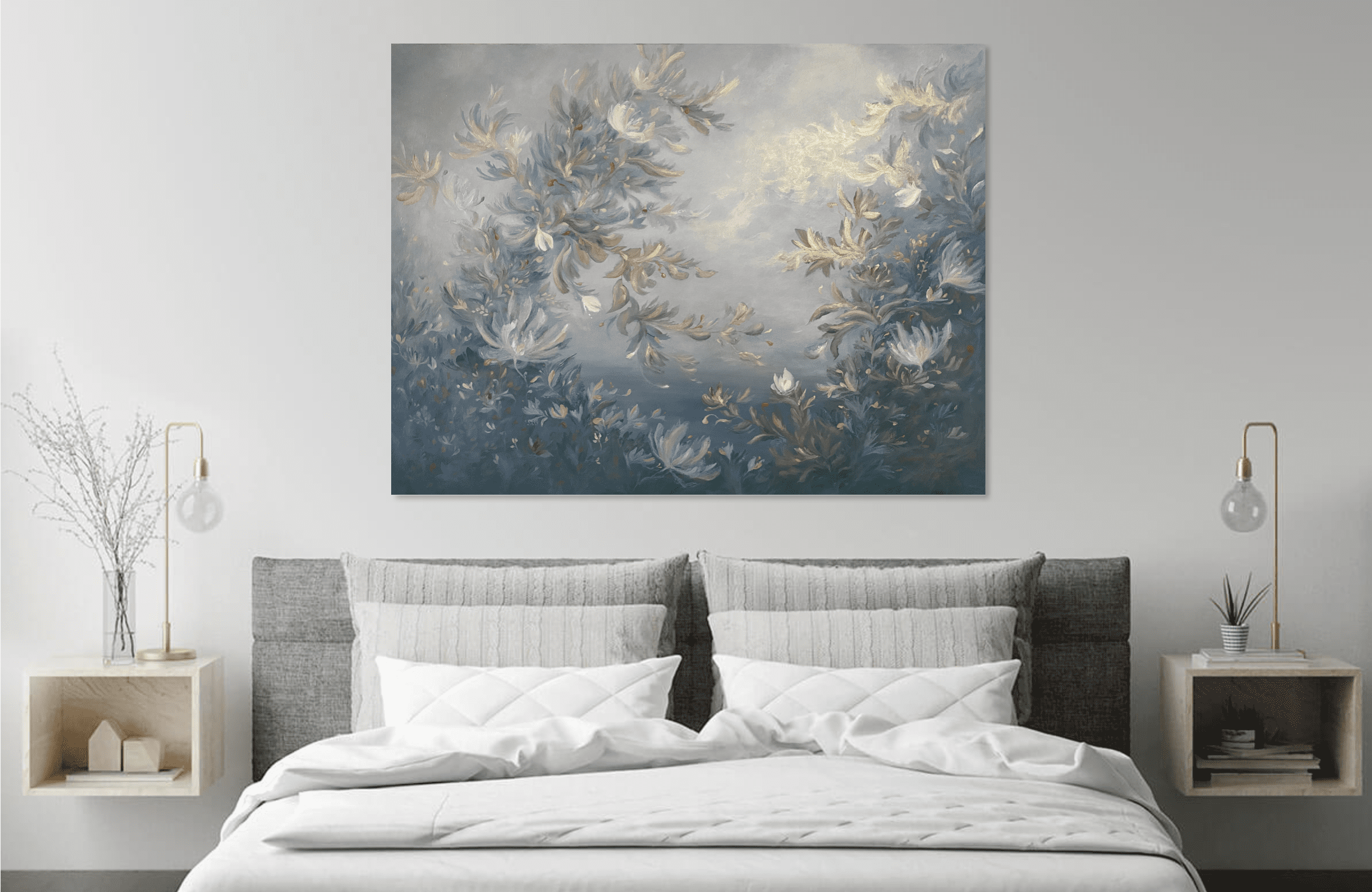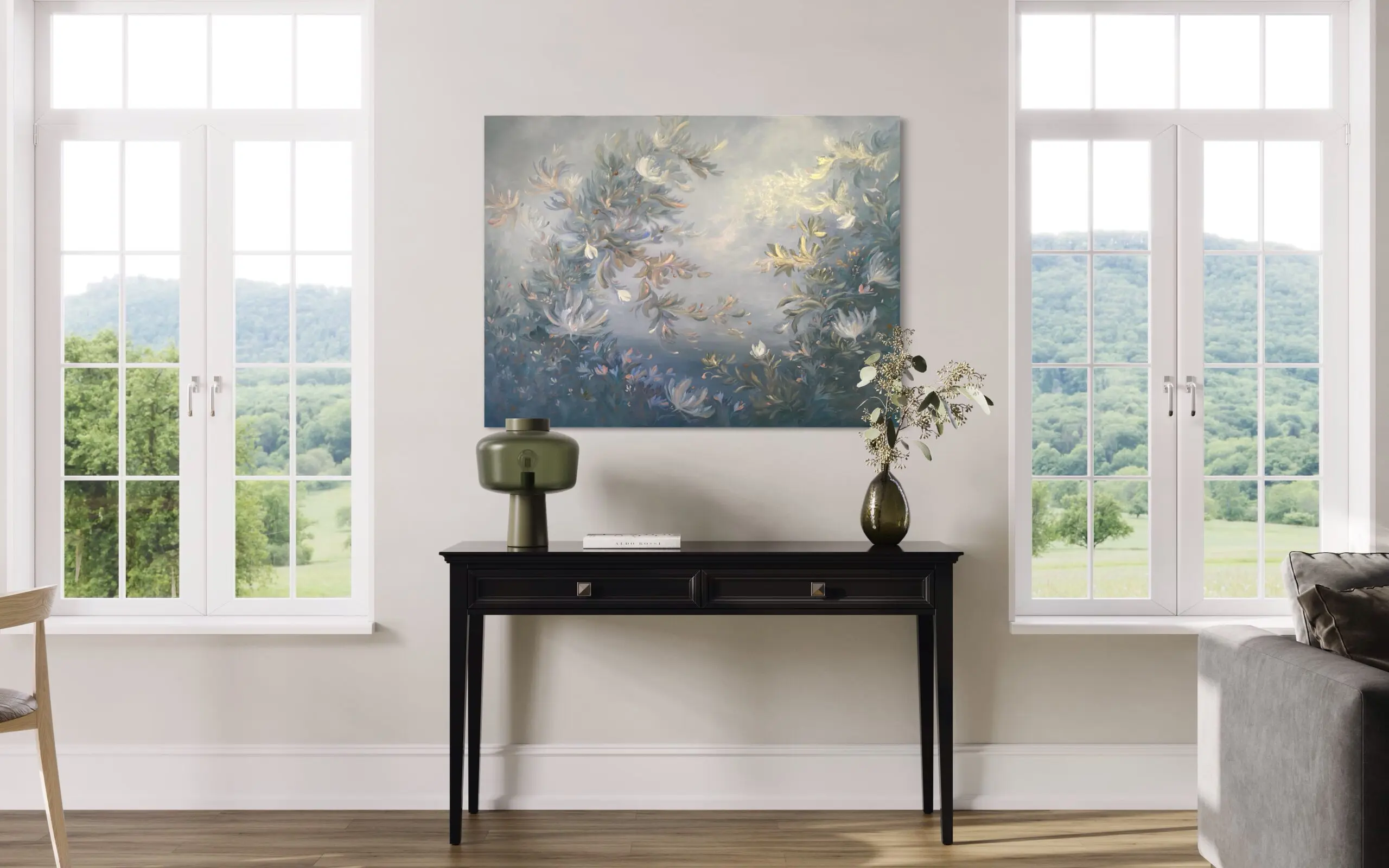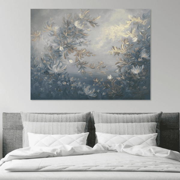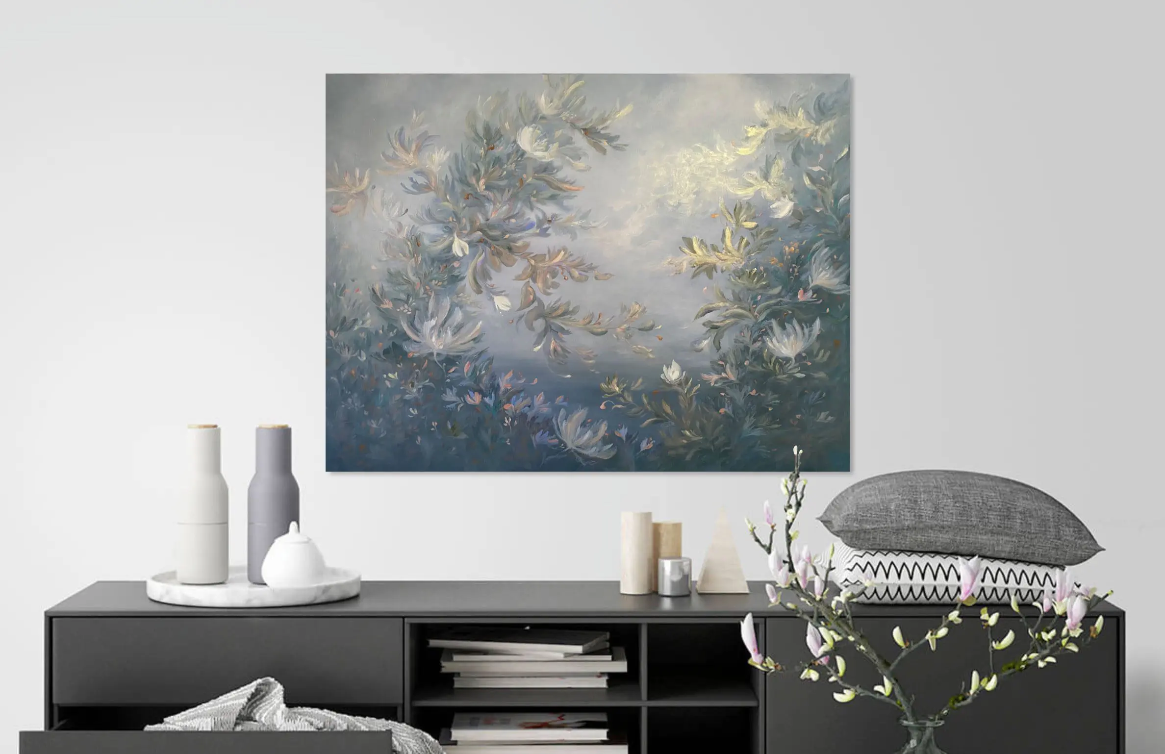 In “Transcendent Beauty,” every flower seems to radiate a sense of grace and enchantment. The gentle hues effortlessly blend together, giving off an aura of enduring elegance. Amid this floral canvas, you’ll spot occasional bursts of lively coral in the foreground, reminding us of the unpredictable beauty of nature, where every element serves a unique purpose. Each stroke, no matter how small, contributes to the greater whole, guiding the observer into a deeper connection with nature’s constant, prayerful presence. These bursts of vibrant color pop out, providing a captivating contrast to the overall softness of the composition.