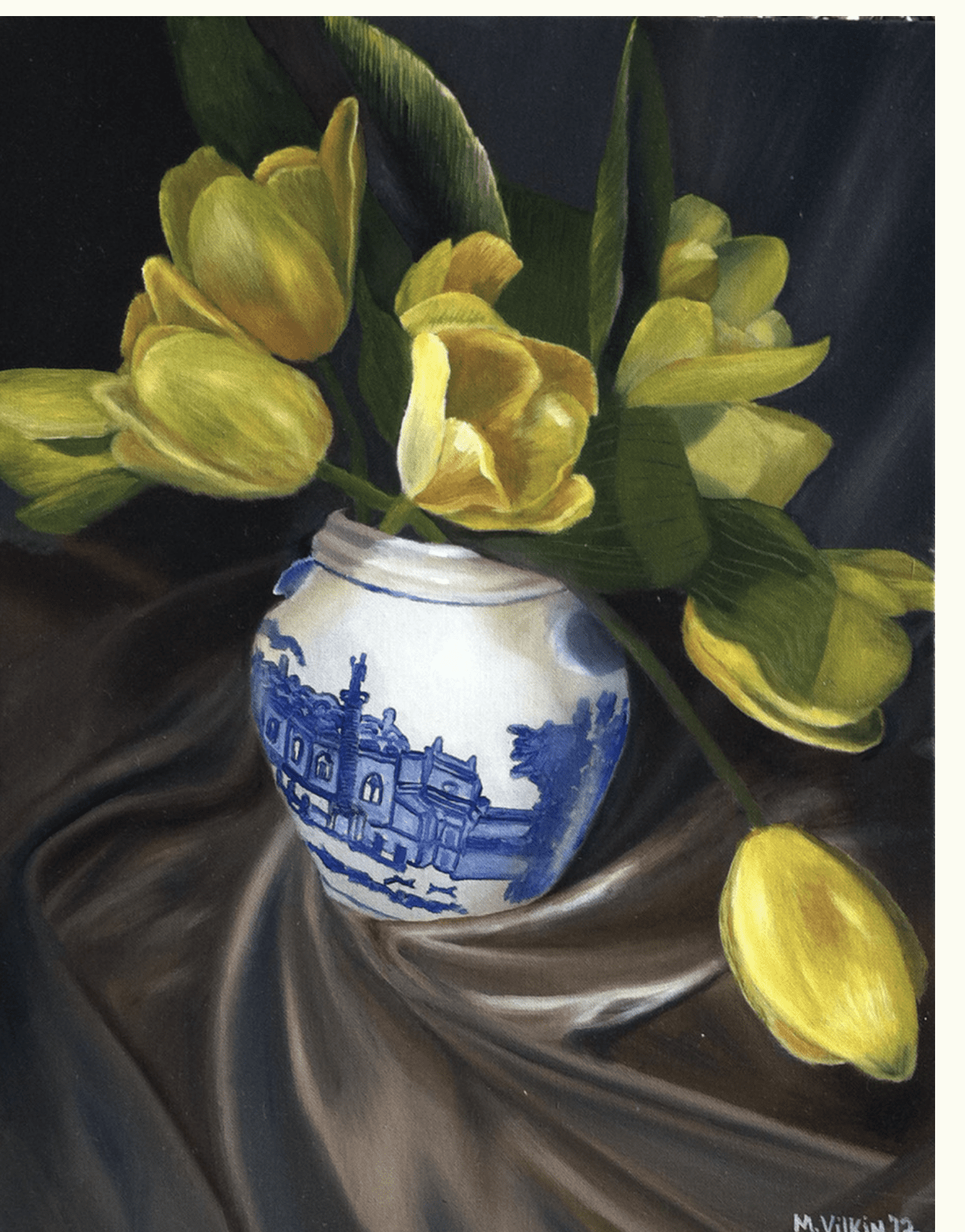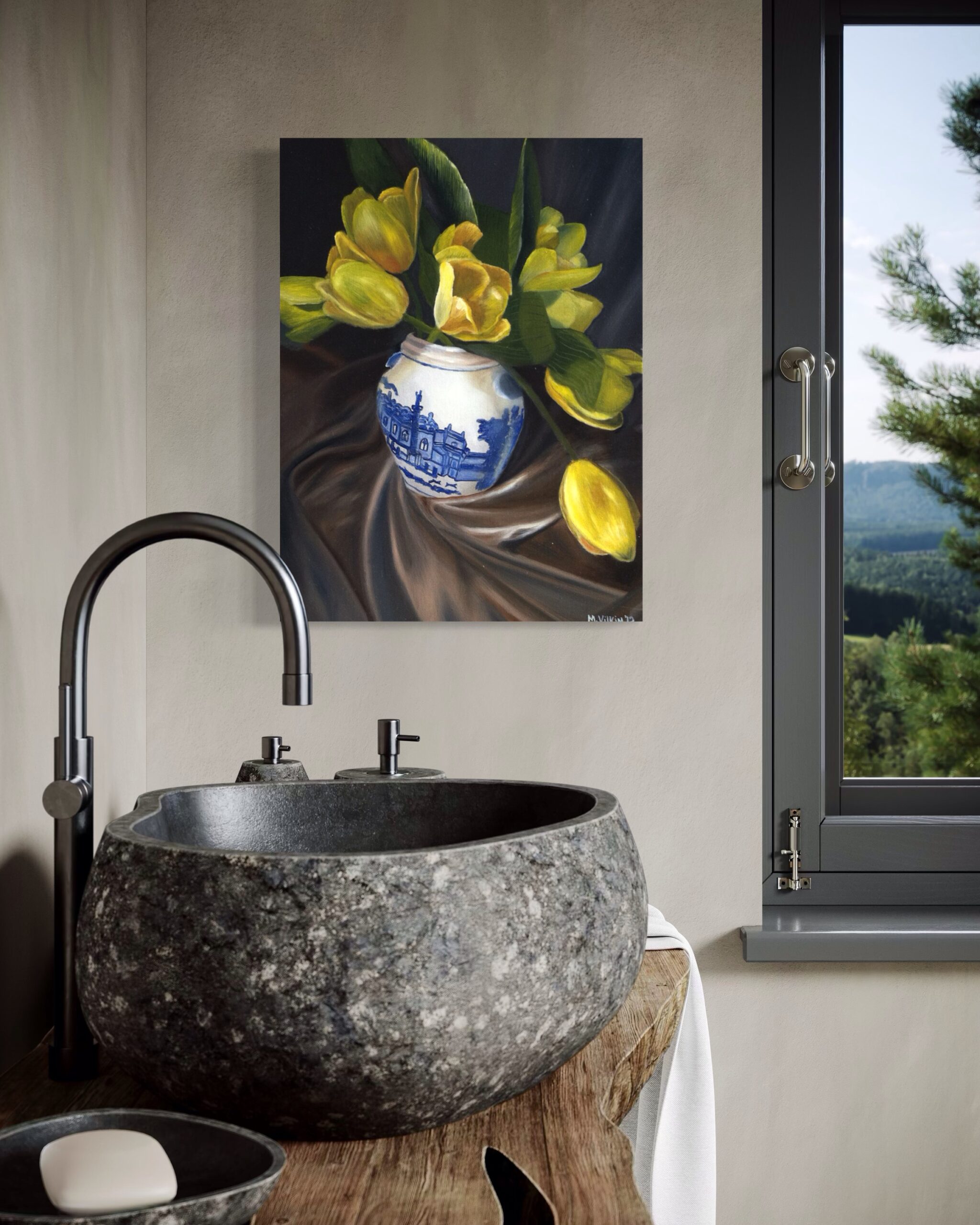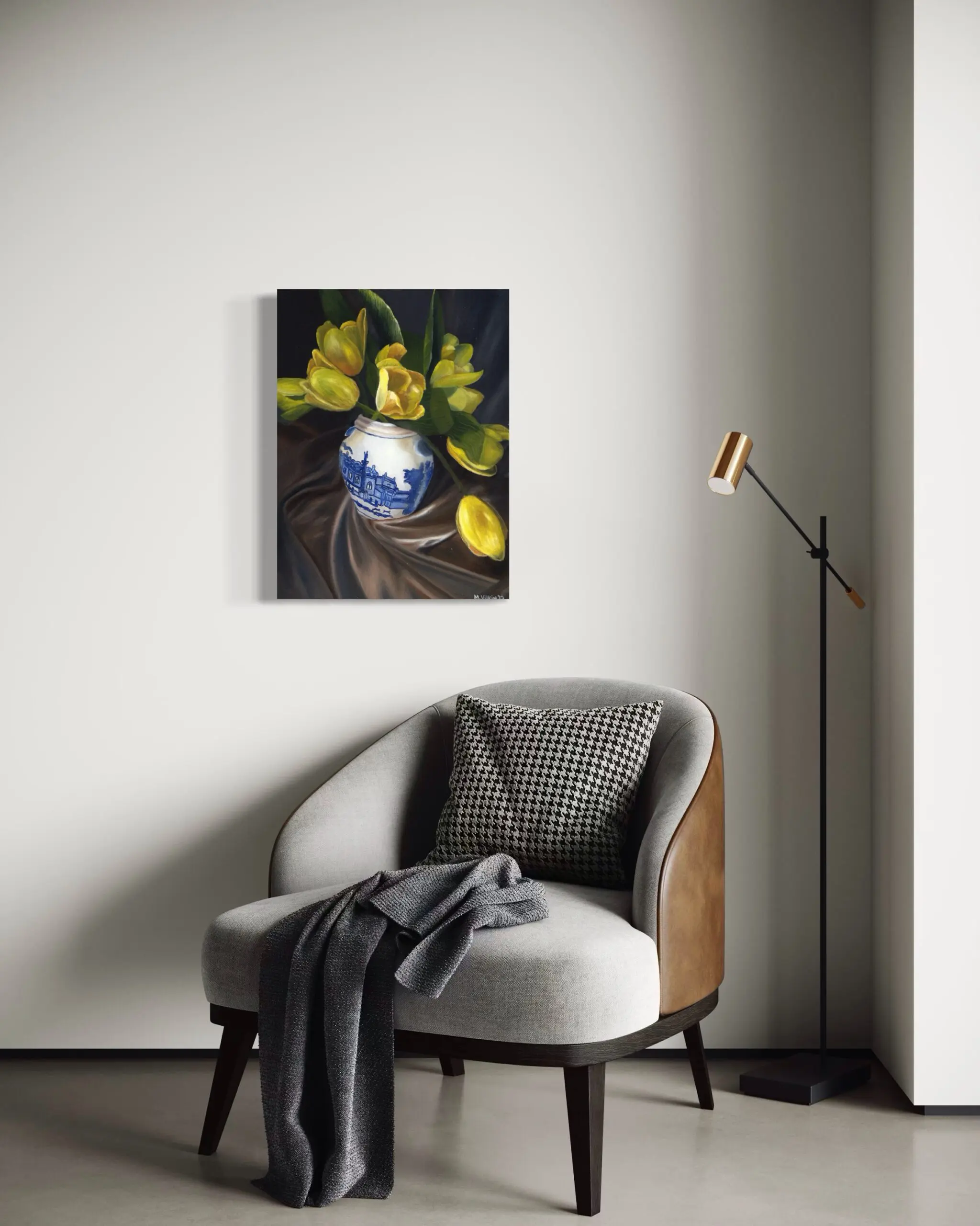 “Tulips in a Blue and White Vase” is a masterful still life composition, where light, texture, and contrast converge to create an atmosphere of refined elegance and quiet contemplation. The artist skillfully captures the delicate beauty of yellow tulips, setting them against a dark, richly textured background, enhancing their luminosity and depth.