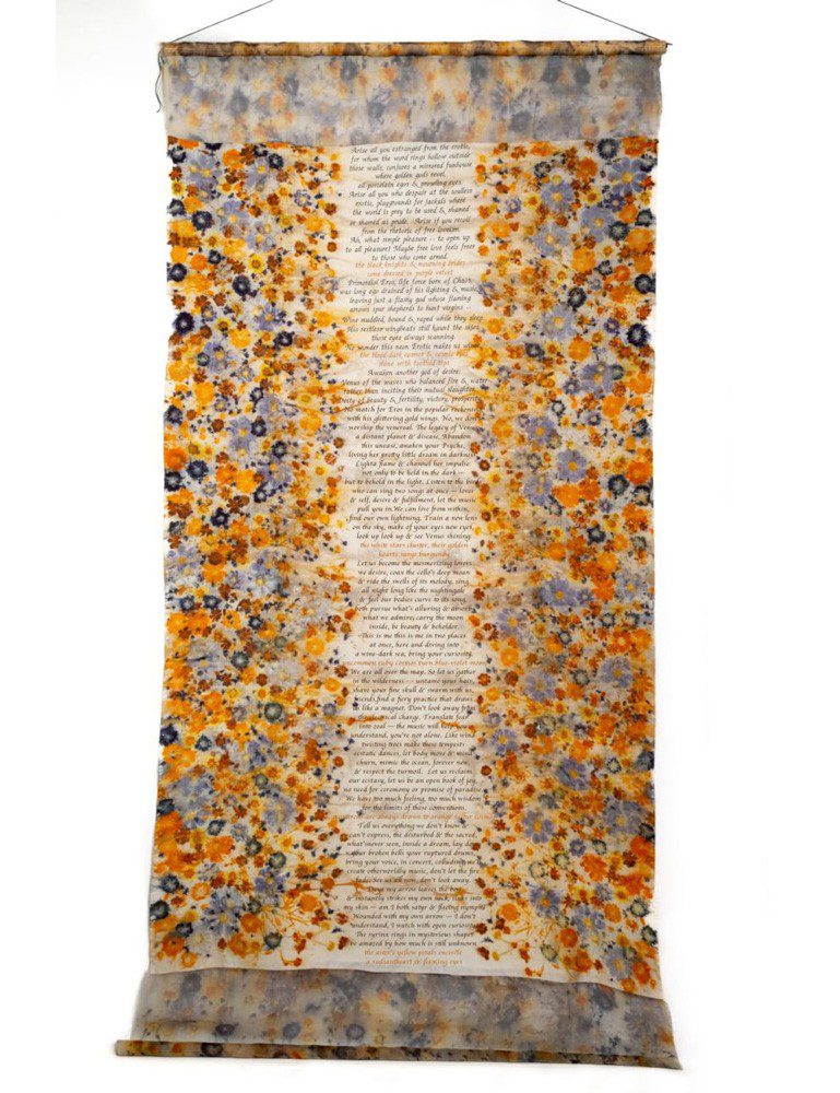 Poet Olivia Sears and artist Samuel Spurrier will be showing a piece created specifically for this exhibition. One part is presented as a banner that expresses the erotic as an unfurling, creating a psychic space of celebration that also envelops and protects. The poem and the silk banner become a magic carpet to soar above oppressive forces that inhibit and arrest the fluid nature of the soul. Eros is not only an ecstasy of the flesh, but also the joy of a soul and intellect, free to explore and articulate the contours of one’s life.