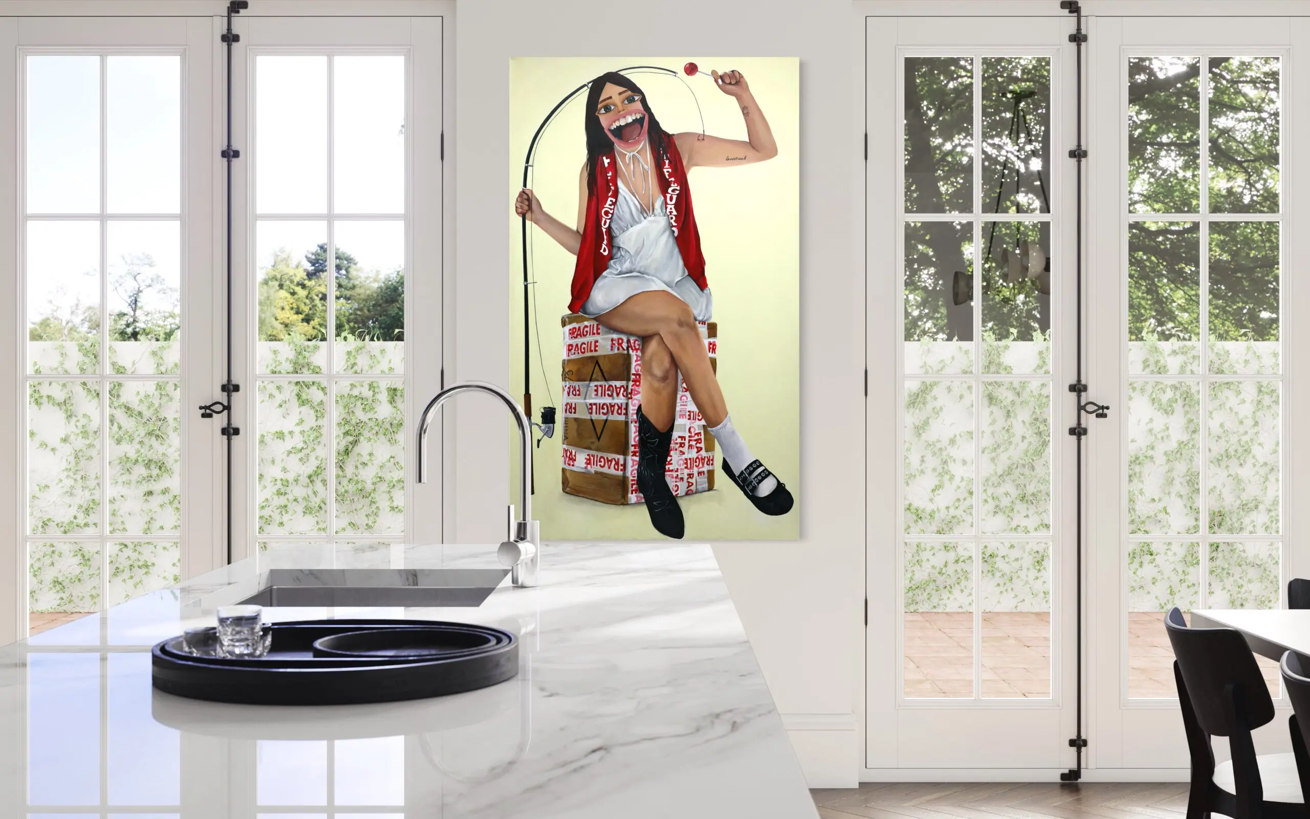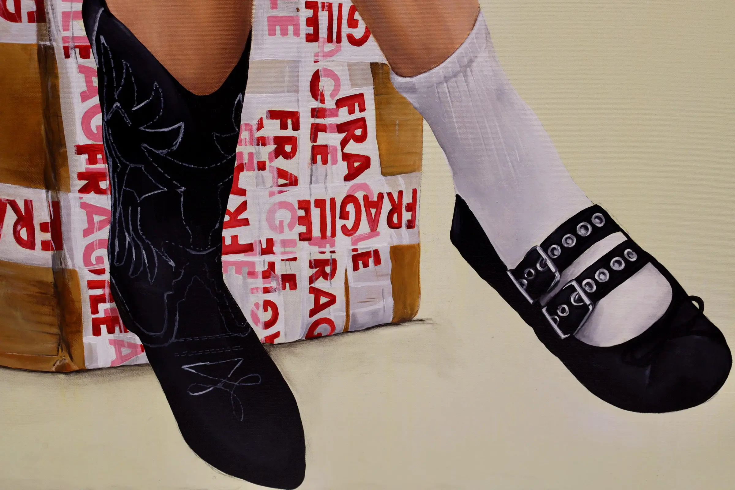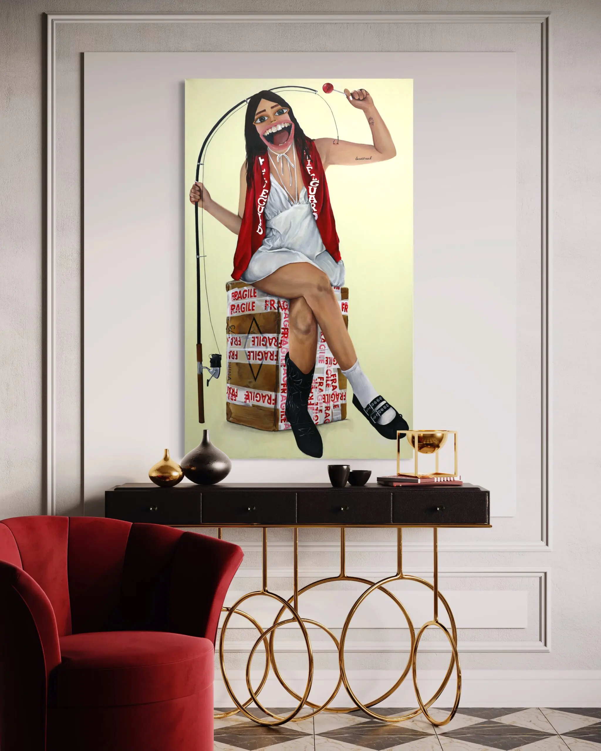 In Eva Carzul’s painting, “Unstable Affection,” a comedic portrayal unfolds, vividly illustrating the visual representation of emotional fragility and instability. Perched atop a box adorned with cautionary tape proclaiming “Fragile,” the figure dons mismatched shoes and, in a comical twist, manages to ensnare herself with her own fishing line. The true essence of instability emanates from the exaggerated facial features, evoking a palpable sense of unease in the viewer.
