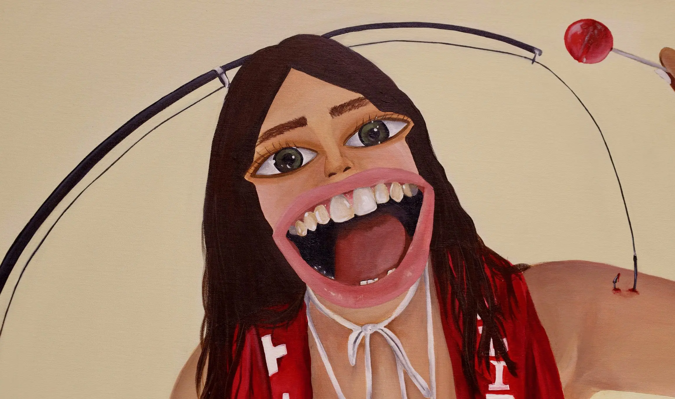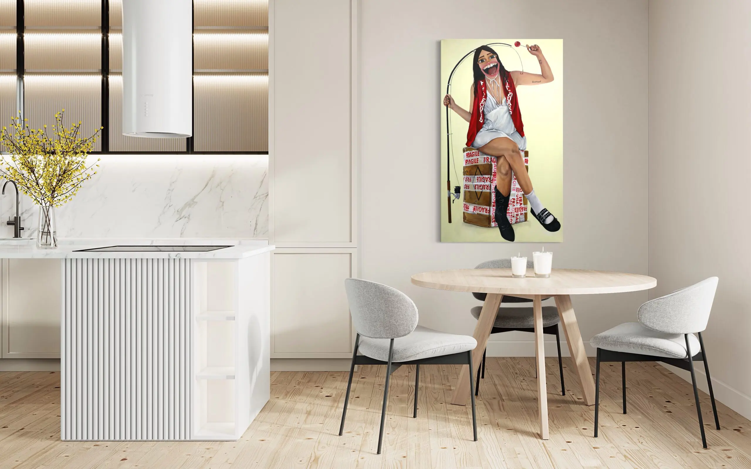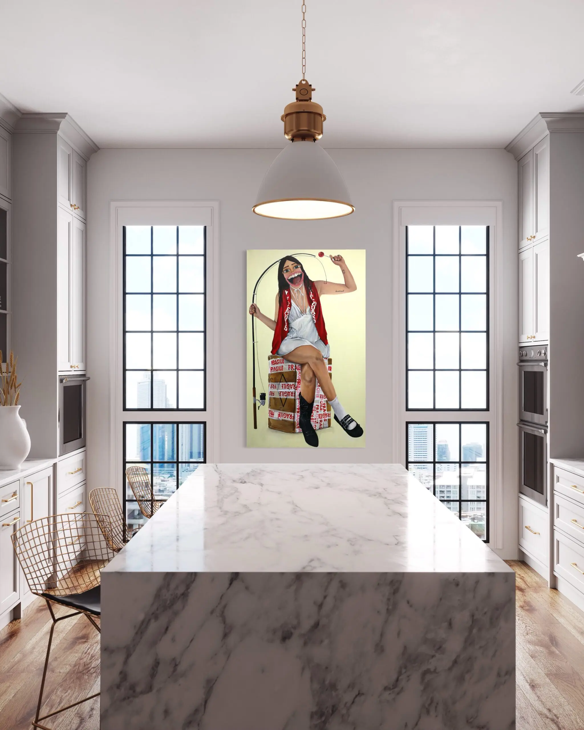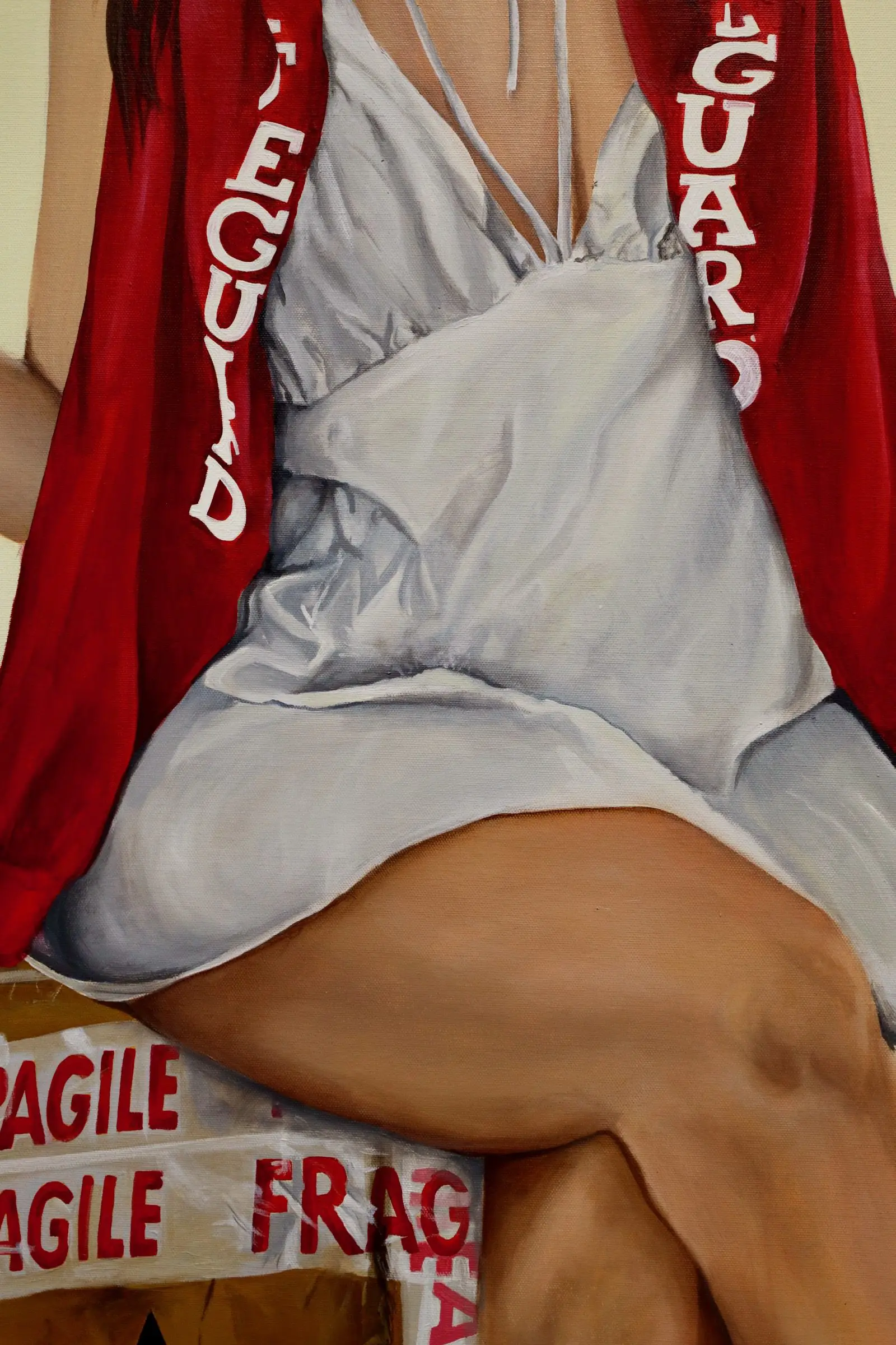 In Eva Carzul’s painting, “Unstable Affection,” a comedic portrayal unfolds, vividly illustrating the visual representation of emotional fragility and instability. Perched atop a box adorned with cautionary tape proclaiming “Fragile,” the figure dons mismatched shoes and, in a comical twist, manages to ensnare herself with her own fishing line. The true essence of instability emanates from the exaggerated facial features, evoking a palpable sense of unease in the viewer.