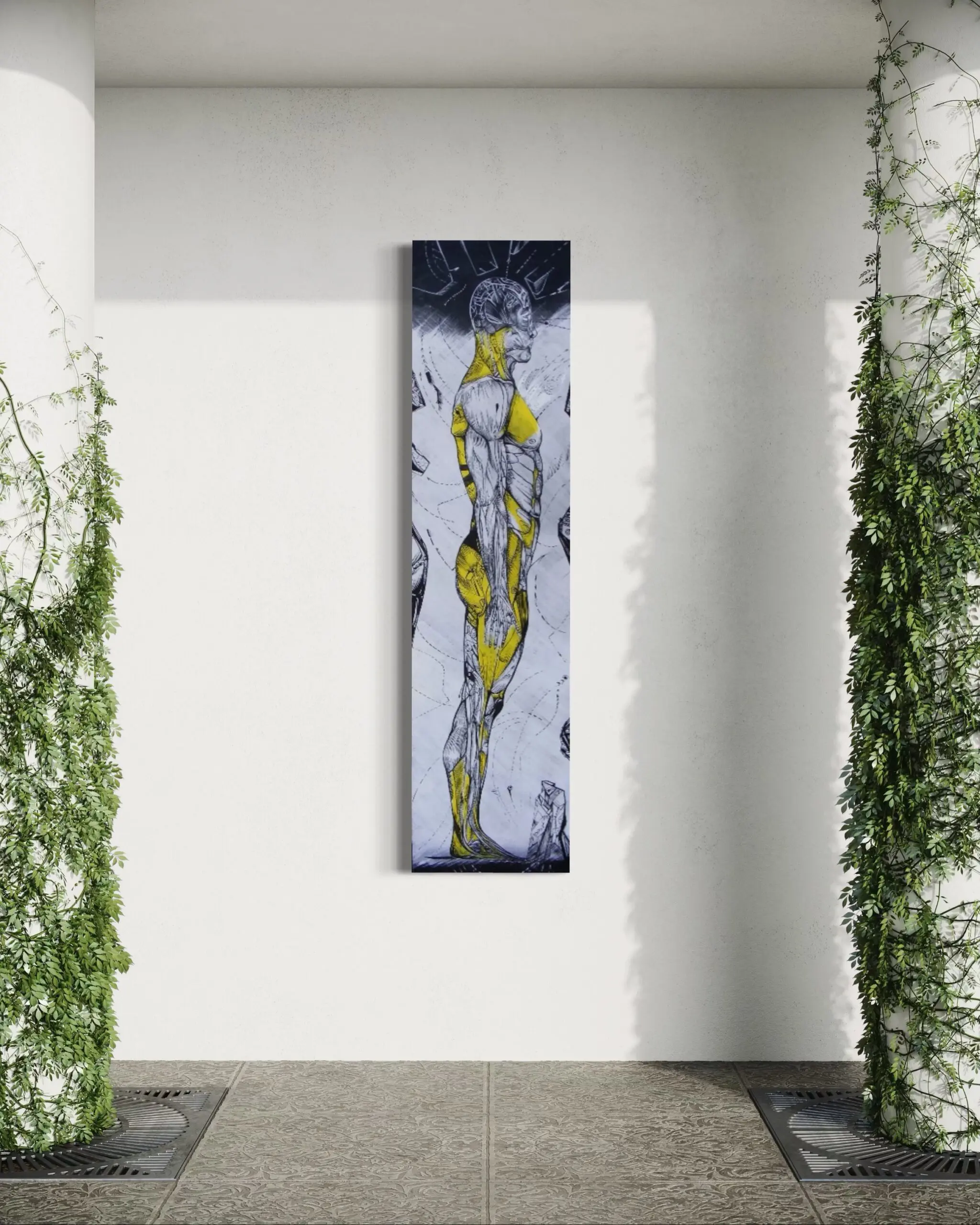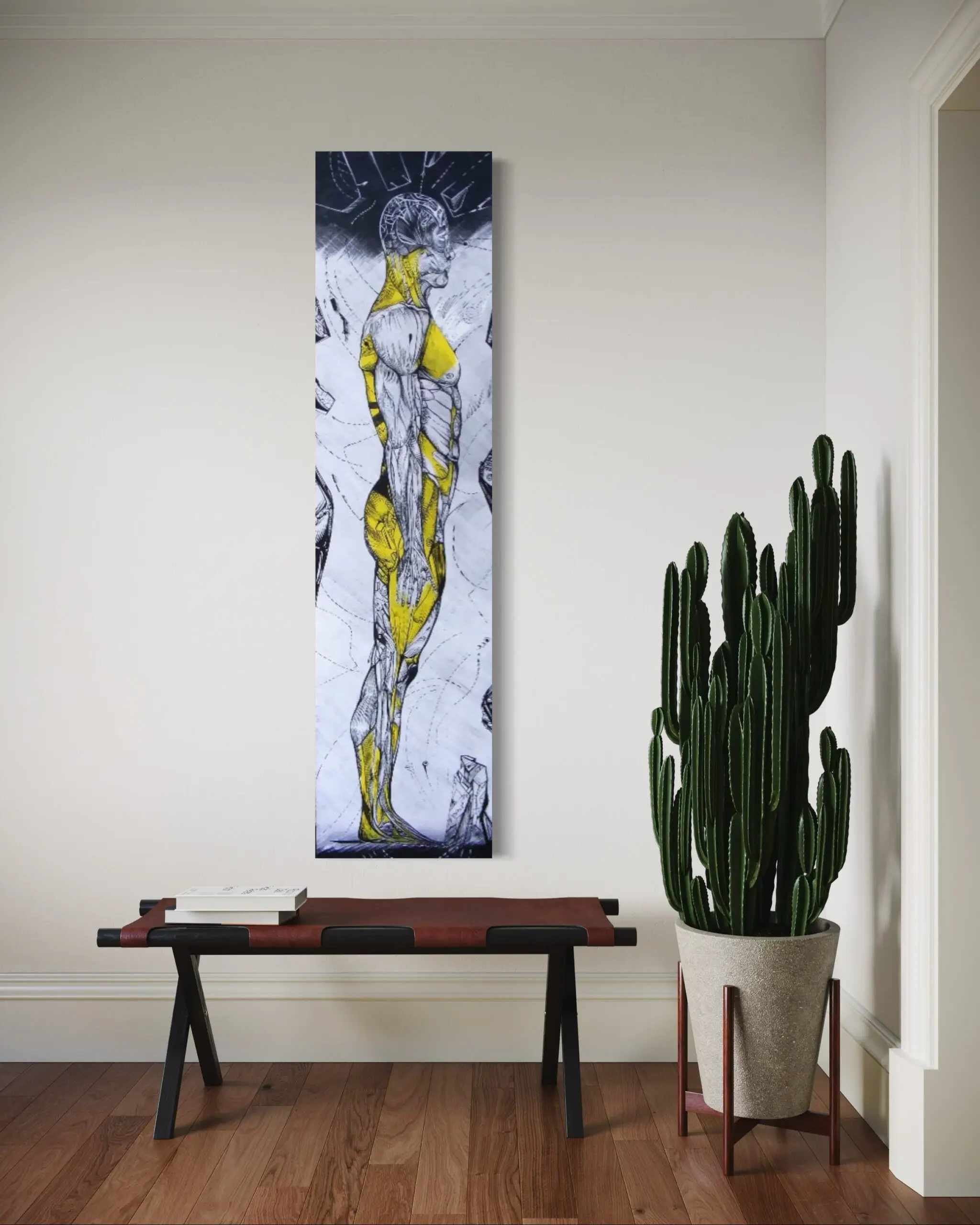 Deeply engaged in universal themes that draw from ancient history this work focuses on human anatomy as a timeless object. It’s an exploration of realistic form in an abstracted environment where seemingly opposing forces converge as he freely connects various lines.