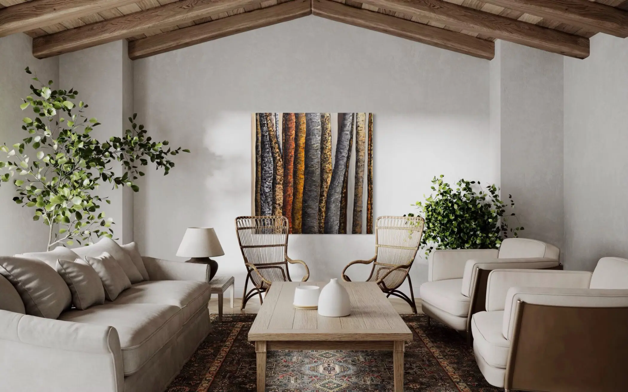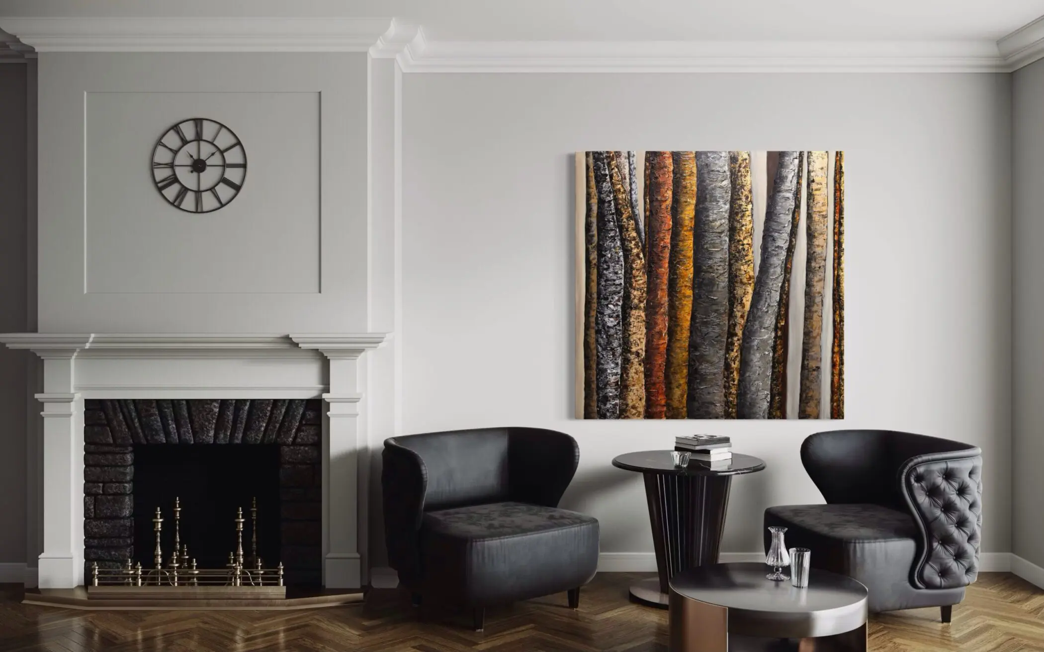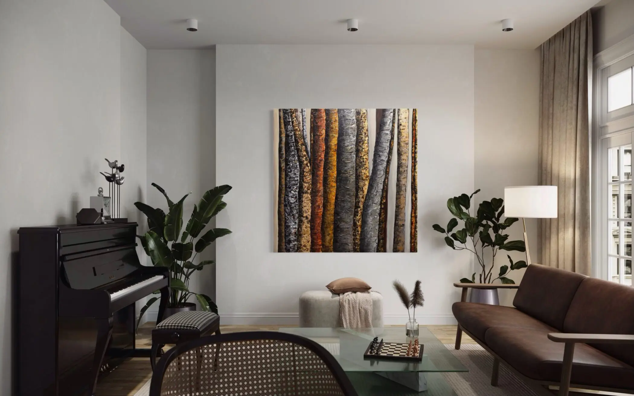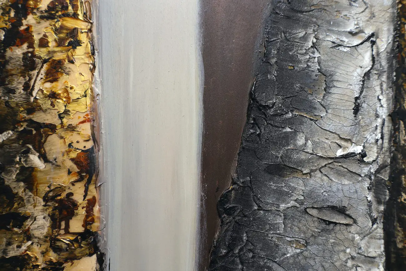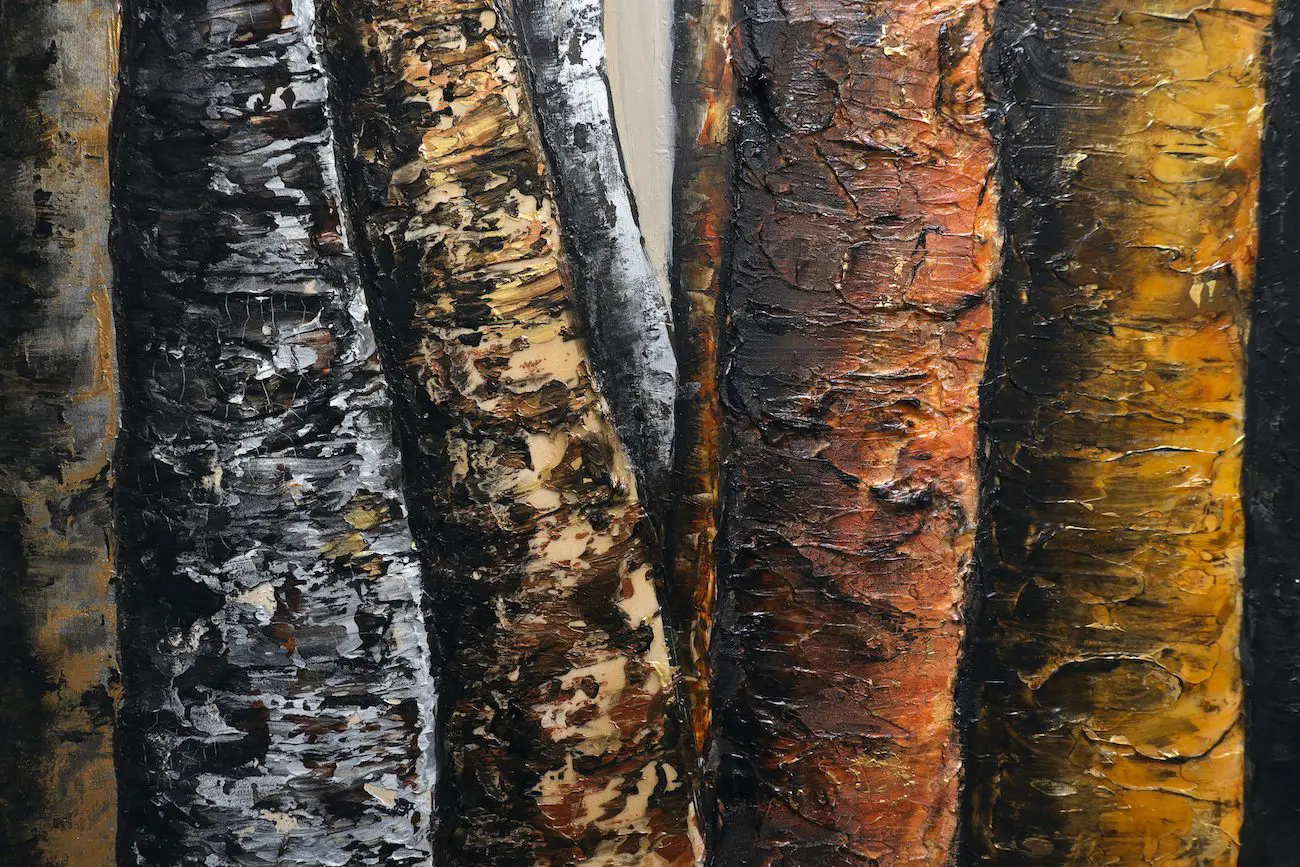 Haleh Mashian’s “Veils of Nature” distills the forest to its fundamental elements—texture, depth, and quiet resilience. Earthy charcoals, bronzes, and ochres form a restrained palette, lending the piece a sense of timelessness.  Vertical forms dominate the composition, with towering tree trunks rising like sentinels. Each surface tells a different story—some rough and scarred, others smooth and polished—creating a striking contrast that feels both organic and sculptural.