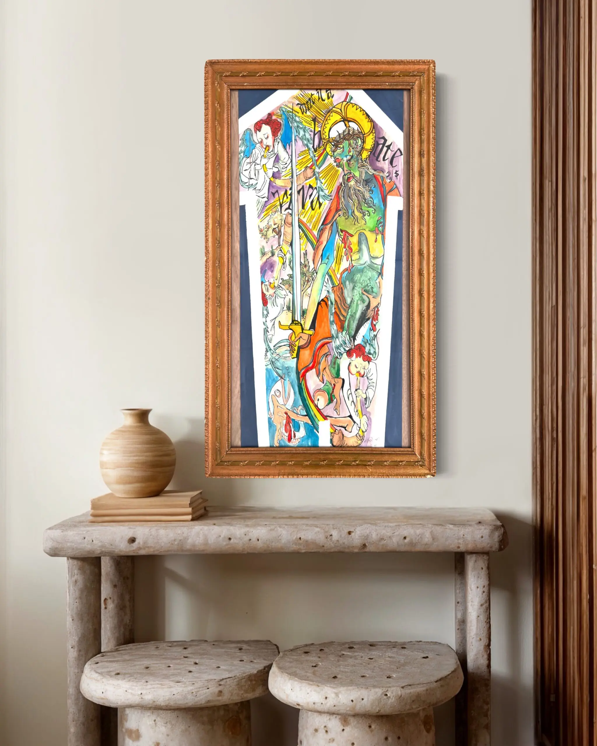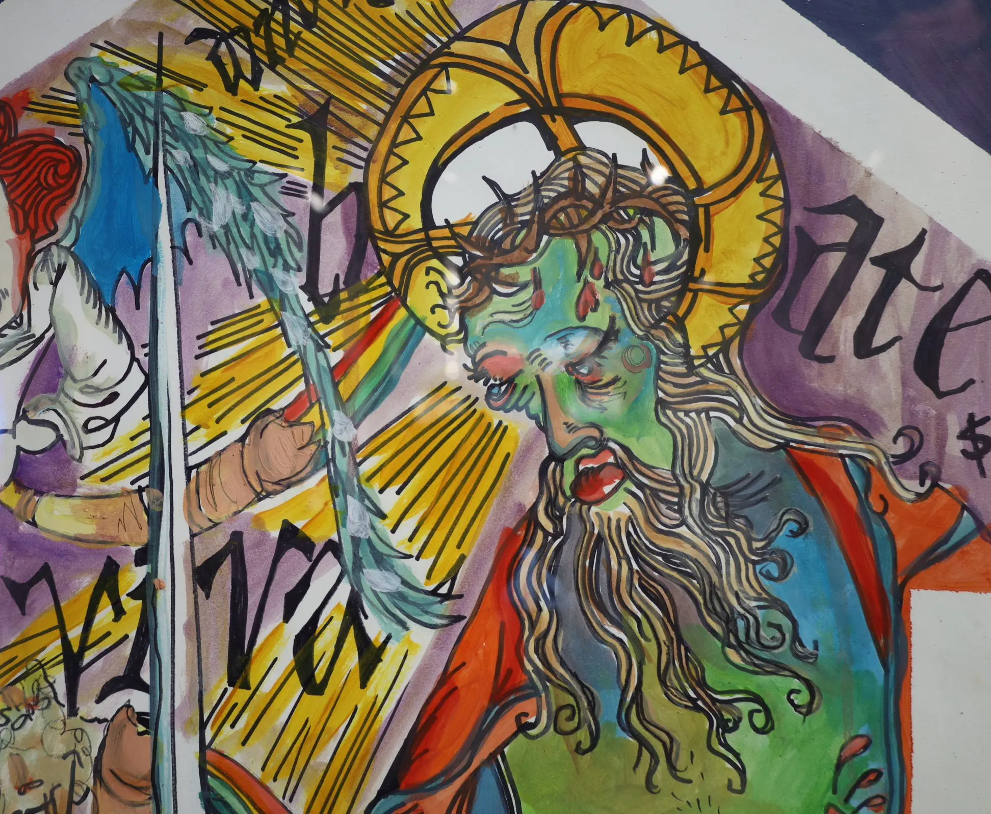 A close friend commissioned Sheppard to cover up an old tattoo in the middle of his back that read “VIVA HATE.” Seeking inspiration, he turned to The Book of Hours once again. In the new design, God was depicted with more godly endowments, and angels were shown trumpeting rainbows. Sheppard pondered whether God, as Nietzsche suggested, had died, or instead had transformed like a butterfly to meet contemporary needs and desires. This transformation, he mused, is the hoped-for metamorphosis for all.