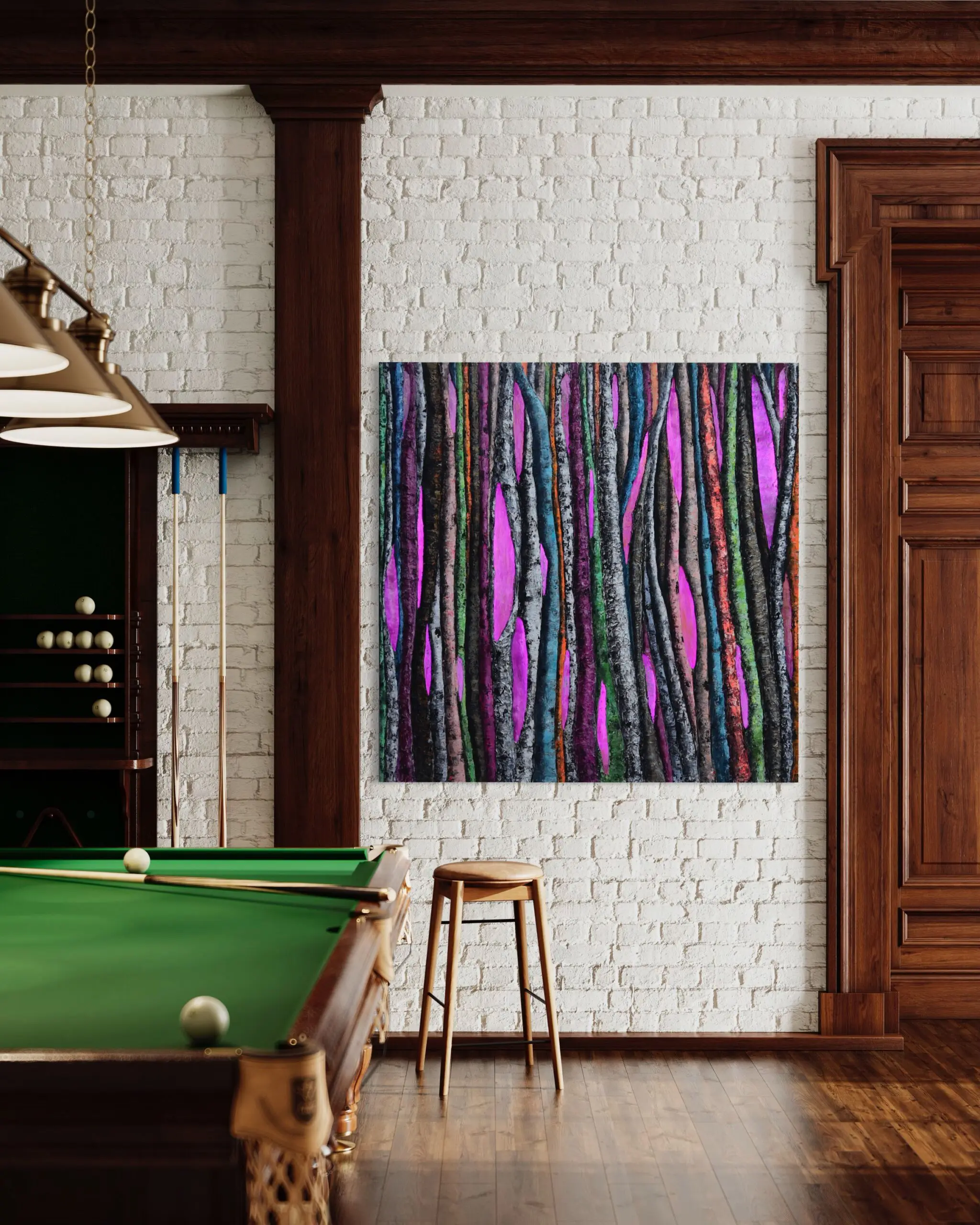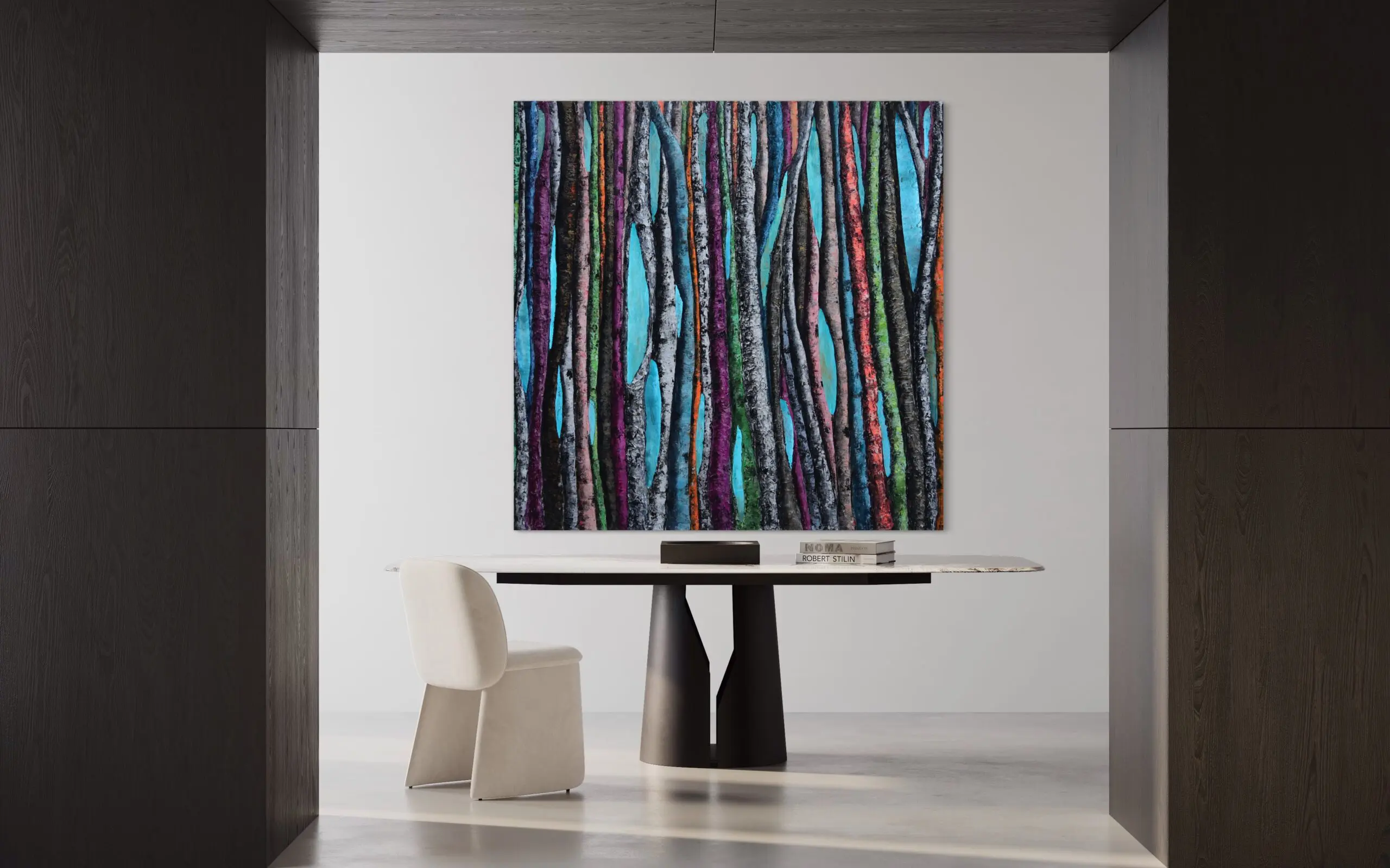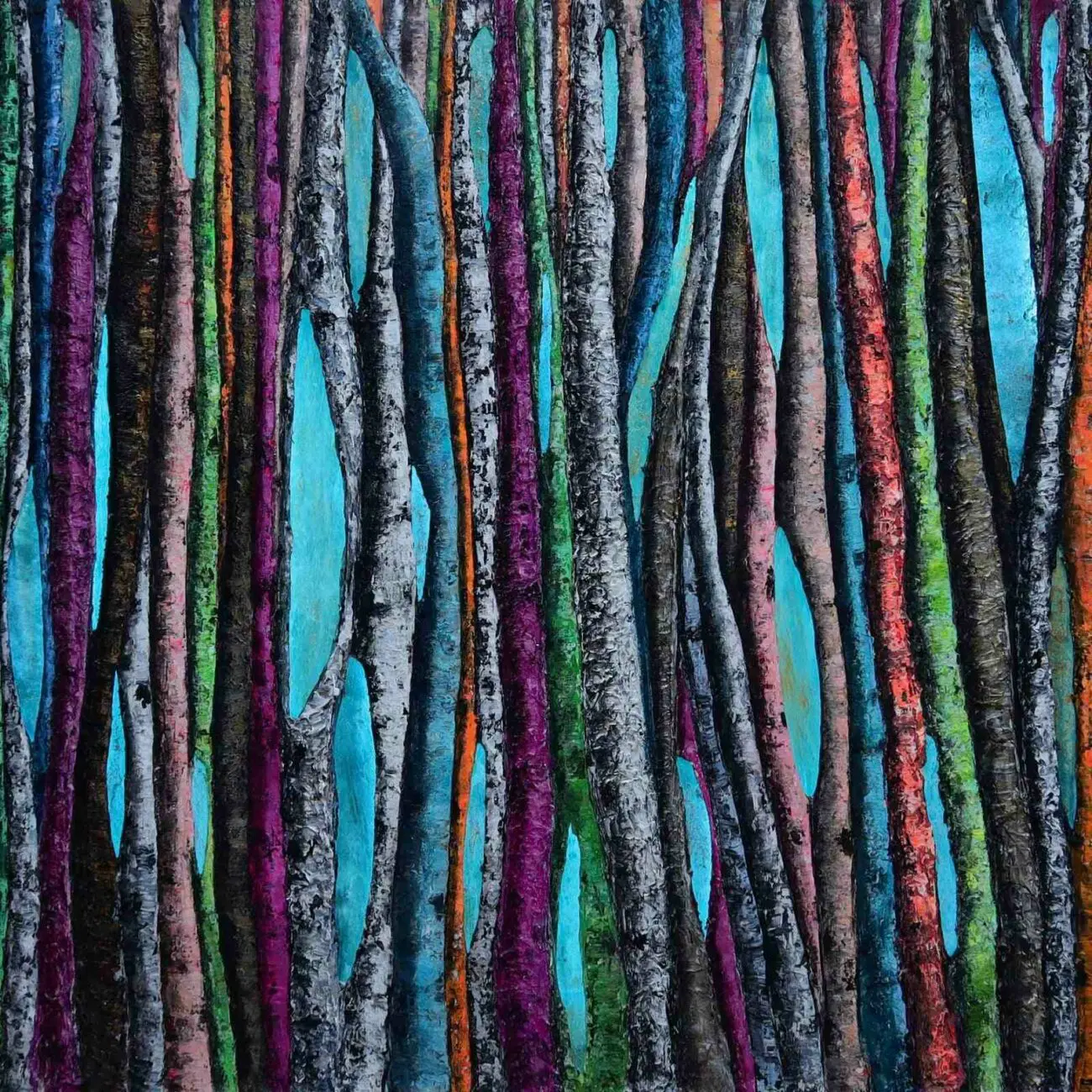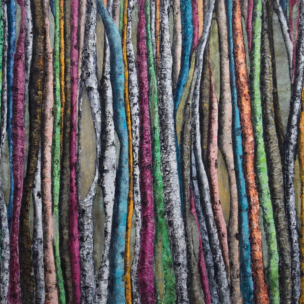Haleh Mashian’s “Vivace” brings the forest to life with an explosion of color and texture. Vertical tree trunks in shades of magenta, turquoise, gold, and deep green create a rhythmic composition that feels both dynamic and immersive. The rich contrast between the traditional black-and-white birch bark and the unexpected pops of color adds a sense of vibrancy, making the scene pulse with energy.