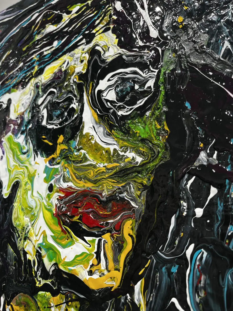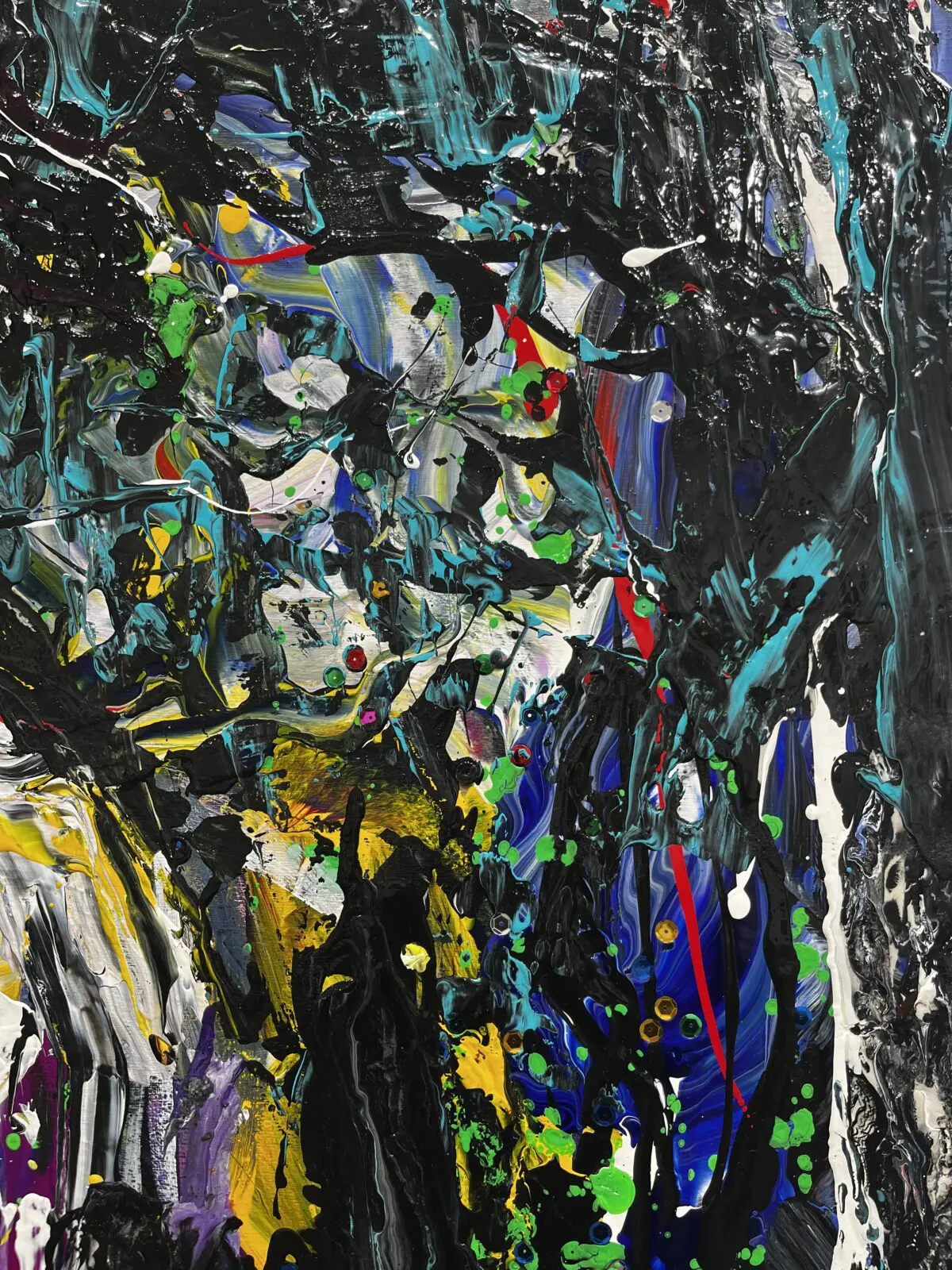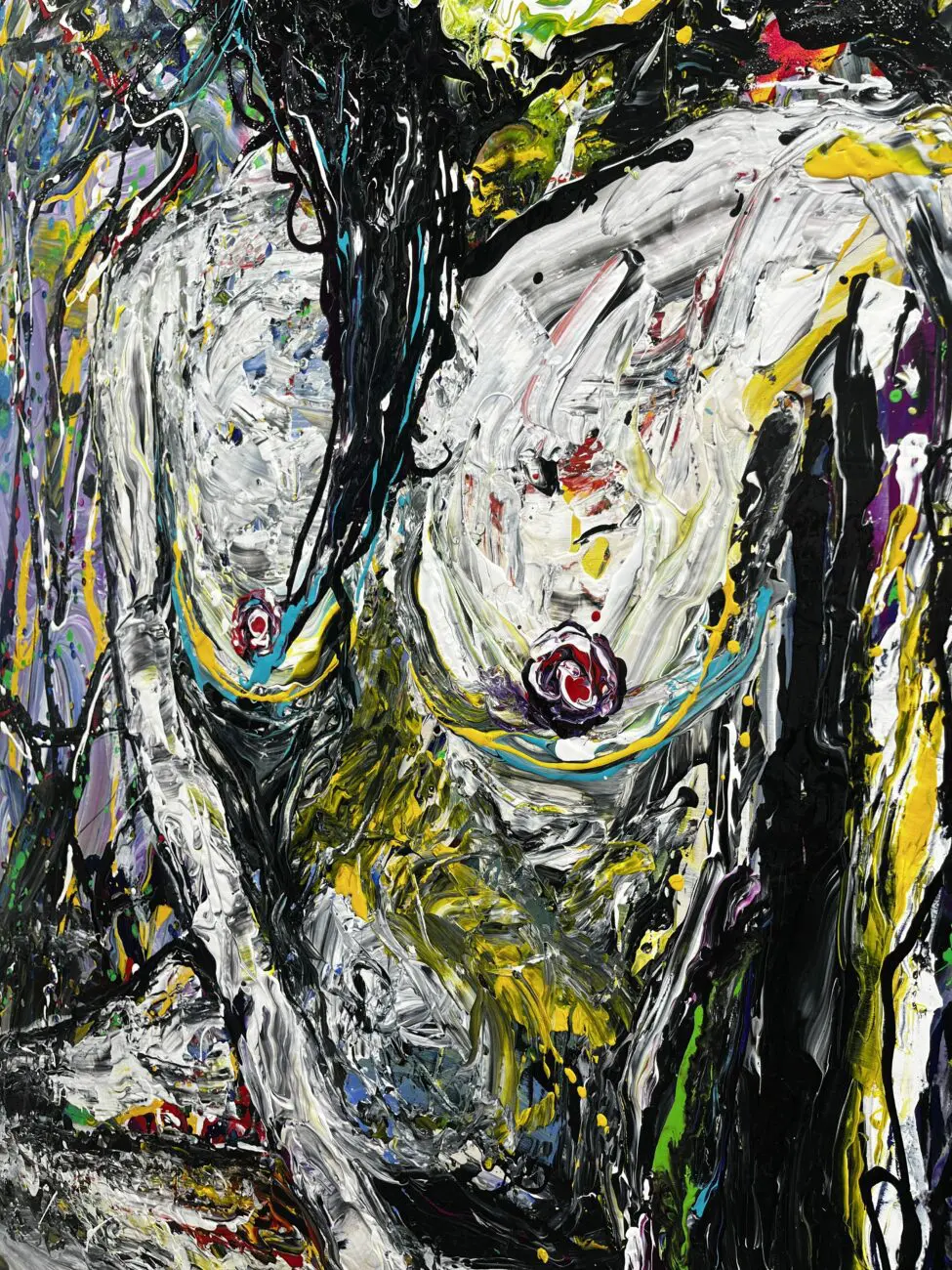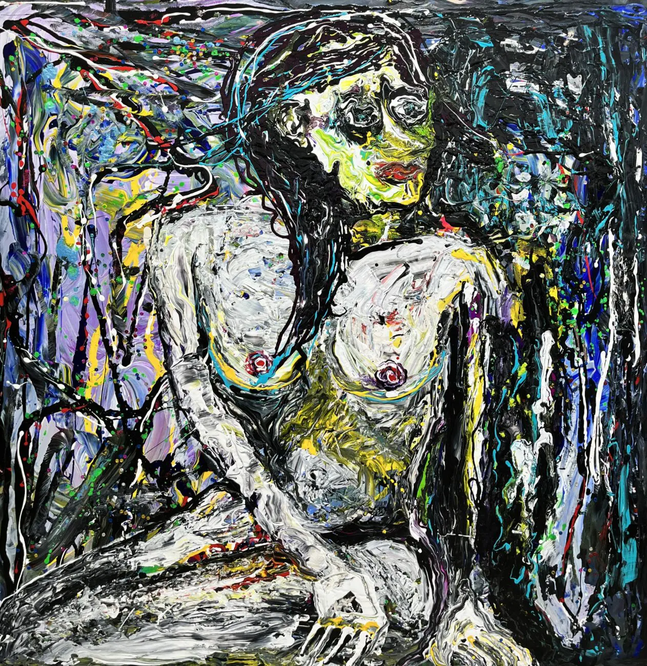 Mashian fused a ghost-like human figure sitting at the edge of a night sky, looking through a hypnotic gaze at the mystery of what is out there. In this mixed media piece on wood panel, the bold use of brush strokes and jewel-like tones invite the viewer into a realm of galactic fantasy where an explosion of light and color is taking place.