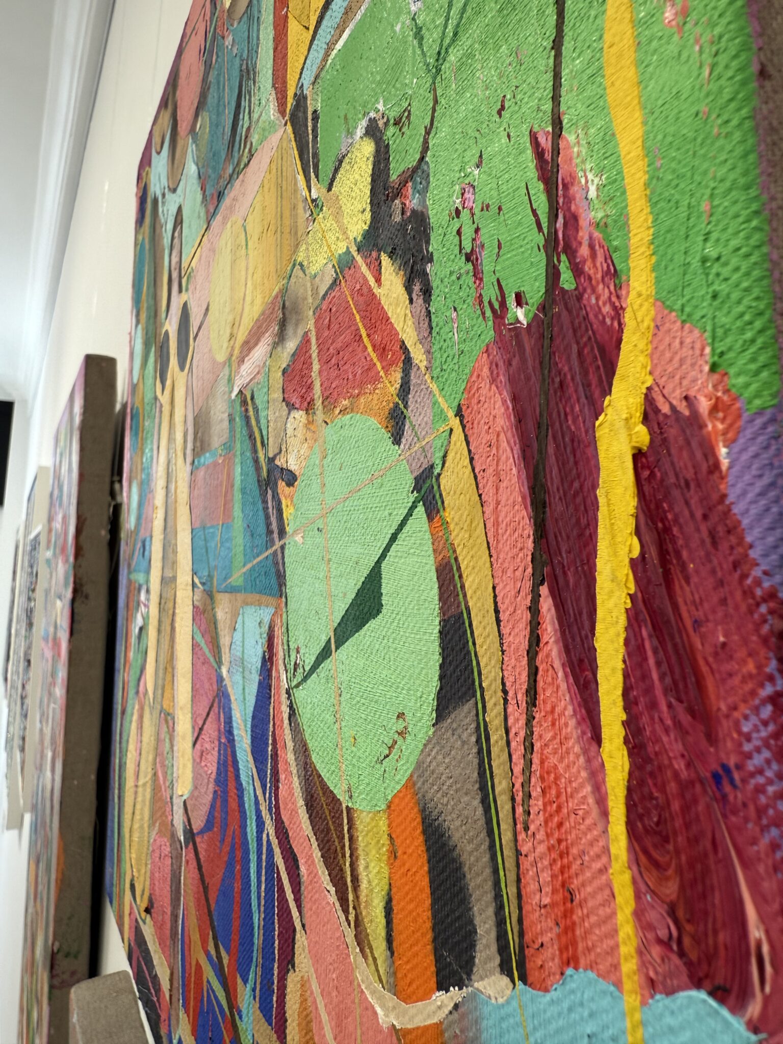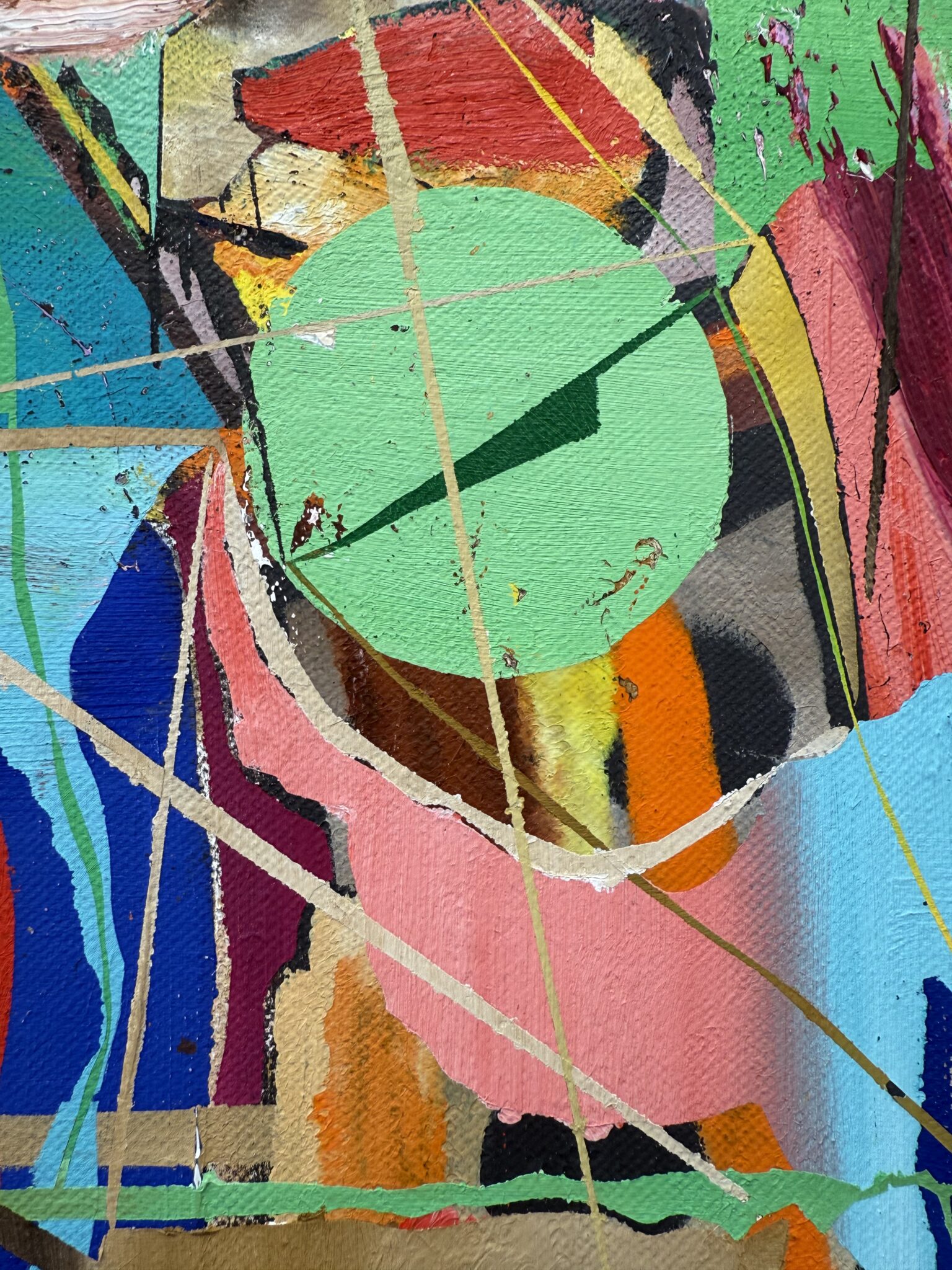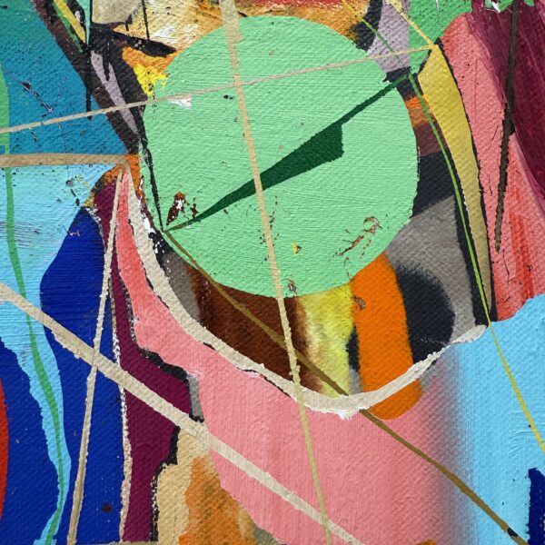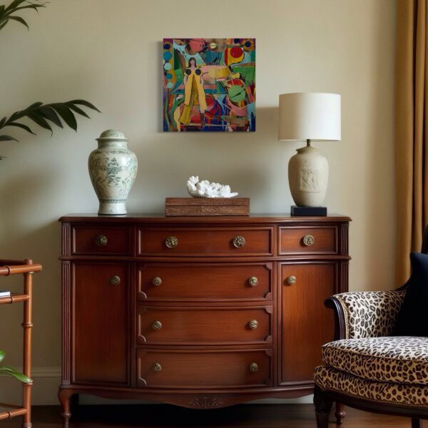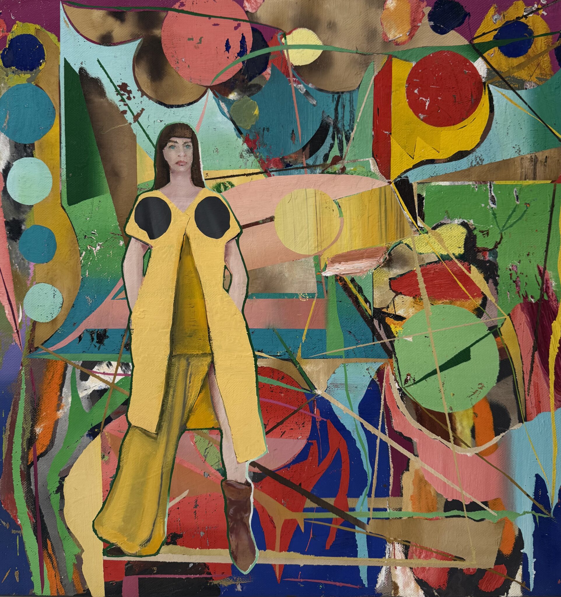 The energy of the painting is electric yet artfully balanced. The visual chaos of patterns and texture—swirling, layered brushwork—resolves into a cohesive harmony, making the piece feel exciting rather than overwhelming. The fashion-forward figure grounds the composition, delivering both style and narrative amid the vibrant collage of abstract forms.