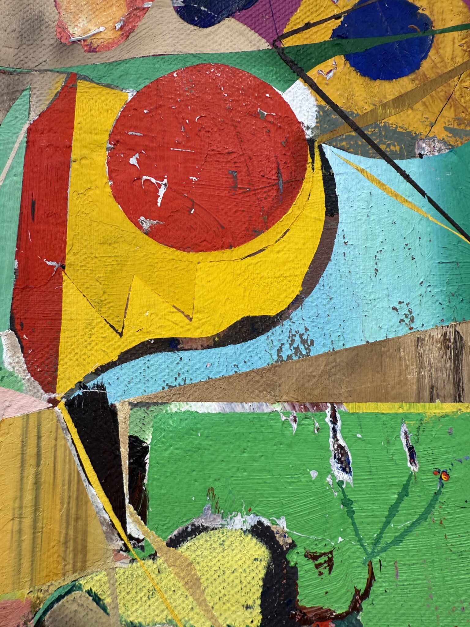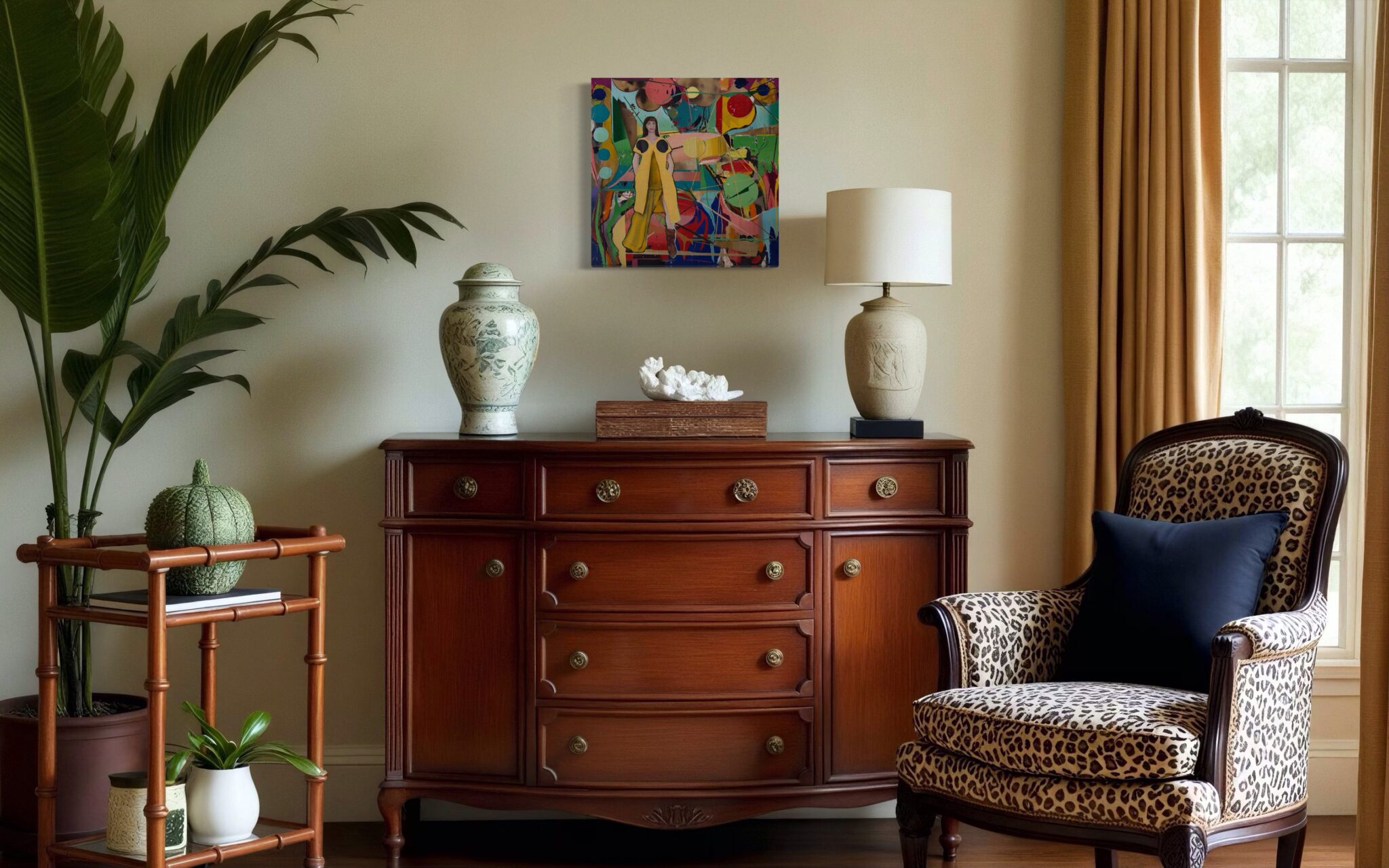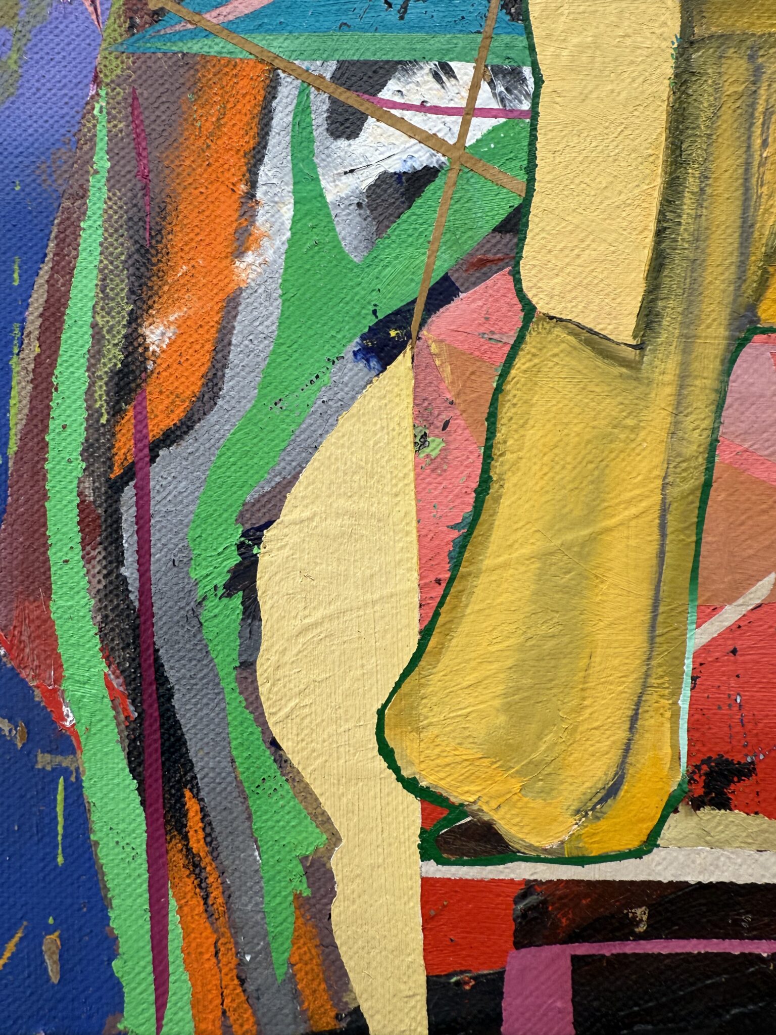The energy of the painting is electric yet artfully balanced. The visual chaos of patterns and texture—swirling, layered brushwork—resolves into a cohesive harmony, making the piece feel exciting rather than overwhelming. The fashion-forward figure grounds the composition, delivering both style and narrative amid the vibrant collage of abstract forms.