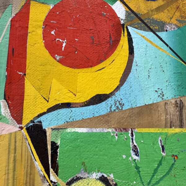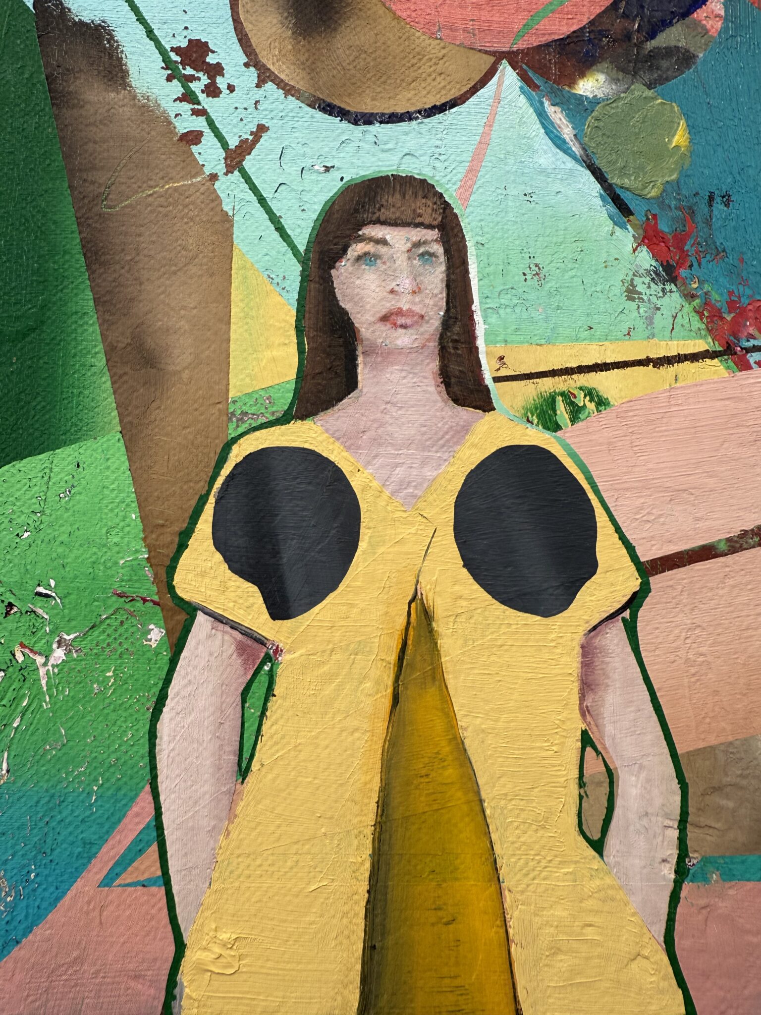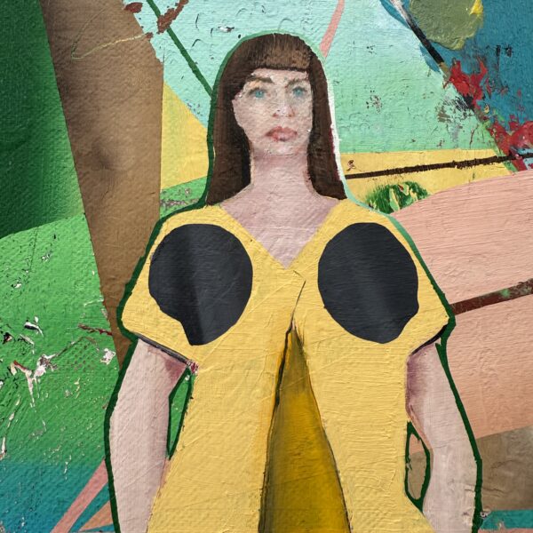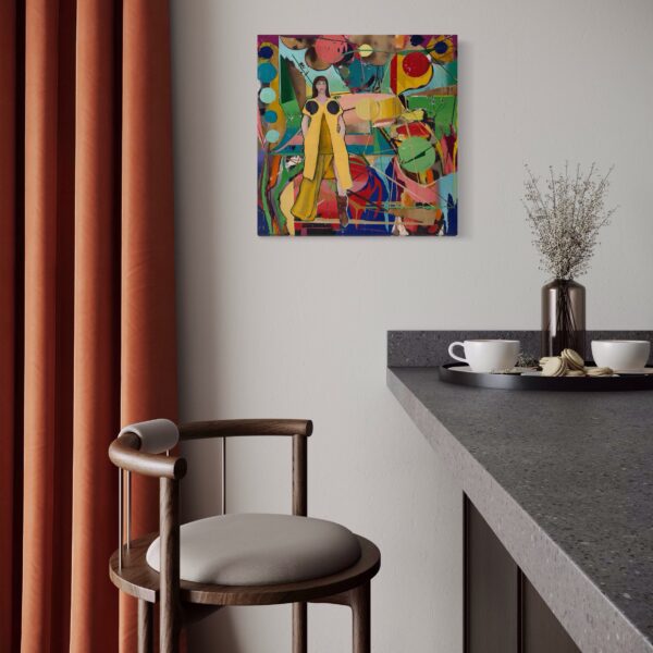 “Wearing Rick Owens in West Hollywood” by Justin Price fuses high-fashion elegance with vibrant urban abstraction. At its core, a confident woman steps forward in a runway-ready yellow Rick Owens outfit. This striking figure floats above a spirited backdrop of color blocks, polka dots, bold lines, and geometric shapes—all rendered in vivid shades of yellow, green, teal, blue, peach, pink, purple, and red.