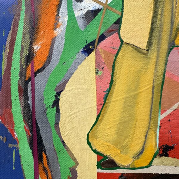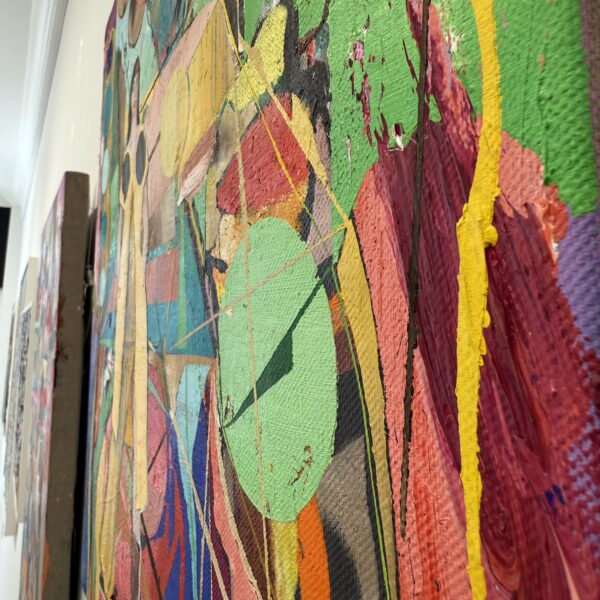 There’s an intentional harmony between the figure and her surroundings—the abstract background isn’t just a burst of color and form, it echoes the tactile quality of Rick Owens’s signature fabrics. The relationship between figure and background adds an additional layer of meaning. The layered textures, geometric breaks, and flowing patterns parallel the way Owens’s garments move, fold, and hold shape, creating a subtle but intentional connection between the high-fashion subject and the expressive environment she inhabits. This dialogue between art and design ties the piece to Owens’s Los Angeles roots, where his career began and where urban grit and luxury style often share the same space.The layered textures, geometric breaks, and fluid patterns mirror the drape, movement, and structural edge of his garments, creating a visual bridge between the high-fashion subject and the expressive canvas that surrounds her. This connection grounds the piece in both art and design, making “Wearing Rick Owens in West Hollywood” as much a nod to Owens’s Los Angeles legacy as it is a celebration of Justin Price’s mastery of color, texture, and compositional balance.