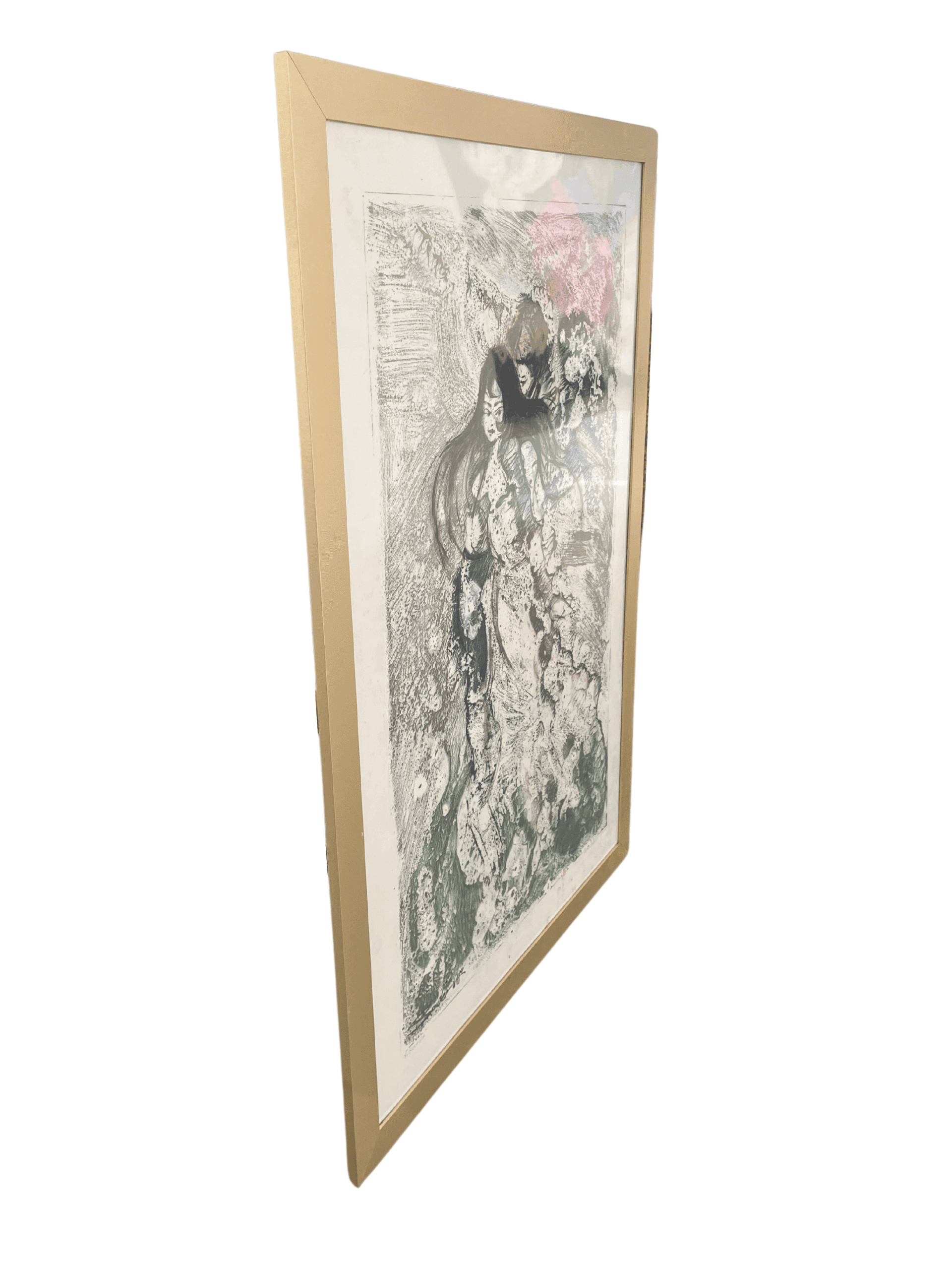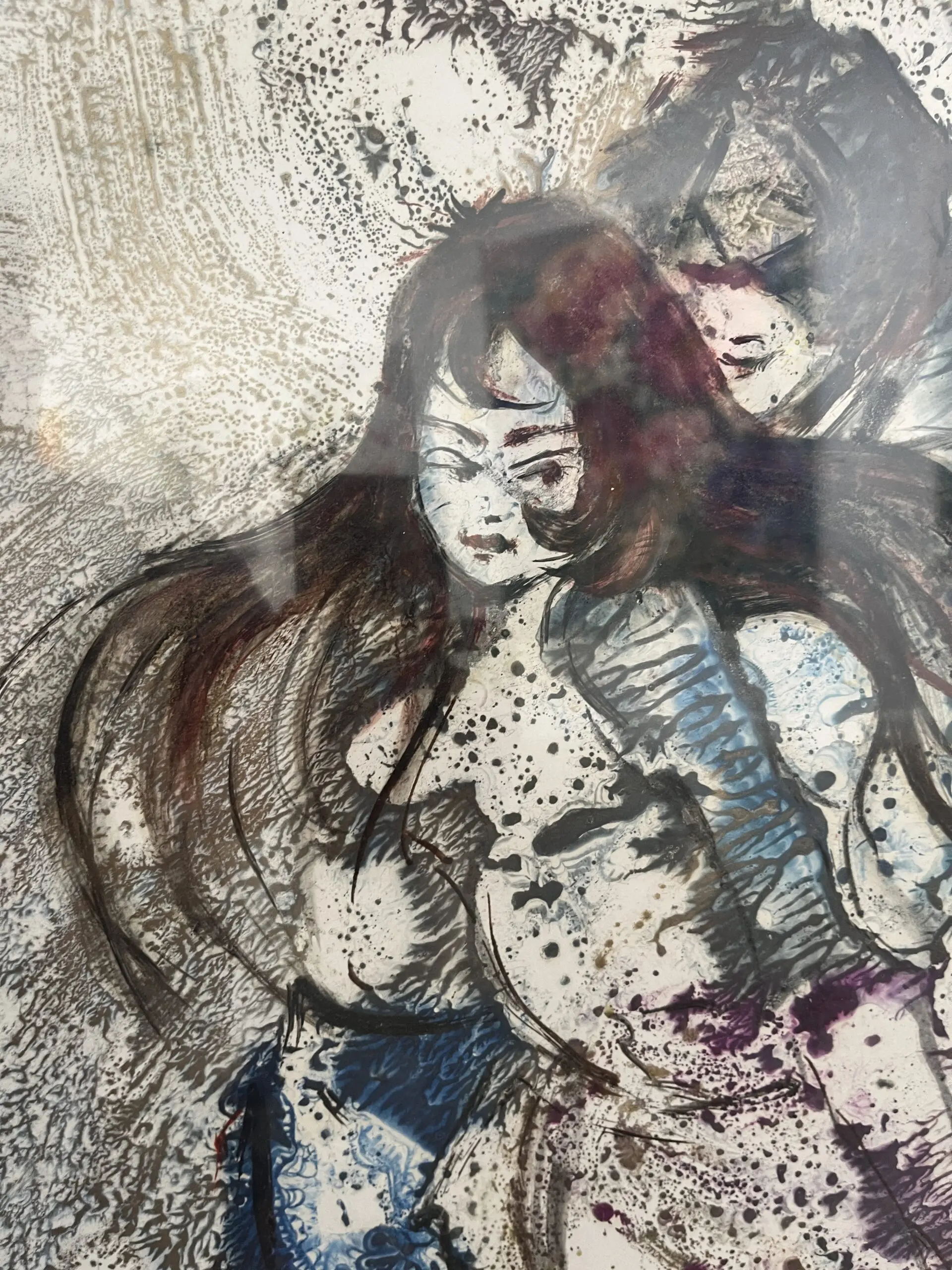 “Whispers of Desire” is an Intimate dance of sensuality and tenderness. It captures a moment of intense where a man tenderly holds a woman from behind, their bodies entwined in a passionate embrace. With his face hidden, he leans in close to whisper something in her ear, creating an aura of secrecy and intimacy. The woman’s hair cascades freely, adding a sense of movement and wild sensuality to the scene. Every curve and contour of their figures speaks of their profound connection, while the gentle sway of their embrace evokes a feeling of tranquility and vulnerability.